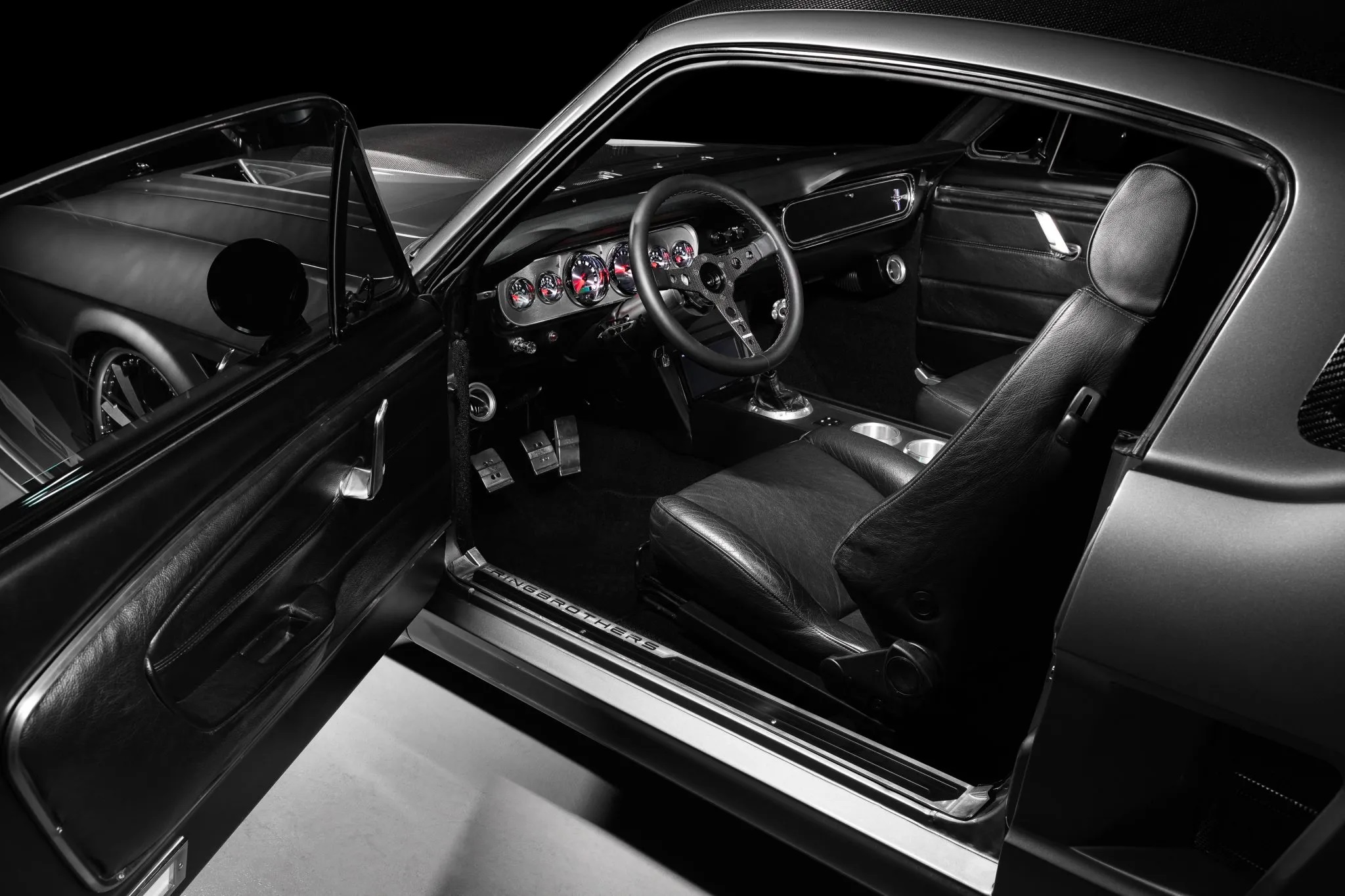 Rolling on custom Ringbrothers Forgeline wheels wrapped in Dunlop SP Sport Maxx tires, this Mustang boasts more than just eye-catching aesthetics. Its Baer brake system with 13-inch slotted and cross-drilled rotors ensures precise stopping power, while Integra Racing coilover shocks guarantee a thrilling ride.