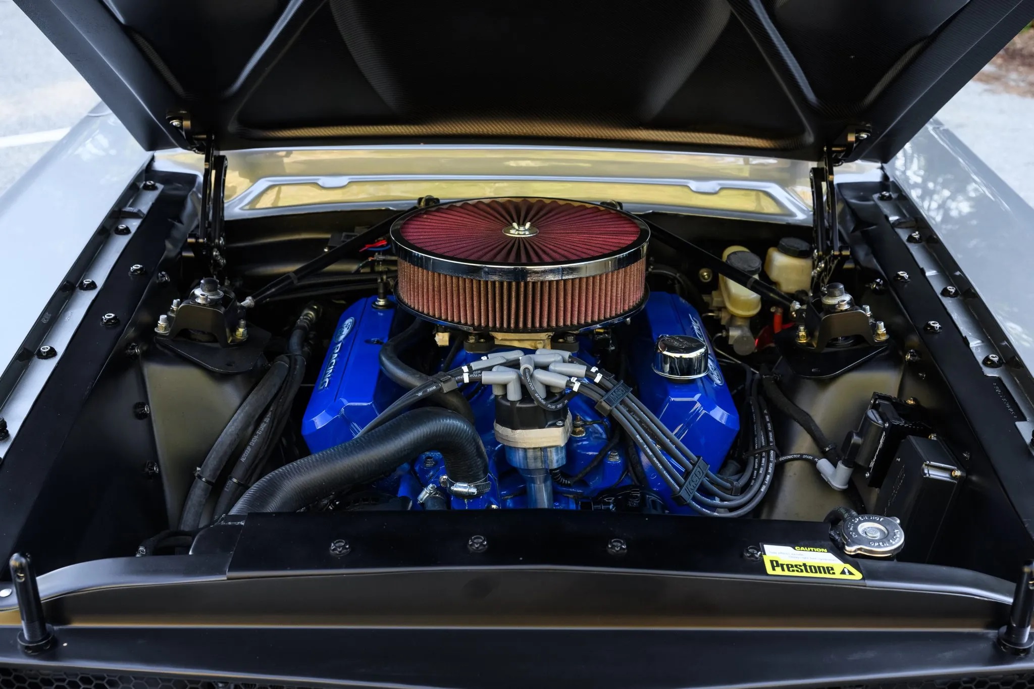 Beneath the hood lies a rebuilt 408ci Windsor V8, featuring aluminum cylinder heads, an Edelbrock intake manifold, and an 800-Cfm Holley double-pumper carburetor, harmonizing with a Flowmaster exhaust system and a Tremec TKO-600 five-speed manual transmission. Additional modifications include carbon fiber elements, discreet spoilers, and hood-mounted LED turn signal bezels.
