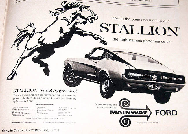 The special edition Stallion Mustang was built for promotional reasons for the Mainway Ford Dealership, based out of Toronto Canada. During the middle of 1967, the dealership placed advertisements, such as the one below, in Canadian car magazines. The Stallion special was exclusively sold by Mainway Ford, and came standard with the 320hp 390cu engine, in GT-version. Optional engines for the Stallion were a 410 horsepower 390cu and a 550hp 427 engine. Some are believed to also be built with a 289 Hi-PO engine.
