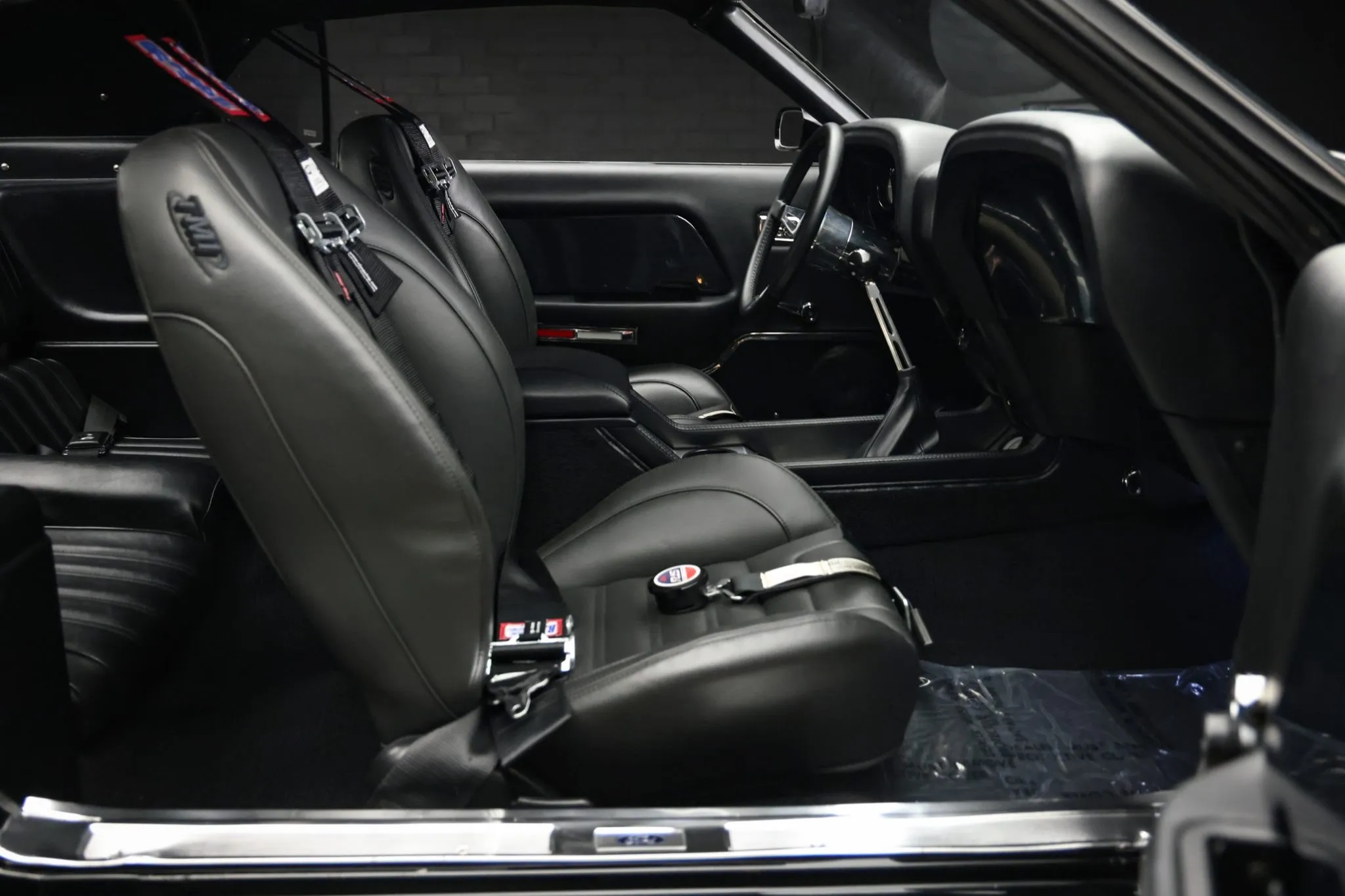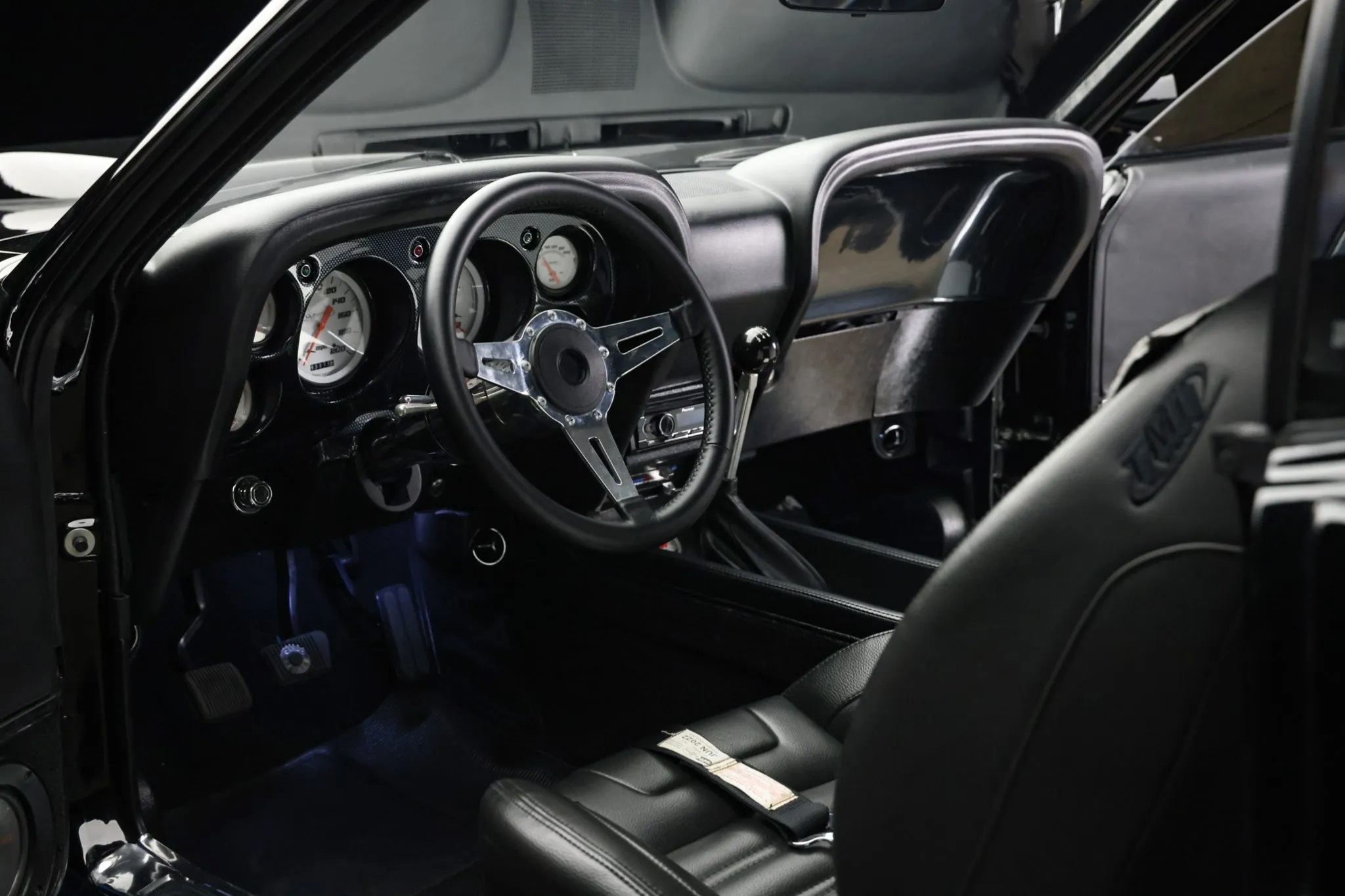 The interior boasts a black finish with TMI leather bucket seats, a custom center console, RJS harnesses, air conditioning, a premium sound system linked to a Pioneer CD stereo, a Lecarra aluminum steering wheel, and custom Classic Recreations gauges.