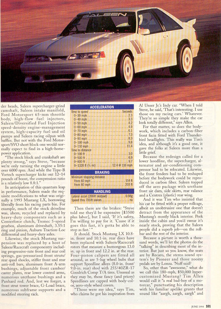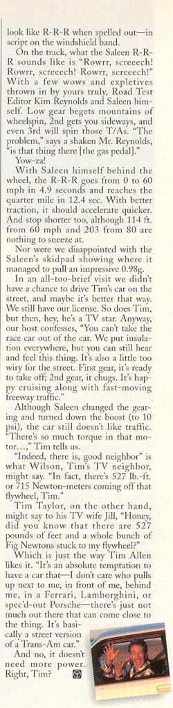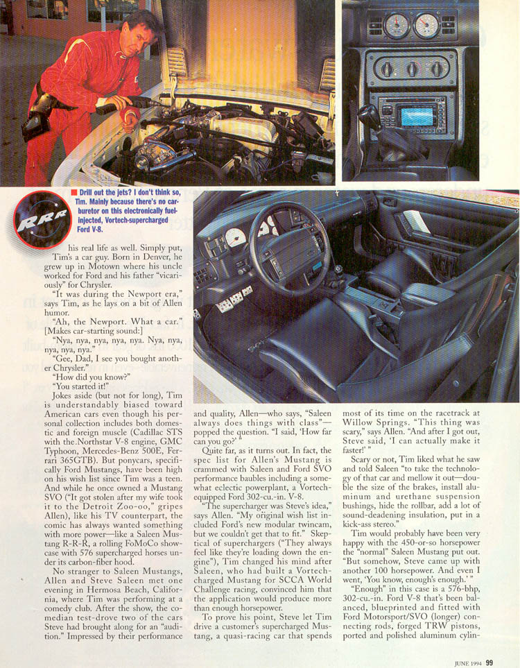 You can now own this one-of-a-kind Saleen Mustang RRR as its up for sale over at hemmings.com for $85,000.  The current owner purchased the Mustang in 1997 and its presumable when Tim Allen sold the car.  Check out all the photos below including a Road and Track article on Tim Allen and his custom built Saleen RRR Mustang.