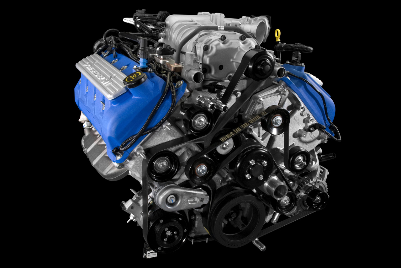 The 2011 Ford Shelby GT500 will feature an all-new aluminum-block 5.4-liter supercharged V-8 engine that produces 550 horsepower and 510 ft.-lb. of torque. The new aluminum block engine will be 102 pounds lighter than the previous iron block helping it deliver better power-to-weight ratio, improved fuel economy, acceleration and handling.