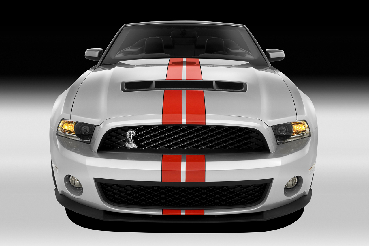 The Shelby GT500 convertible model features enhanced structural rigidity, with lateral stiffness improved by 12 percent versus the 2010 model. The V-brace has been stiffened by adding gussets. The secondary crossmember also has been stiffened, while a front Z-brace has been added, connecting primary and secondary crossmembers. A-pillar stiffening foam has been added to increase rigidity.