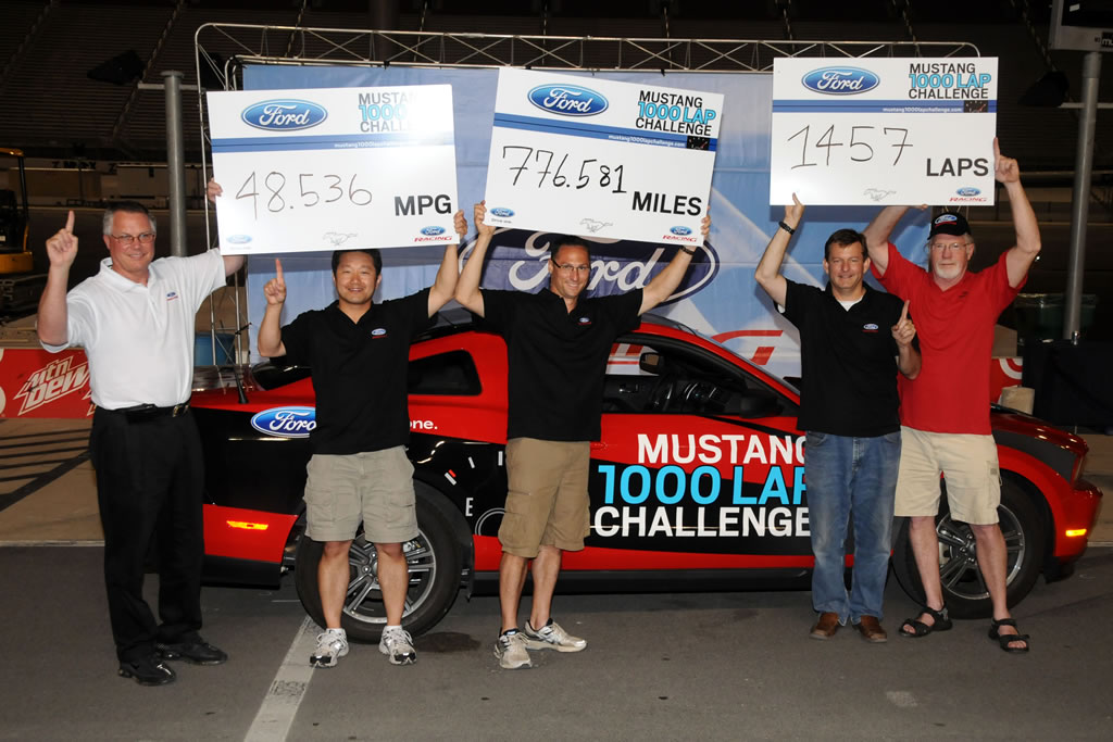 The Mustang 1,000 Lap Challenge has been completed with the 2011 Mustang V-6 going 1,457 laps around Bristol Motor Speedway’s .533 mile track. The completely stock and unmodified 2011 Mustang V-6 averaged 48.5 miles per gallon while driving an average speed of 43.9 miles per hour using the Mustangs 16 gallon fuel tank. Driving the Mustang was a team of five drivers including four Ford Mustang engineers and David Ragan, NASCAR driver of the No. 6 UPS Ford Fusion.