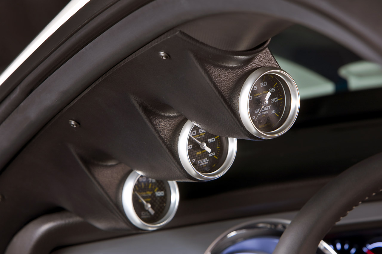 The suspension was upgraded with new Ford Racing springs, struts, sway bars and adjustable caster/camber plates. The car also receives a new front fascia, tail light trim, front splitter, rear deck lid filler panel and rear fascia. Functional scoops are located on the side rockers and hood. GT350 badges on the outside and inside include a Shelby serial number. The A pillar carries a fuel pressure, oil pressure and boost gauge.