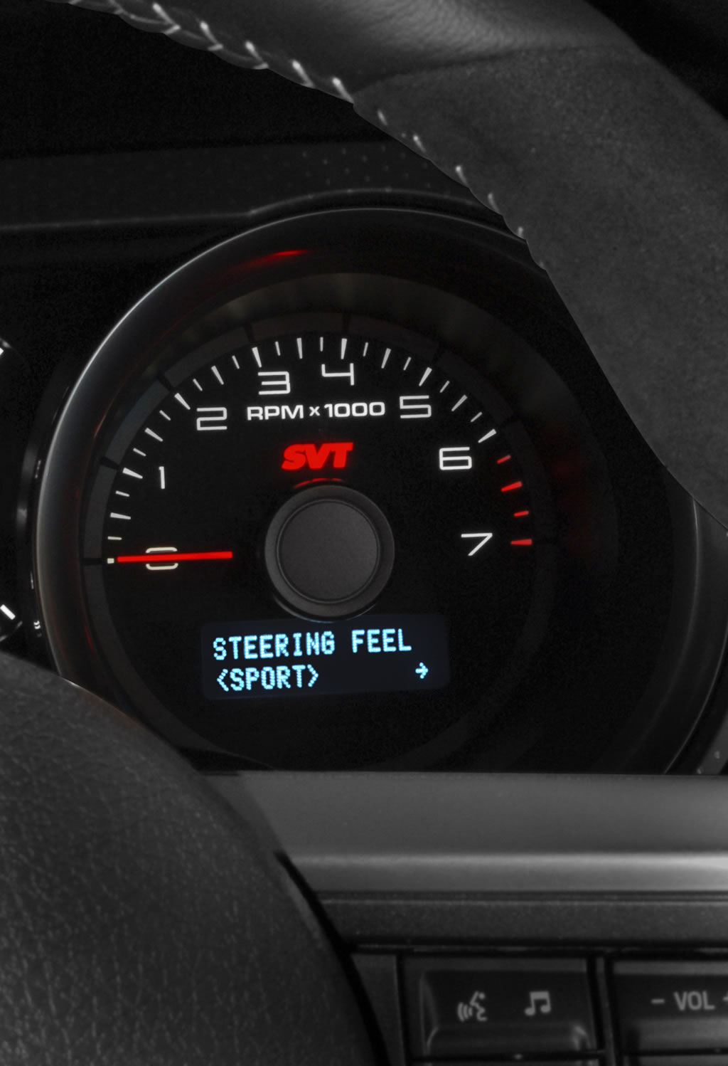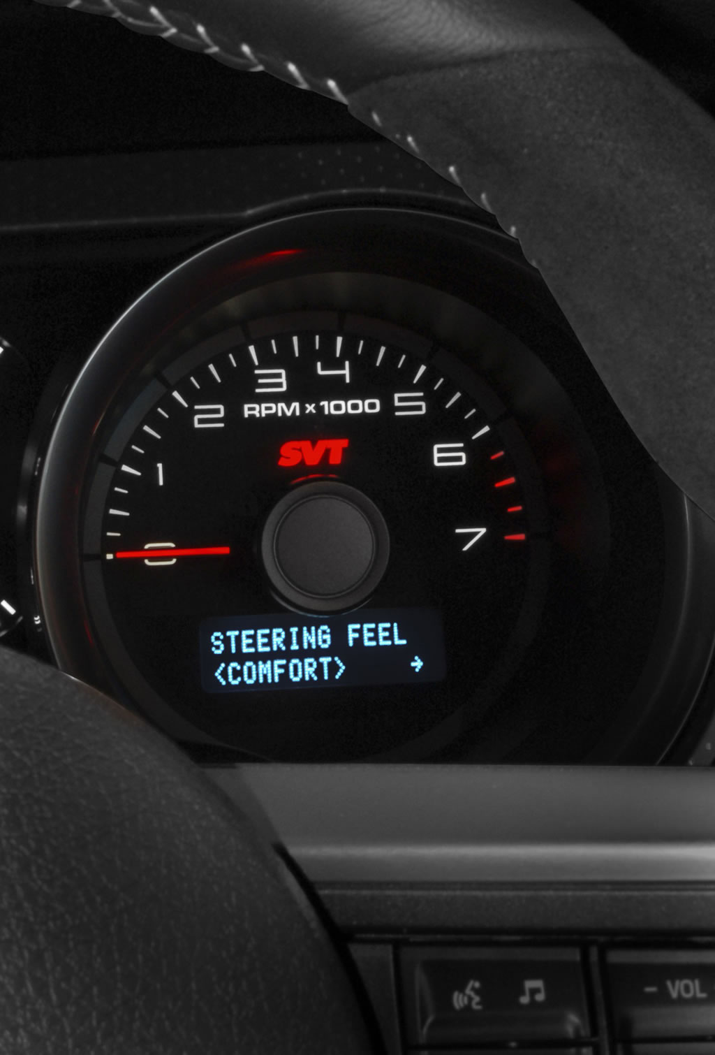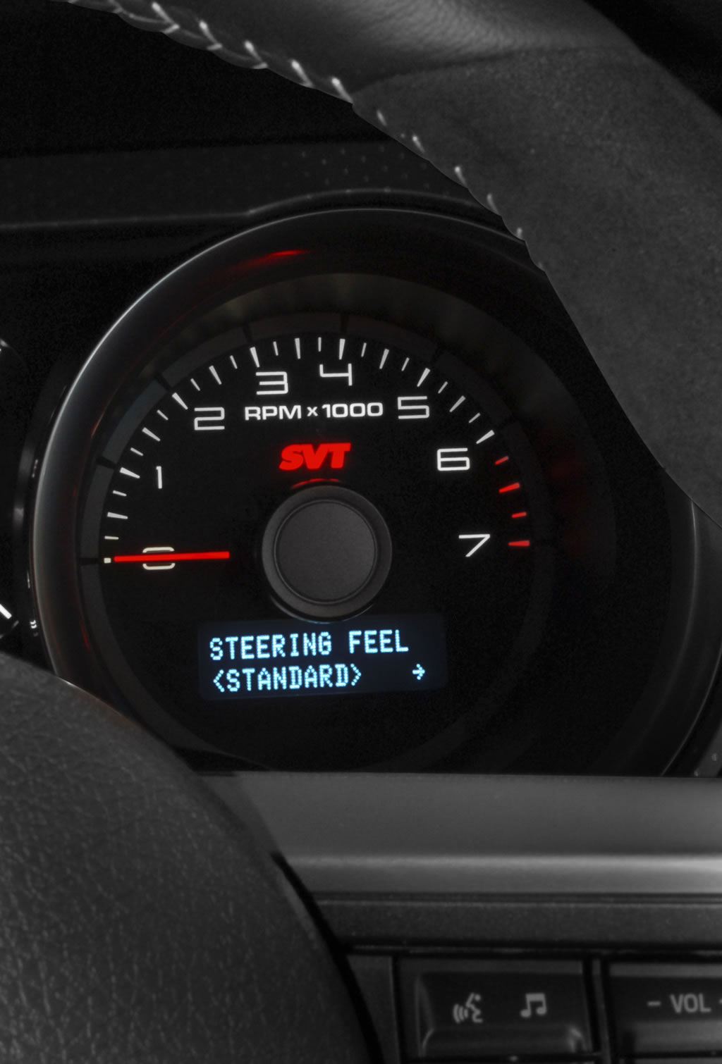 The 2012 Shelby GT500 now gives customers a selectable steering option that tailors the driving experience to fit their needs. With a choice of three settings, the feature allows the customer to select the steering effort depending on his or her style of driving.