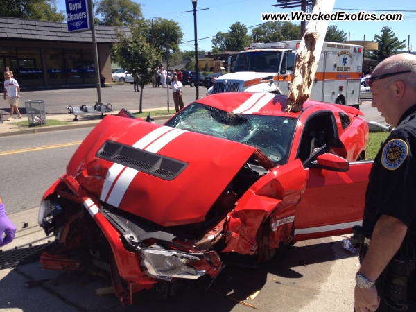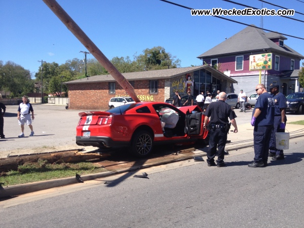 Its tough to look at I know but some people cannot handle the power of a sports car and this is another one of those cases. A driver of a 2012 Shelby GT500 accelerated to fast for the conditions and lost control crashing into a wooden utility pole shearing it in half. Not much else is known about the accident only that it happened in Nashville, TN. Check out both photos of the crash below.