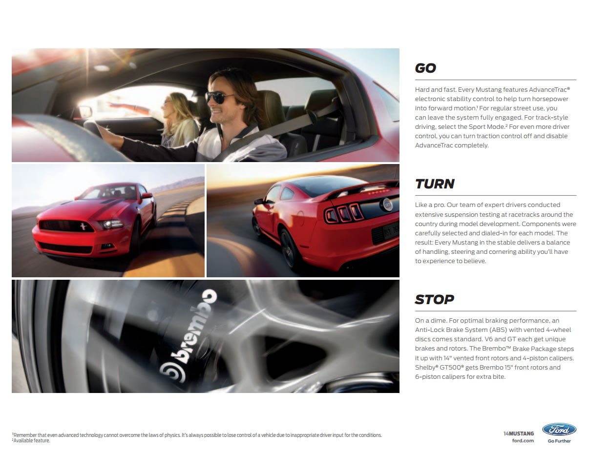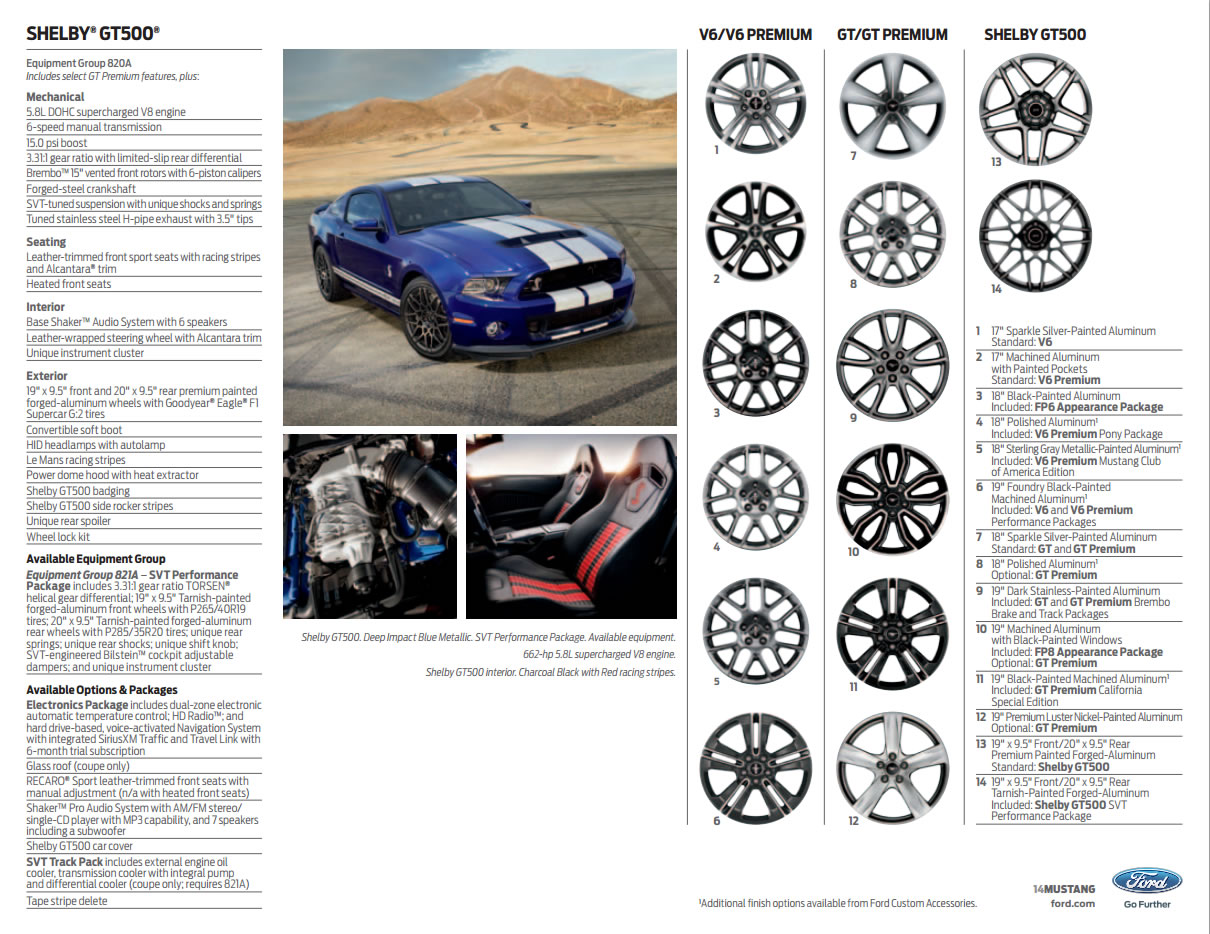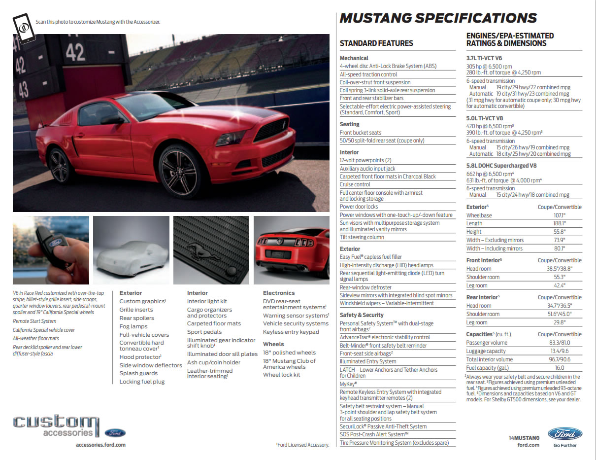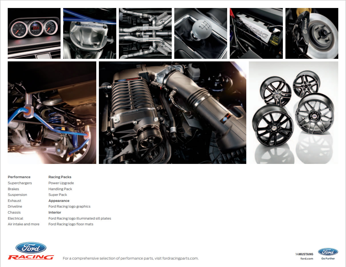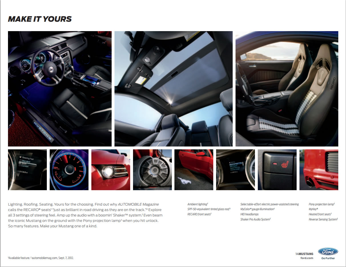 It’s finally here, the 2014 Ford Mustang brochure has been released in all its glory with 23 pages of drool worthy reading material. The only changes for the 2014 Mustang include the addition of two new colors (Oxford White and Ruby Red Metallic) and two new optional appearance packages, the FP6 and FP8. These two new packages feature painted body pieces and 18 or 19-inch wheels. The only addition for the 2014 Shelby GT500 is heated seats are now standard. Keep reading to view screenshots or download the brochure in .PDF form. Enjoy…