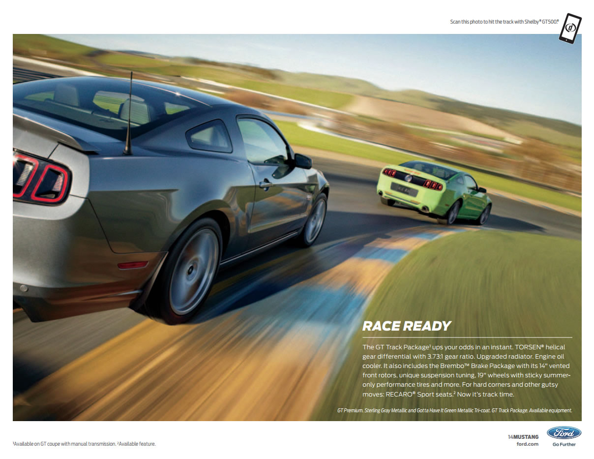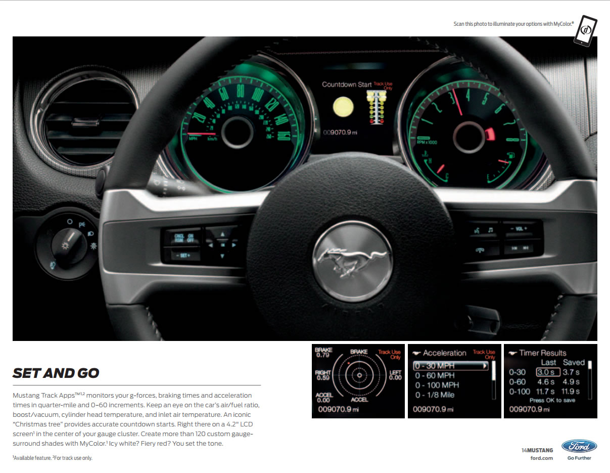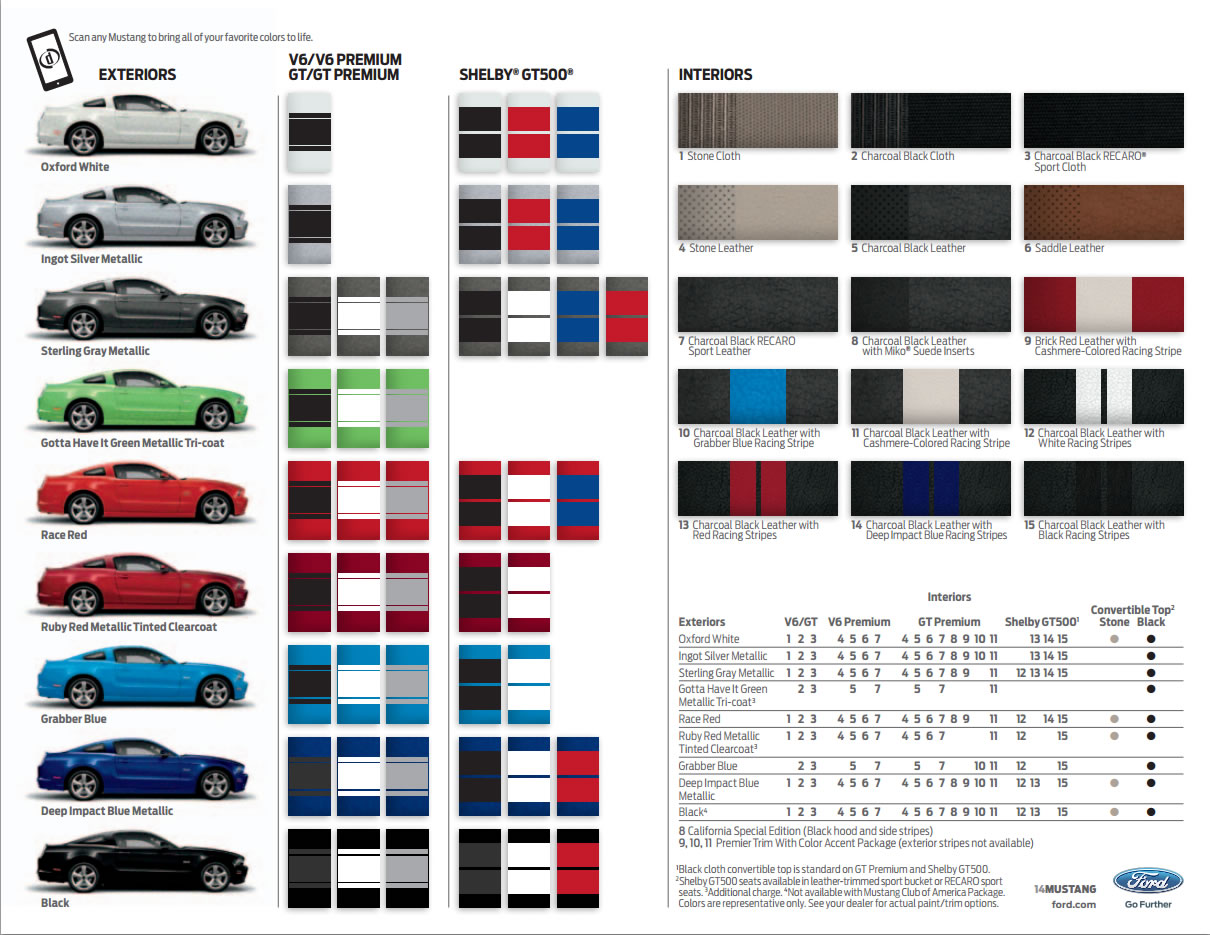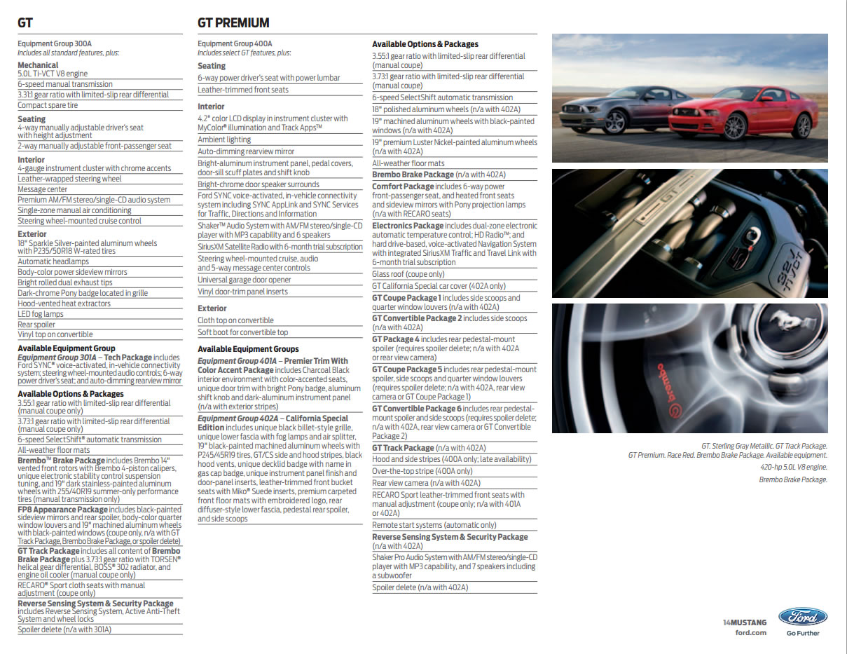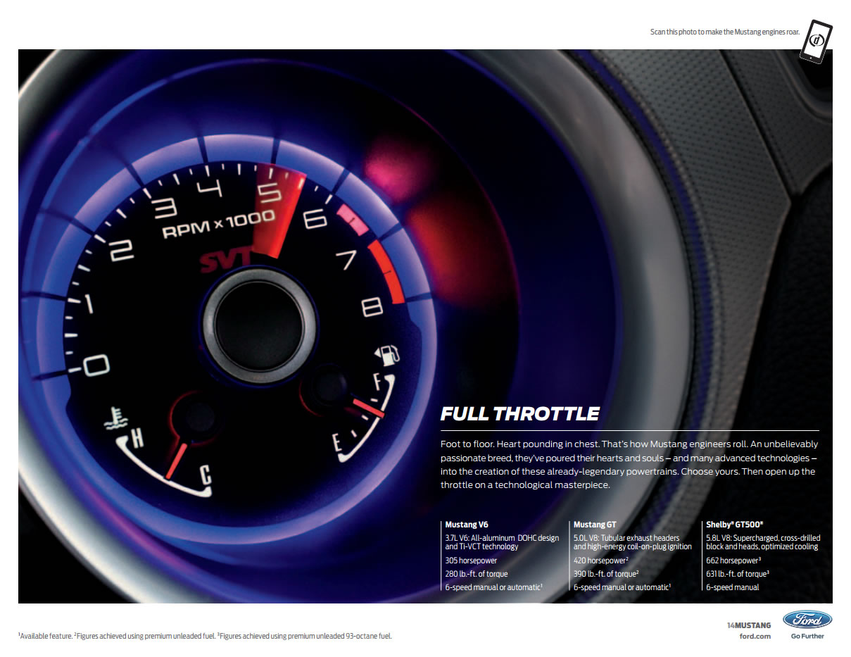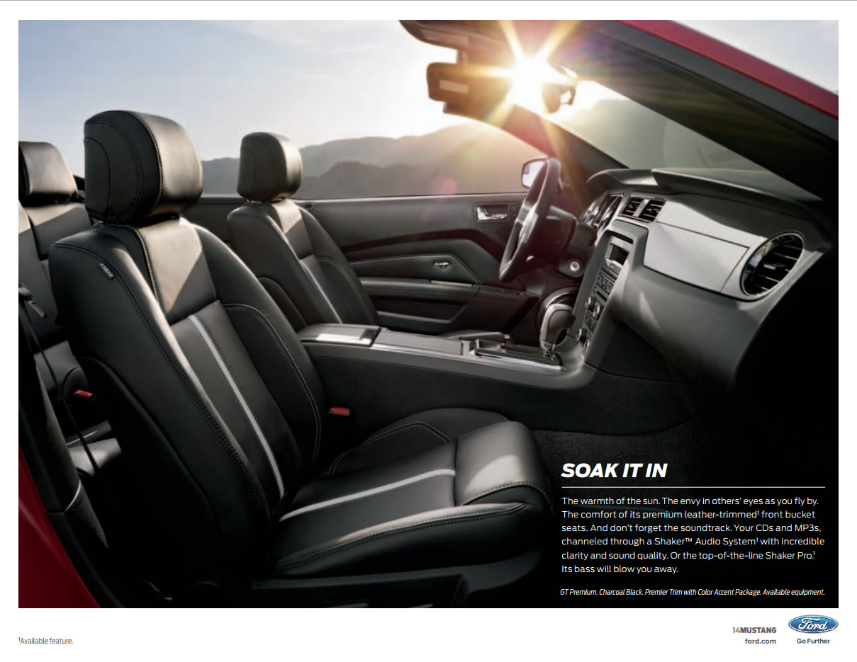 It’s finally here, the 2014 Ford Mustang brochure has been released in all its glory with 23 pages of drool worthy reading material. The only changes for the 2014 Mustang include the addition of two new colors (Oxford White and Ruby Red Metallic) and two new optional appearance packages, the FP6 and FP8. These two new packages feature painted body pieces and 18 or 19-inch wheels. The only addition for the 2014 Shelby GT500 is heated seats are now standard. Keep reading to view screenshots or download the brochure in .PDF form. Enjoy…