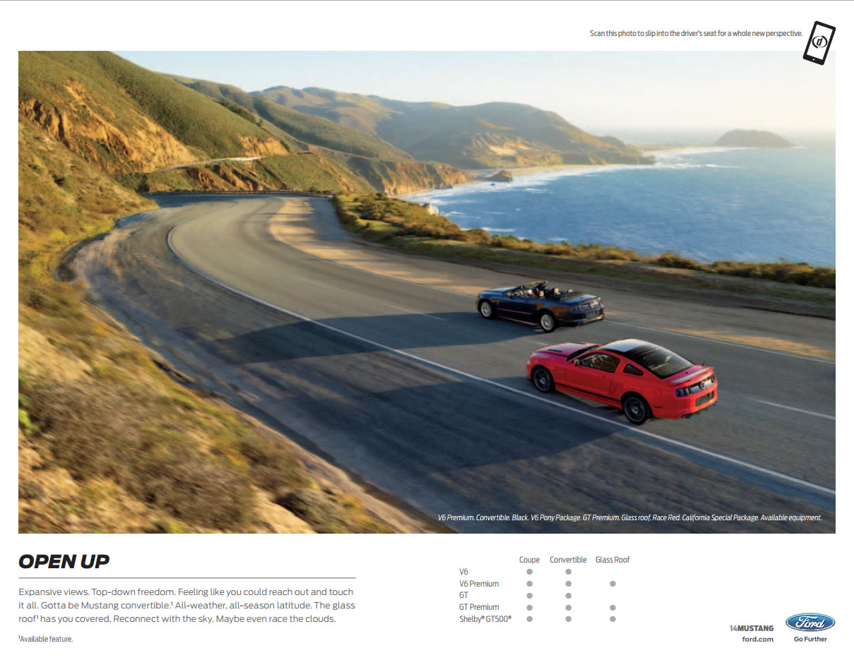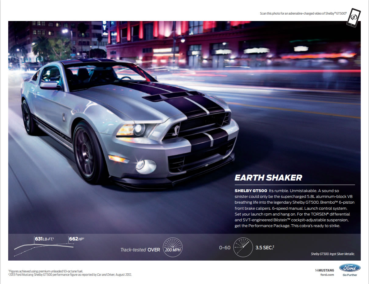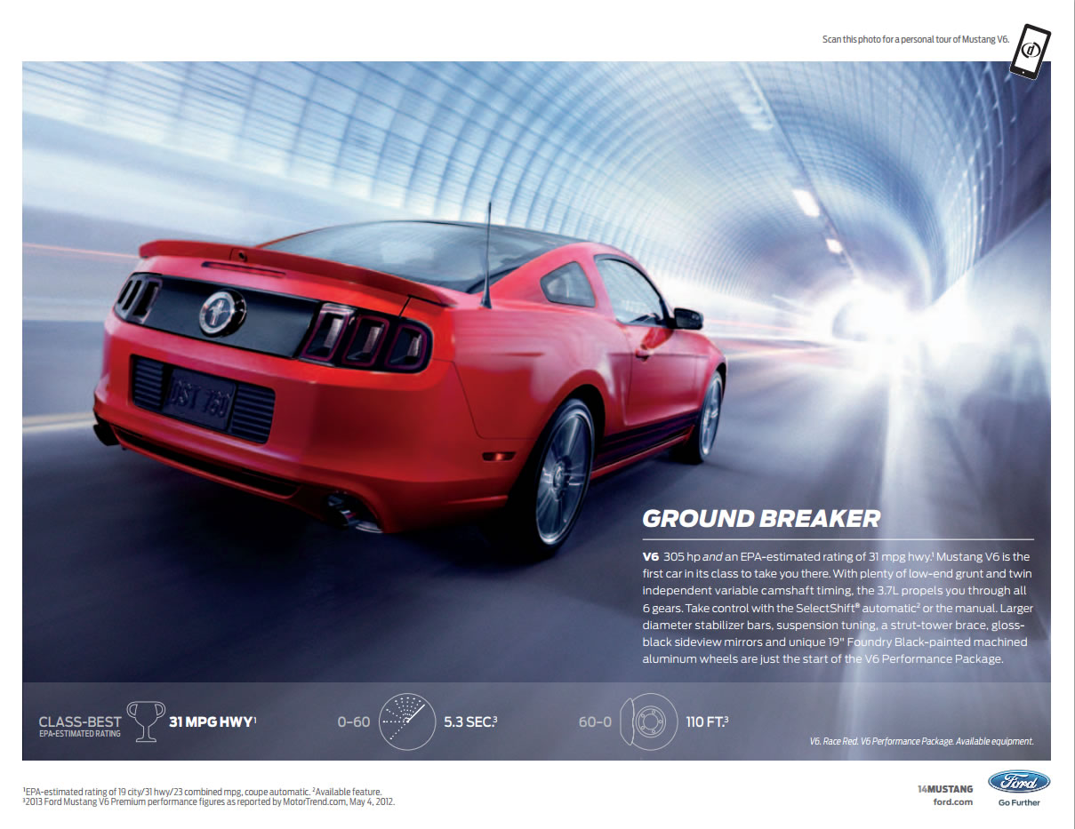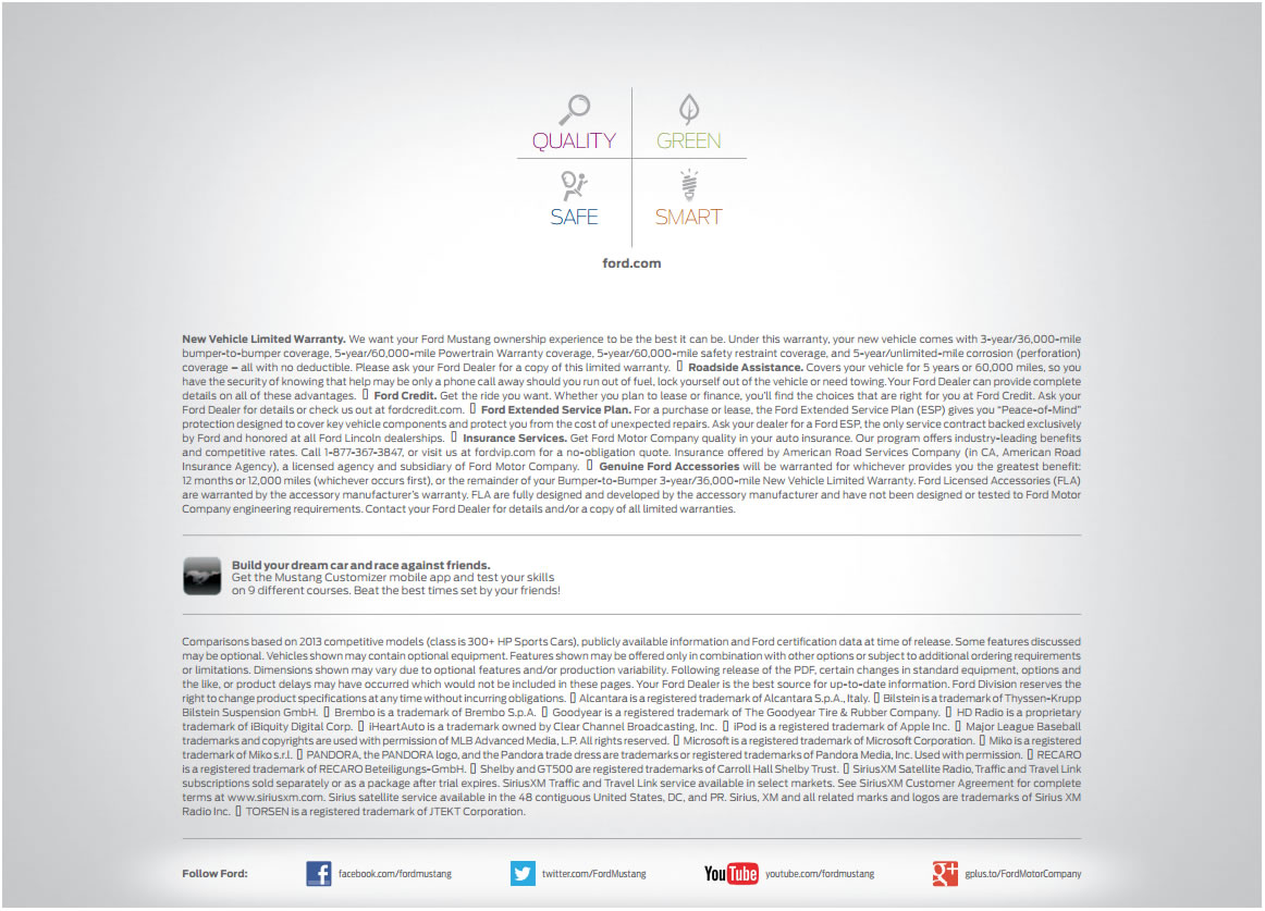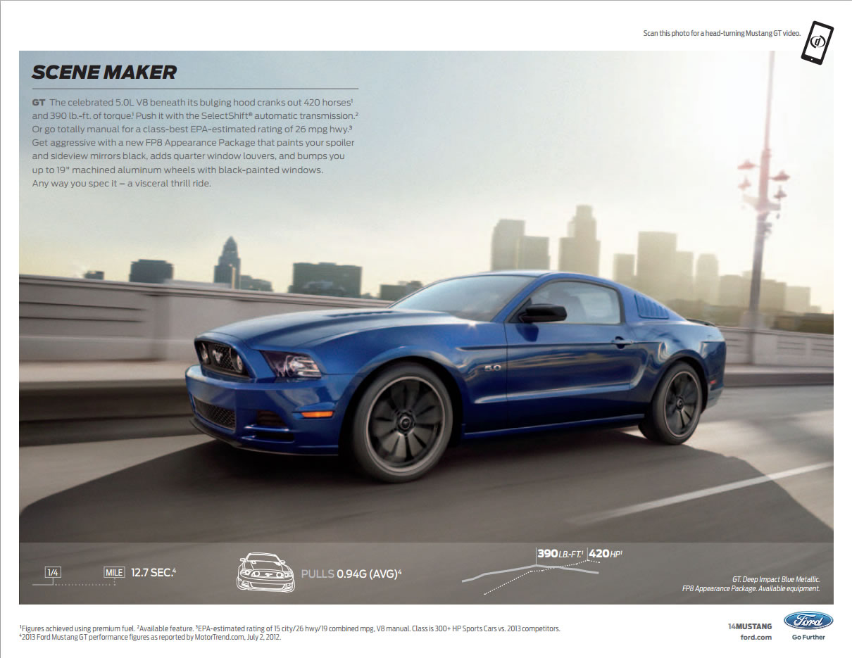 It’s finally here, the 2014 Ford Mustang brochure has been released in all its glory with 23 pages of drool worthy reading material. The only changes for the 2014 Mustang include the addition of two new colors (Oxford White and Ruby Red Metallic) and two new optional appearance packages, the FP6 and FP8. These two new packages feature painted body pieces and 18 or 19-inch wheels. The only addition for the 2014 Shelby GT500 is heated seats are now standard. Keep reading to view screenshots or download the brochure in .PDF form. Enjoy…