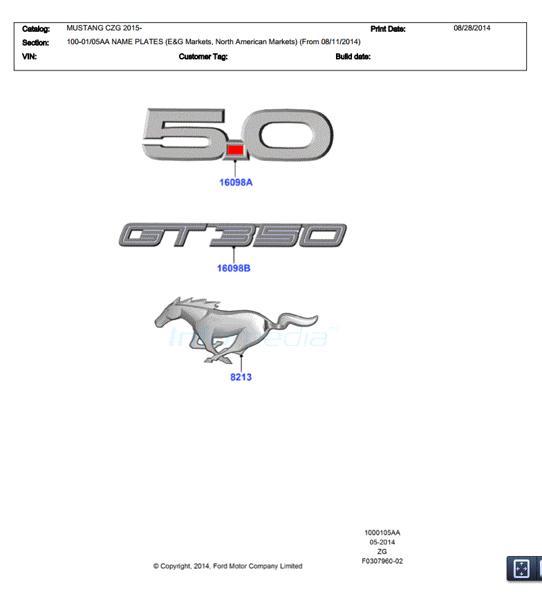 The GT350 badging leaked out on an info sheet from Ford along with the “5.0” and “running pony” badge. Further proof this will be the fender badge isin the small number just below the “GT350” as its designated with a “16098” code which is Ford’s code for fender emblems. Also you will notice the GT350 is written in Shelby type font.