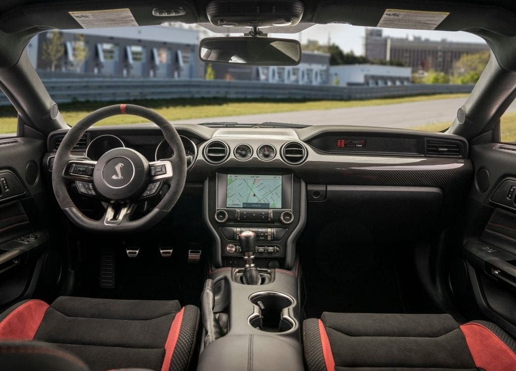 - Leather/Alcantara® – wrapped Steering Wheel with tilt/telescoping steering column and Shelby® red sightline RECARO® cloth/Miko® suede Sport Seats with Red accents