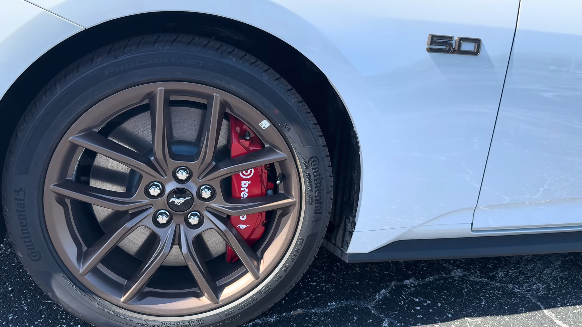 Ford also adds a bronze-outlined “5.0” badge on the fender and a bronze-trimmed GT badge in the rear center panel. These details stand out against the white metallic paint and give the car a unique contrast.