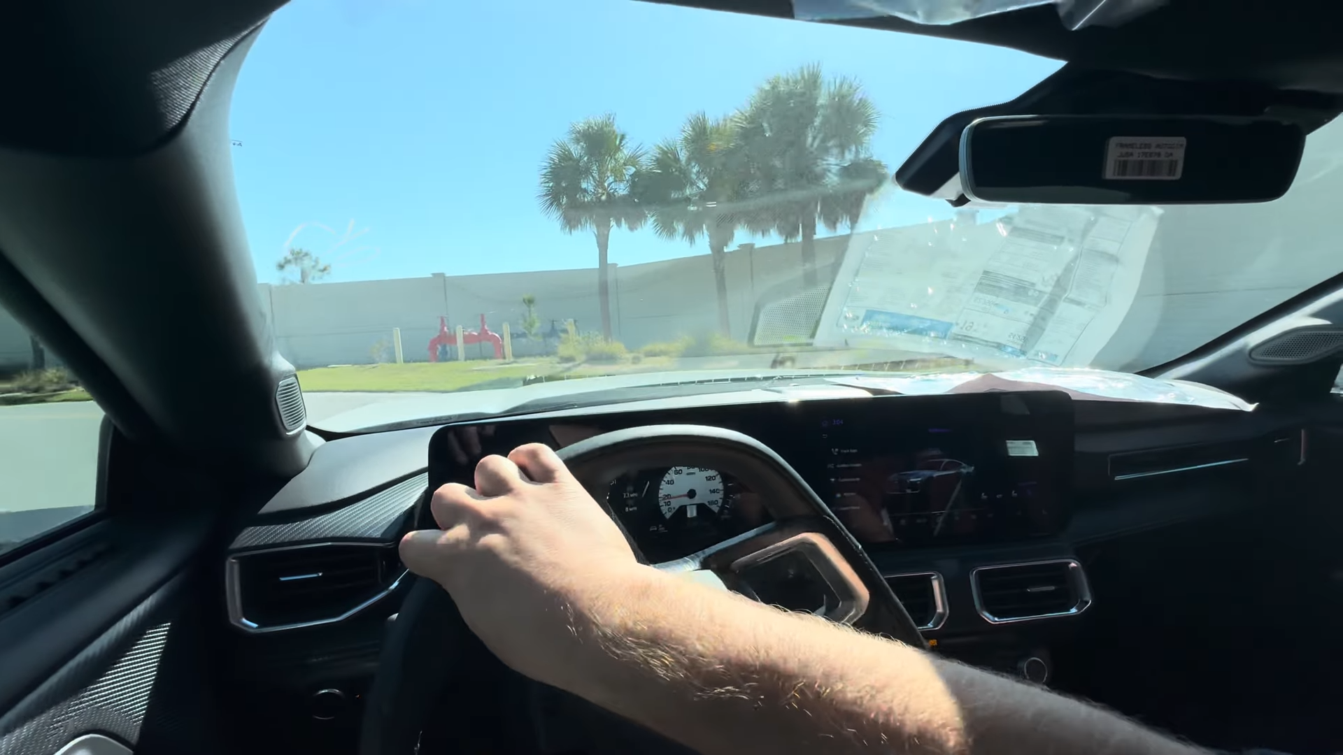 You press the start button and the 5.0-liter V8 comes to life with a deep tone. The available active exhaust changes the sound, and in track mode it gets much louder. Quiet mode softens it, but you still hear the engine.