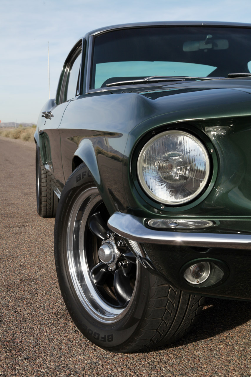 The Mustang begins with a 1967 or ’68 original Ford body and comes with a Keisler five-speed manual transmission coupled to a Hydraulic clutch. BFGoodrich tires surround the five spoke American Racing wheels, while Baer 12″ front disc brakes and Baer 11″ rear disc brakes bring the car to a halt.