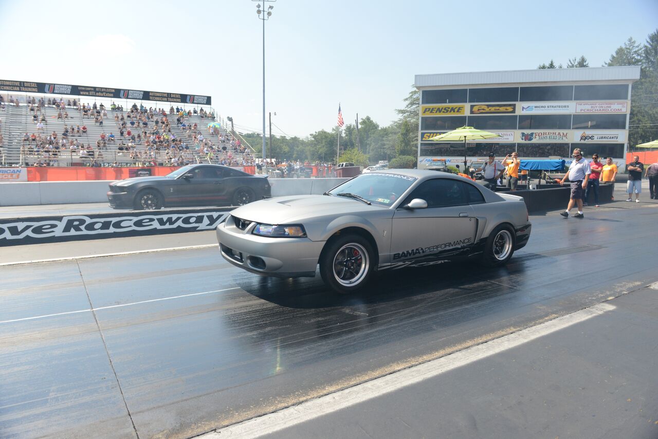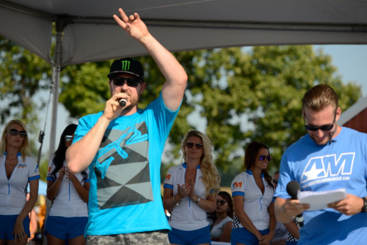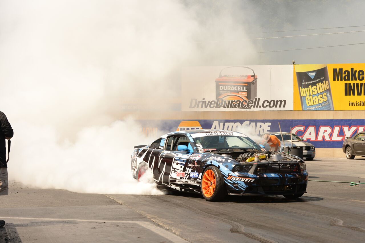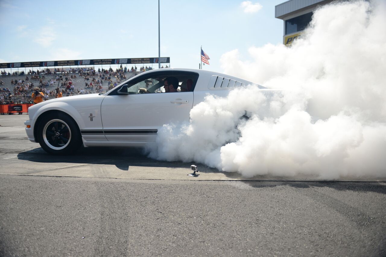 The Roush Burnout competition drew out some tire shredding monsters who were eager to make clouds of creamy white tire smoke. Roasting his tires and smoking out the burnout box with the best burnout was AM customer Kyle O. and his 2006 Mustang GT. Riding on the excitement of the burnout contest was a series of Exhibition Races courtesy of Vogtland. The Bama Performance Cobra ran a 10.8 @ 133 MPH against the Bama GT500 which went 11.1@ 133 MPH. The Bama Performance 2015 GT made a record setting pass down the 1⁄4-mile going 9.4 @ 146 MPH, making it the fastest 2015 in the world. The races were rounded out with a pass by an insane jet-engine powered car, which made put down a time of 5.7 @ 280 MPH!