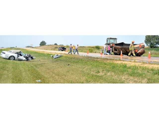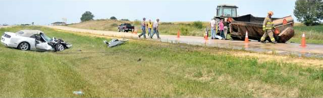 The driver was apparently text messaging on his phone and did not realize the liquid manure truck was stopped. He crashed into the manure trailer and destroyed the new rental Mustang. The Mustang driver ironically suffered only a broken finger while the manure truck driver was not seriously hurt.