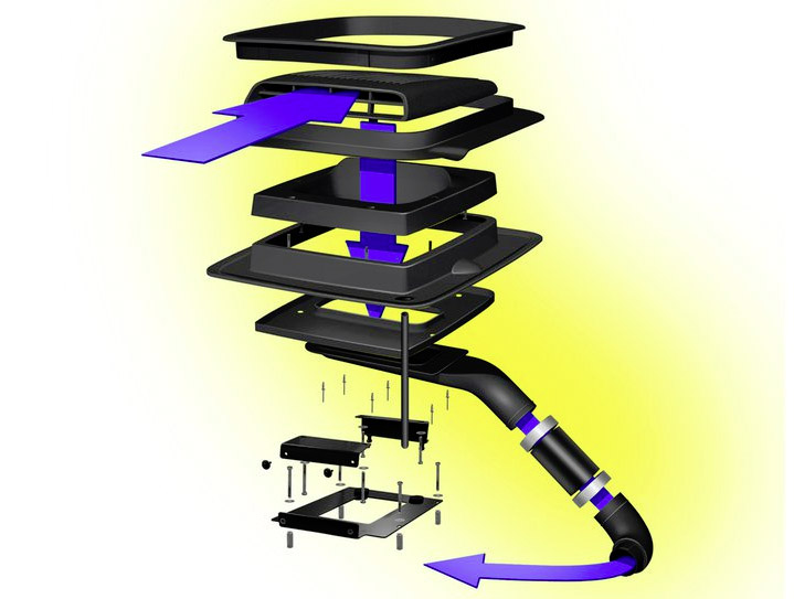 CDC’s Shaker installs using the stock aluminum hood, which has a factory-stamped recess in the hoods inner layer. This element was included by Ford specifically for the CDC Shaker to maintain the structural integrity of the hood after a hole is cut. Classic Design Concepts first revealed the 5.0L Shaker System prototype at SEMA 2010 and it is now available for sale. Included are all necessary mounting hardware, air management system, hood template and detailed guide for a seamless, professional installation.