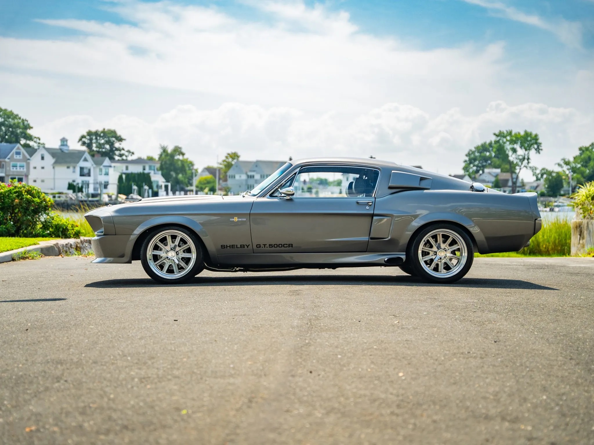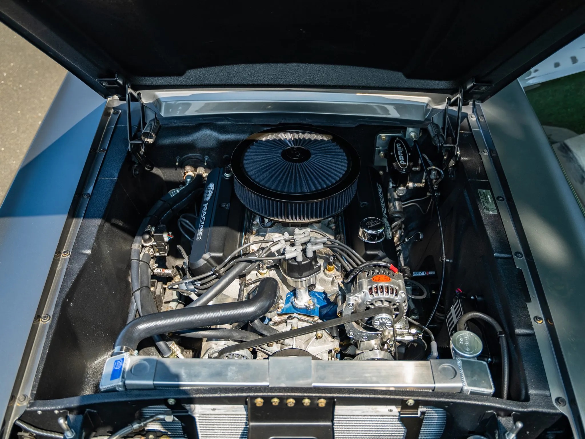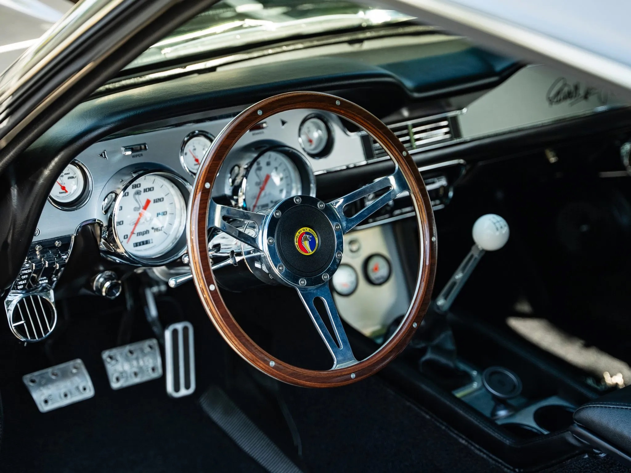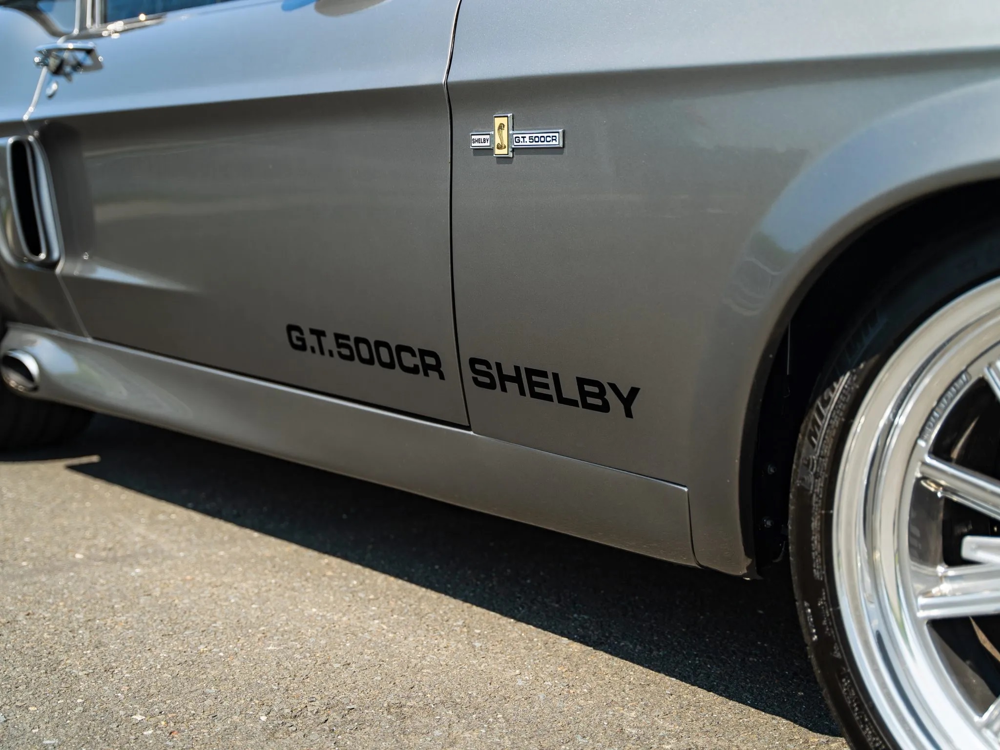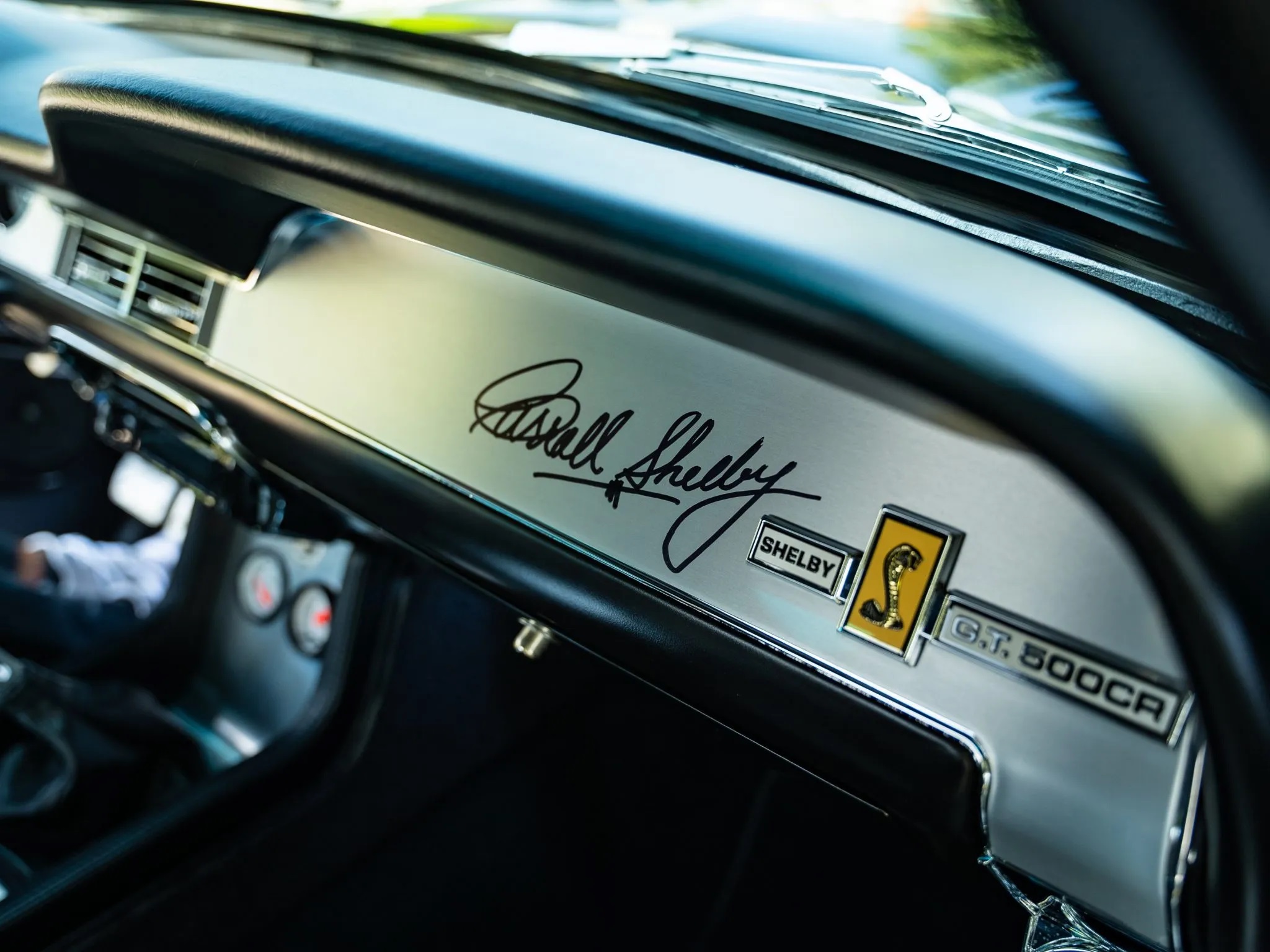 Inside, the GT500CR is equipped with SCAT Rally Series 1000 seats, G-Force Racing five-point camlock belts, deluxe 1967 door panels, Shelby Signature gauges, and a woodgrain steering wheel mounted on a polished Flaming River tilt steering column. Additional features include Old Air Products air conditioning and an Alpine CD player with Bluetooth, connected to Focal coaxial speakers, an FPX 5.1200 Focal D-class amplifier, and a subwoofer.