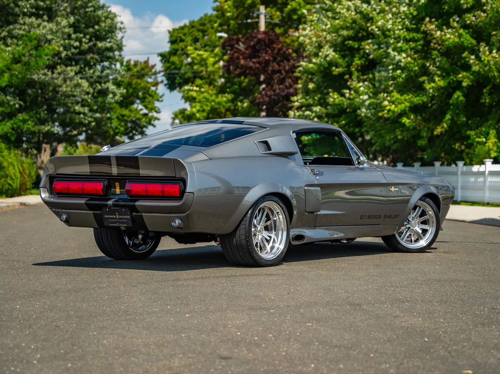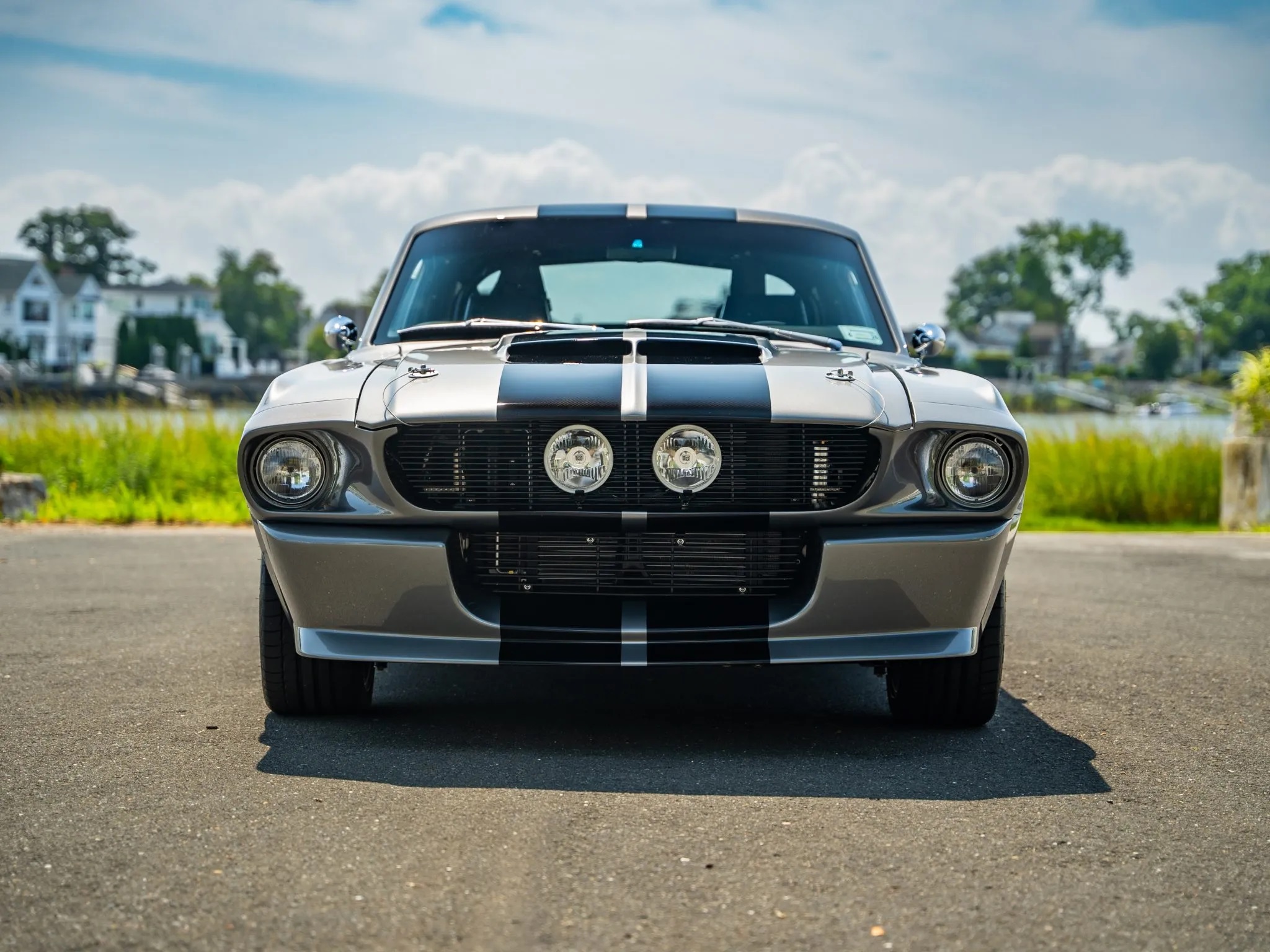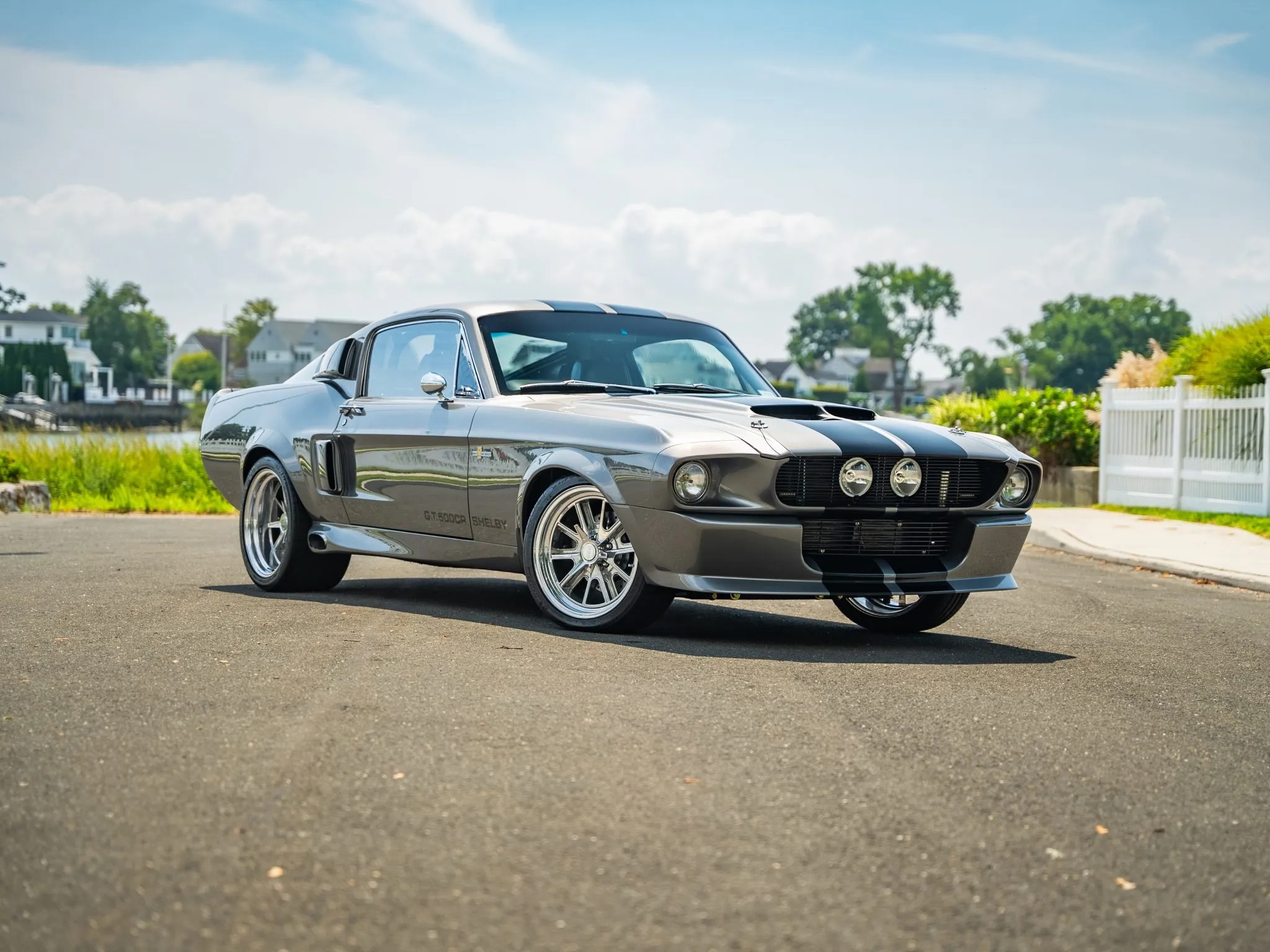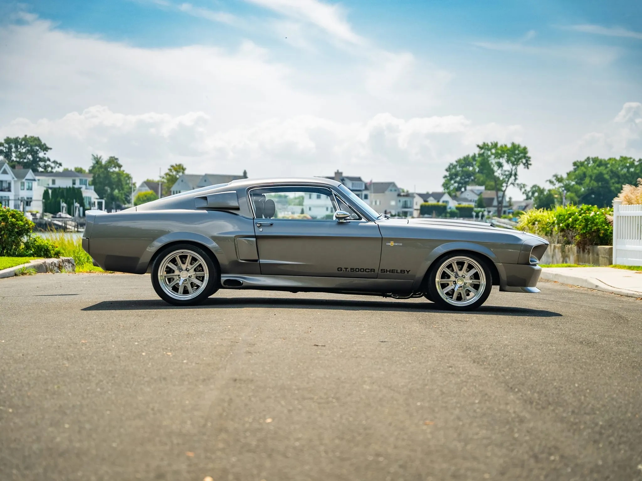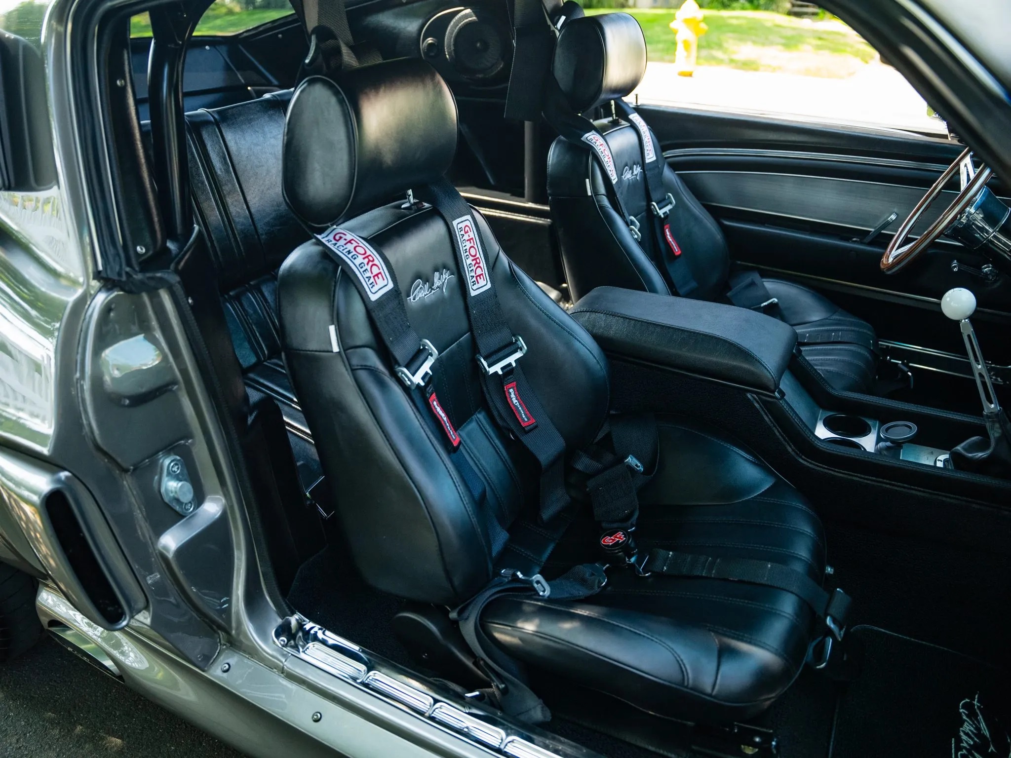 Inside, the GT500CR is equipped with SCAT Rally Series 1000 seats, G-Force Racing five-point camlock belts, deluxe 1967 door panels, Shelby Signature gauges, and a woodgrain steering wheel mounted on a polished Flaming River tilt steering column. Additional features include Old Air Products air conditioning and an Alpine CD player with Bluetooth, connected to Focal coaxial speakers, an FPX 5.1200 Focal D-class amplifier, and a subwoofer.