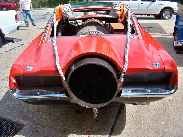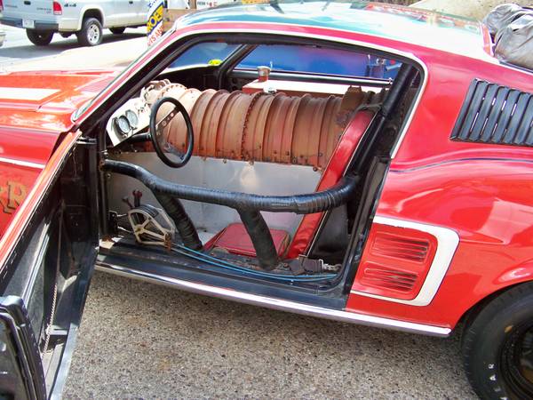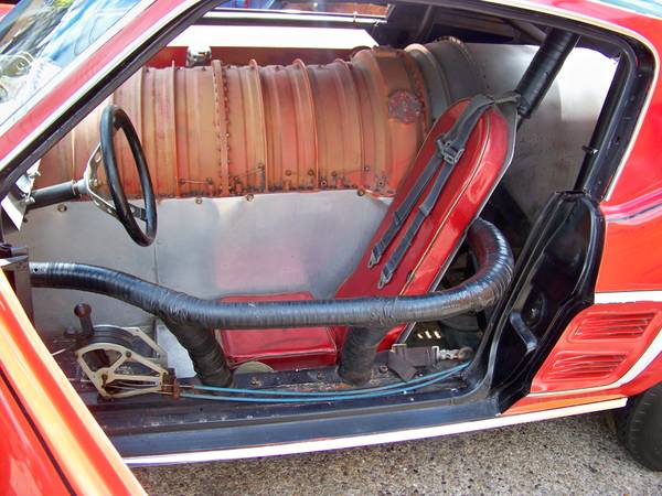 The Mustang was originally built by Ted Trischler back in the late 60’s at his body shop in Pittsburgh, Pennsylvania from a 1967 Mustang body in white he purchased from Northland Ford. Ted cut the entire middle section of the Mustang out to make room for the enormous fighter jet engine. Other parts used for the build included a front axle from a 1939 Plymouth , brakes from a 1958 Buick, aircraft struts used as shocks and the throttle and parachute controls were designed for a boat.