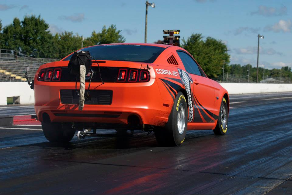 The one-off NHRA legal 2014 Mustang Cobra Jet will be powered by a supercharged 5.0-liter V8 mated to a T4 racing transmission, and boast an optional traction “wheelie” bar, 8.50 ET certified chrome-moly safety cage, exclusive Cobra Jet-branded Weld wheels, three-link rear suspension, lightweight racing brakes, 9-inch rear axle, and custom Cobra-branded Recaro seats.
