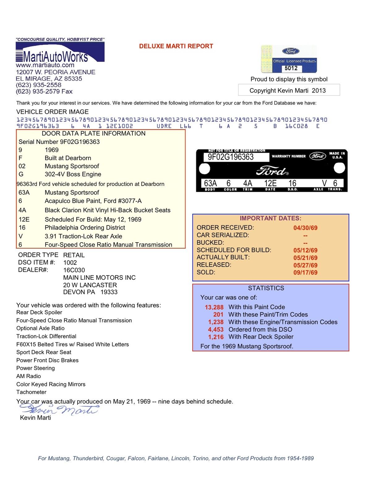 1969 Mustang Boss 302 VIN: 9F02G196363