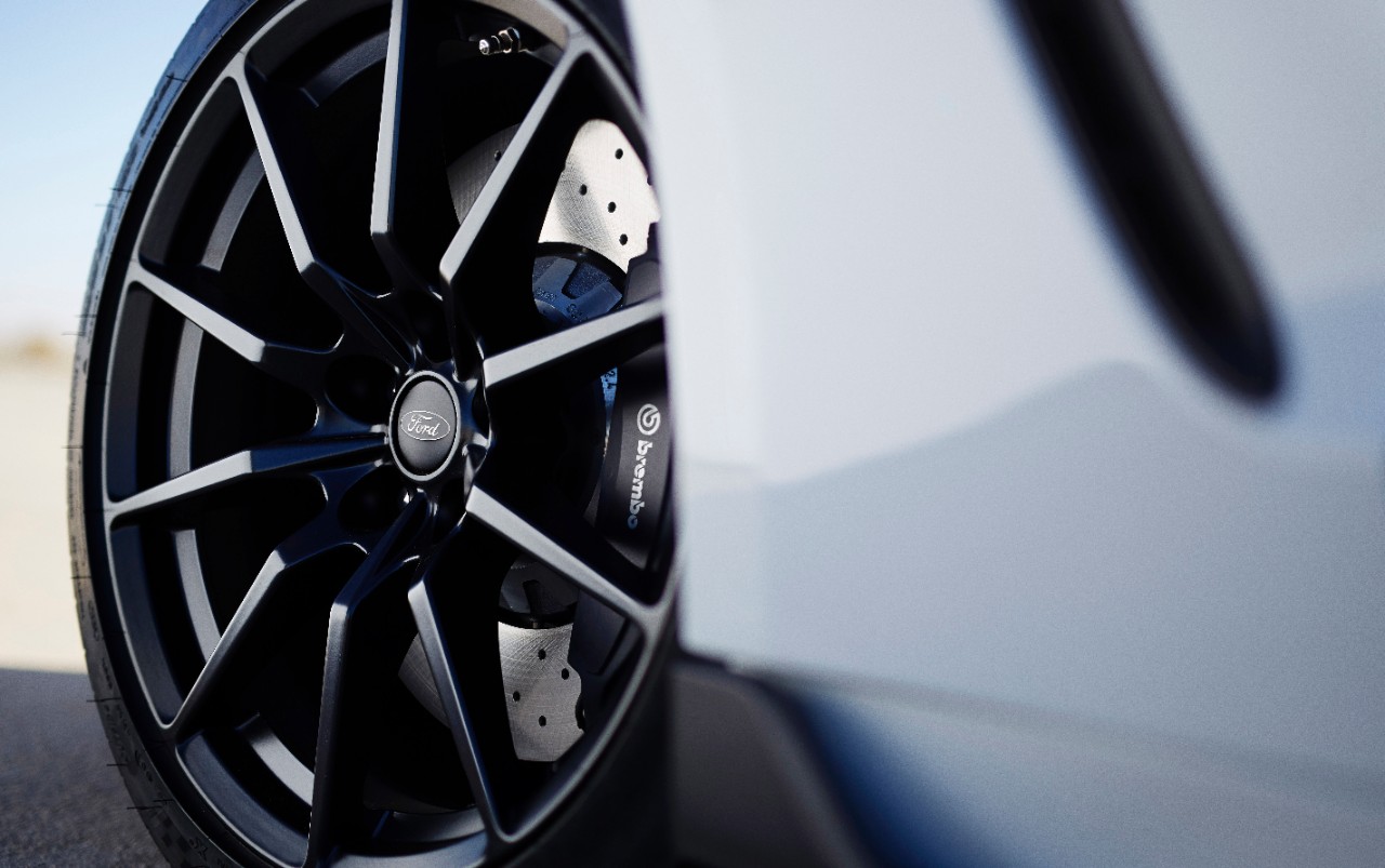 GT350 features the most track-worthy brake system ever offered on a Ford vehicle in terms of absolute stopping power and fade resistance. At the front are massive 394-millimeter rotors clamped by Brembo six-piston calipers; 380-millimeter rotors at the rear use four-piston calipers.