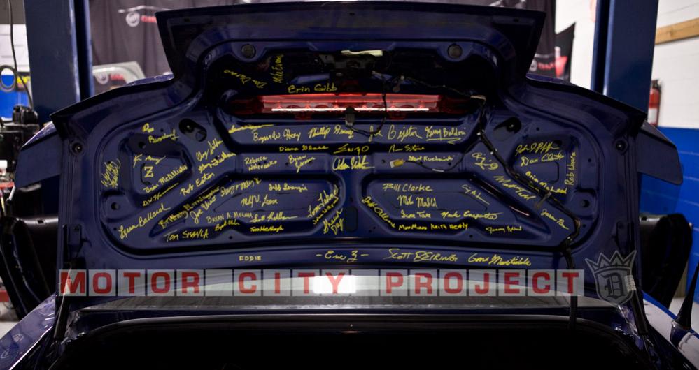 The GT500 prototype includes a full roll cage, six-point harness seatbelts and new Recaro racing seats that were donated by Recaro North America, identical to those used in development. Evidence of instrumentation from development also can be found inside the vehicle. Each member of SVT engineering who worked on the 2013 Shelby GT500 has signed the underside of the trunk lid.