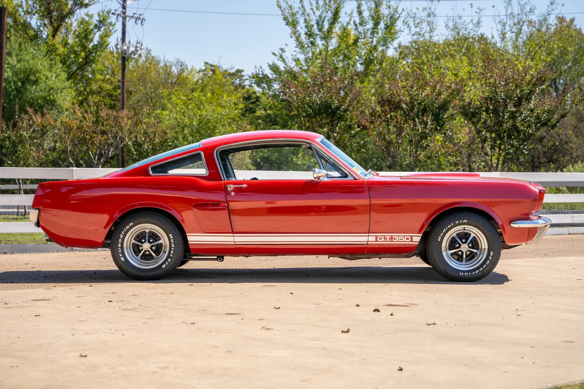 The car is finished in Candyapple Red, featuring a fiberglass hood, GT350 side stripes, and side scoops. Inside, you can find a Hurst shifter, Cobra tachometer, and black vinyl bucket seats. Power comes from a rebuilt HiPo 289/306 HP V8 engine, paired with a four-speed manual transmission and a locking rear differential with 4.10:1 gears.