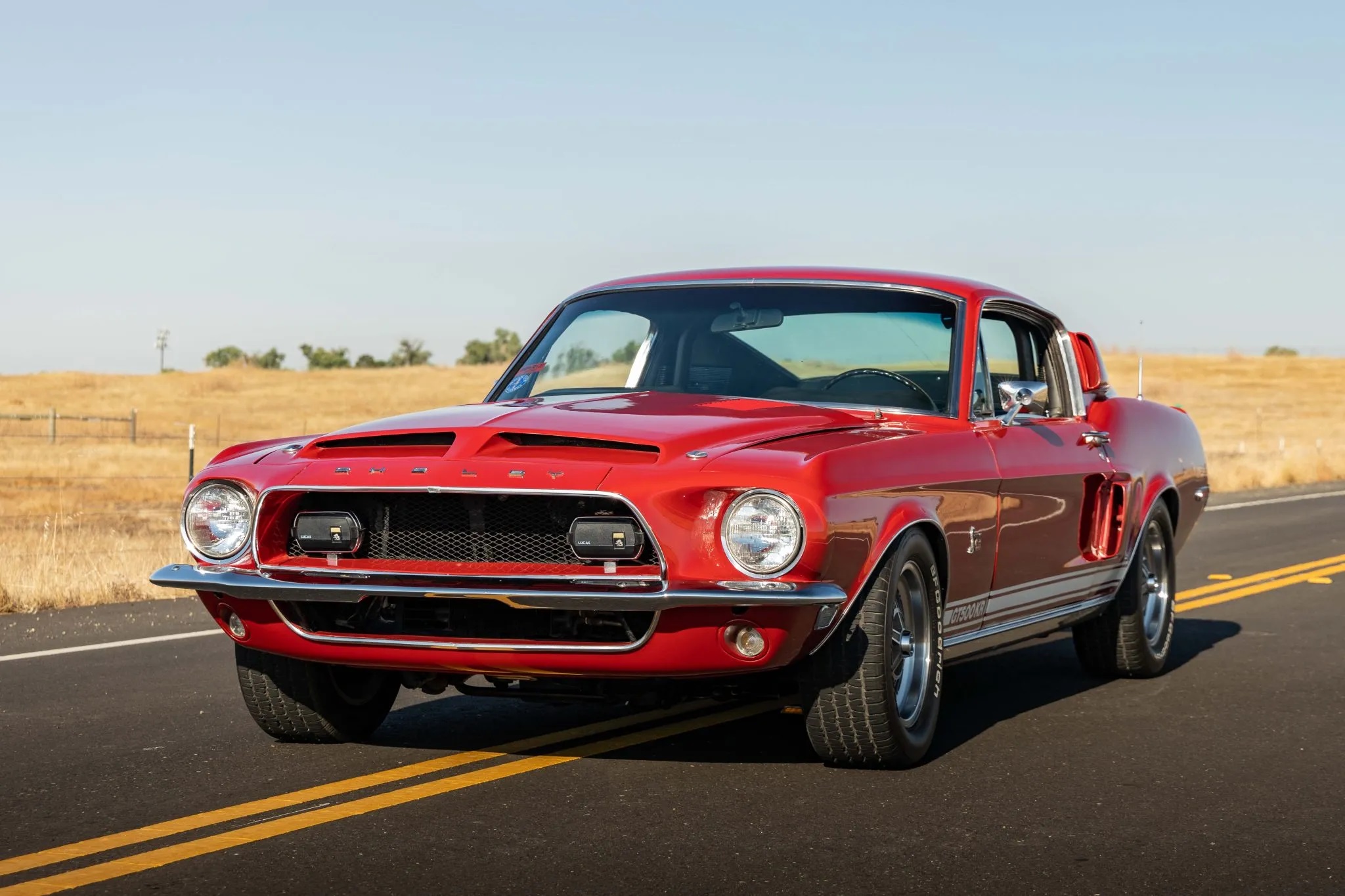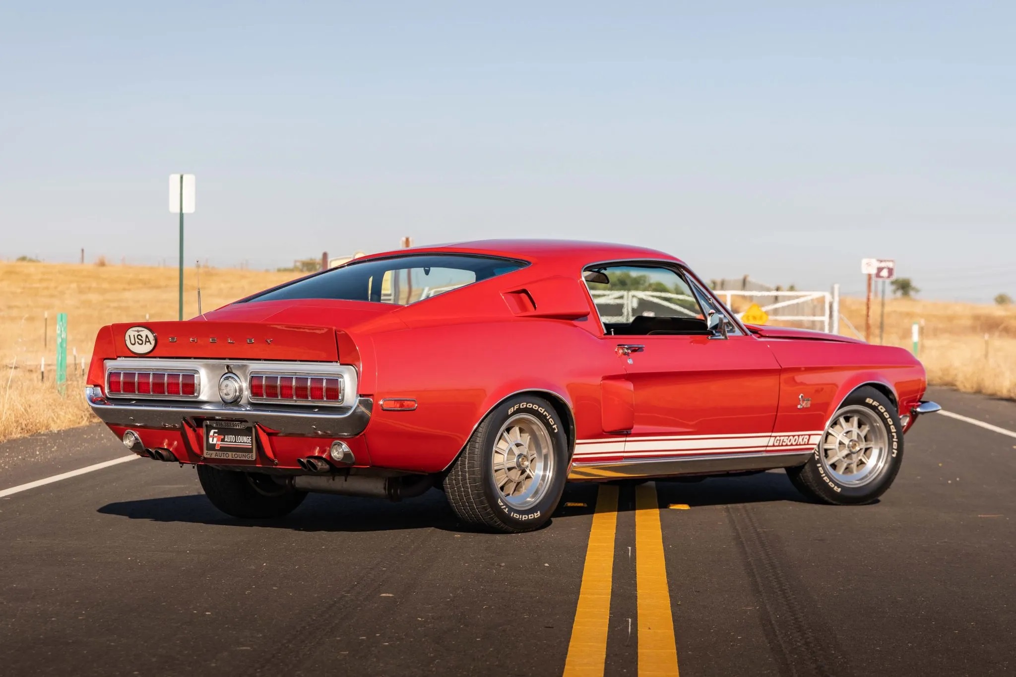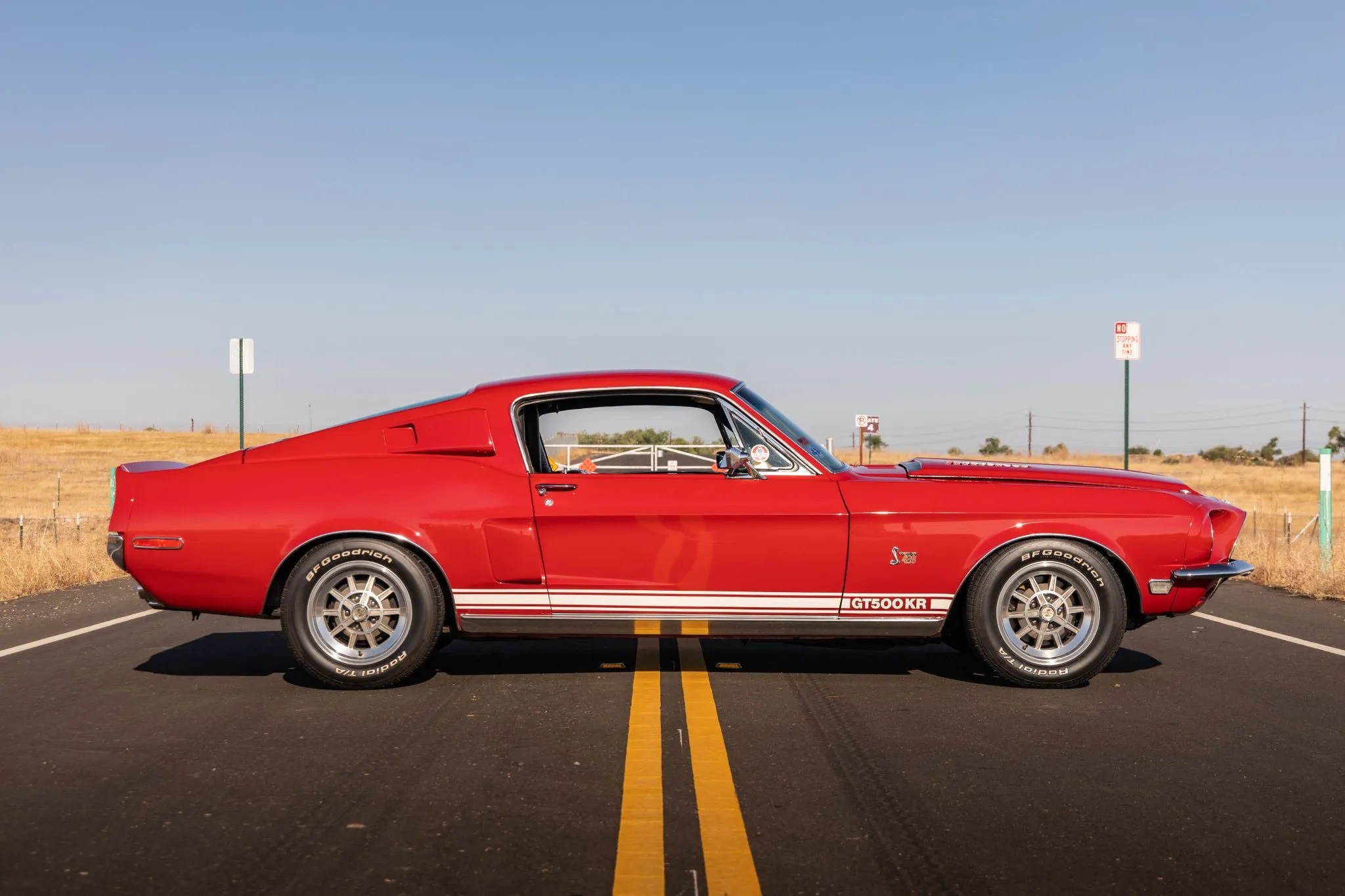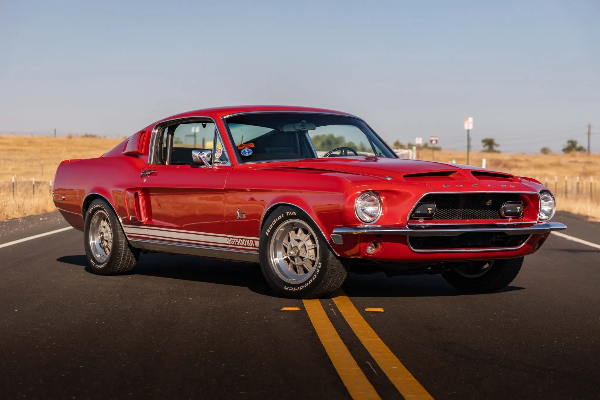 The 1968 Shelby Mustang GT500KR you see here is one of only 1,053 “King of the Road” fastbacks produced. The car has been refinished in red over black and it features a 428ci Cobra Jet V8 paired with a three-speed automatic transmission, along with 15″ 10-spoke wheels, woodgrain interior trim, folding rear seats, and an AM radio.