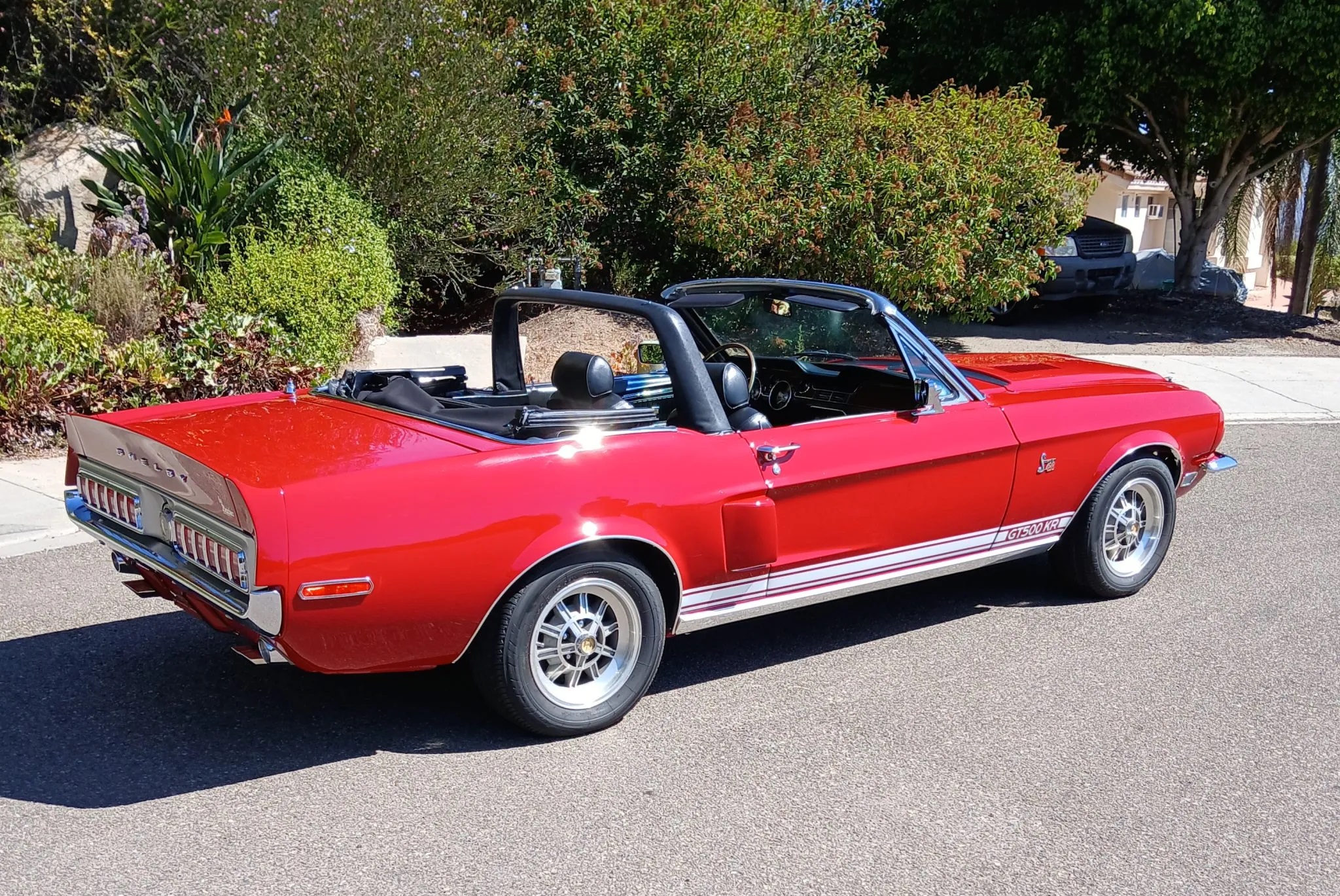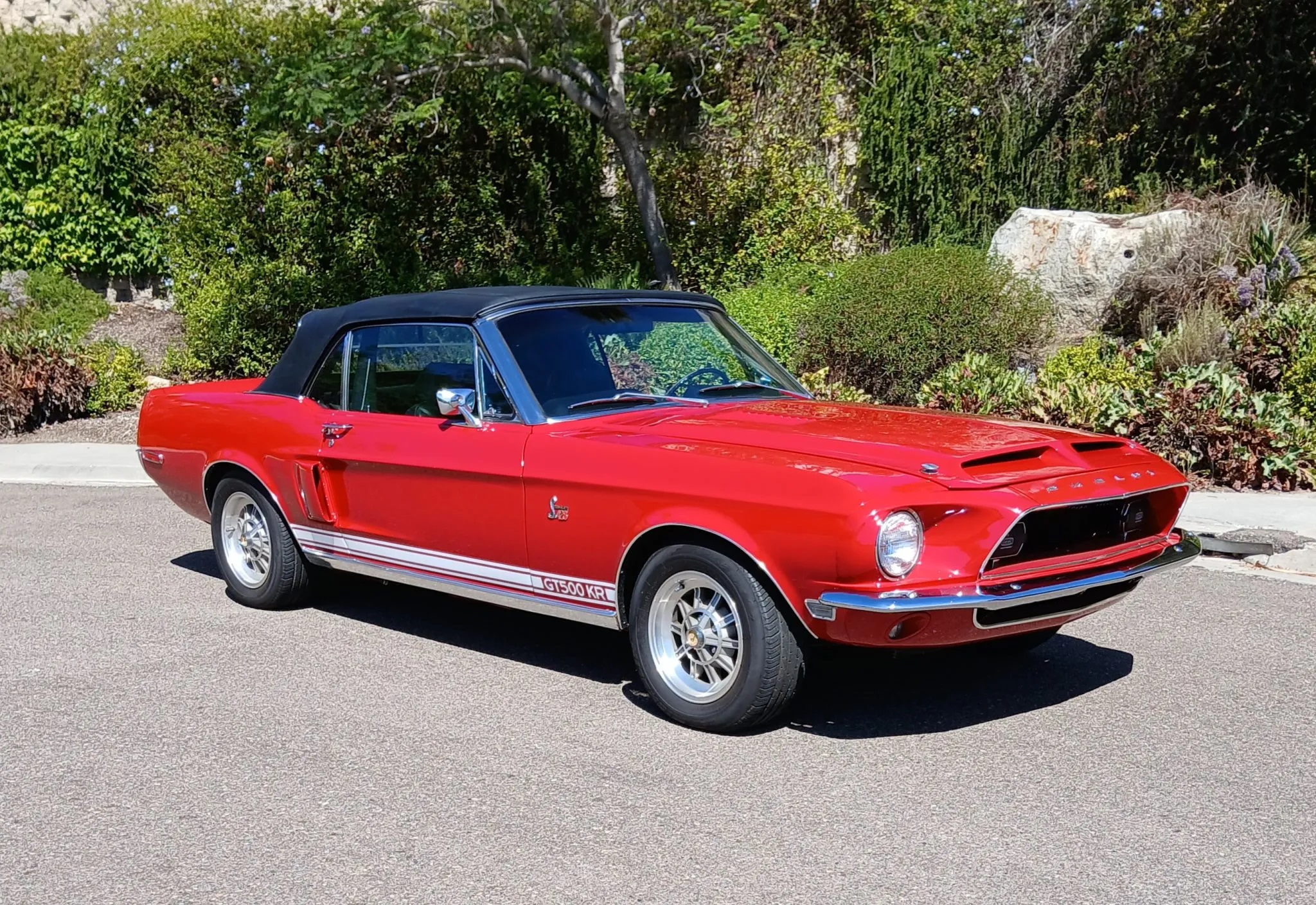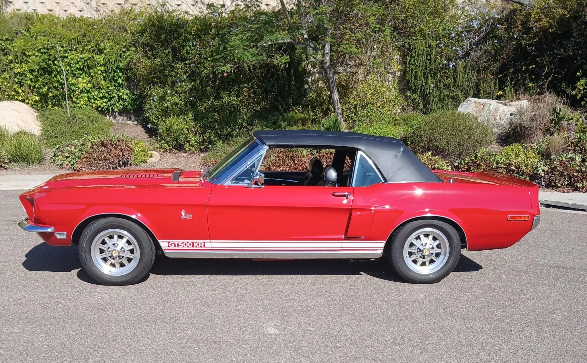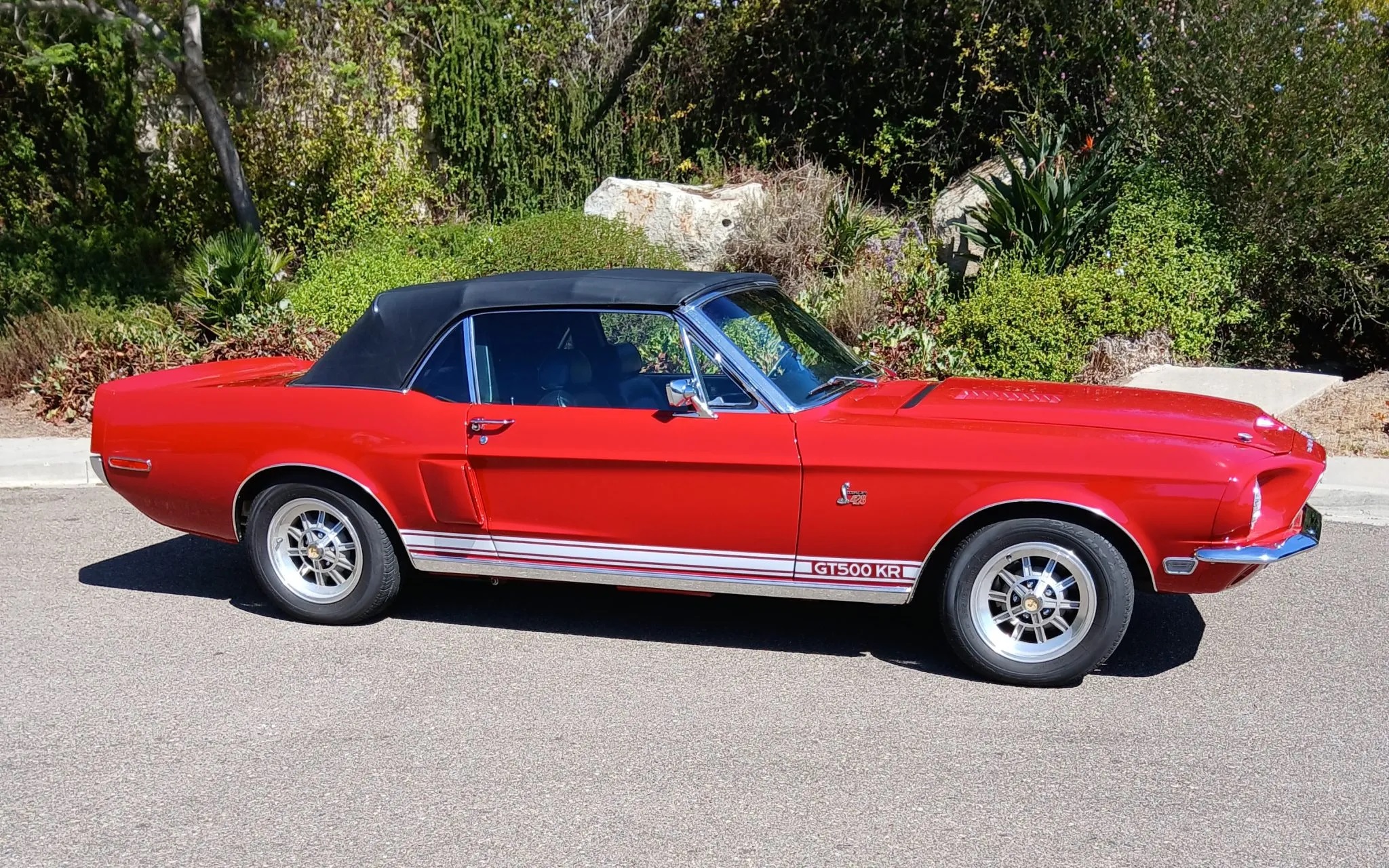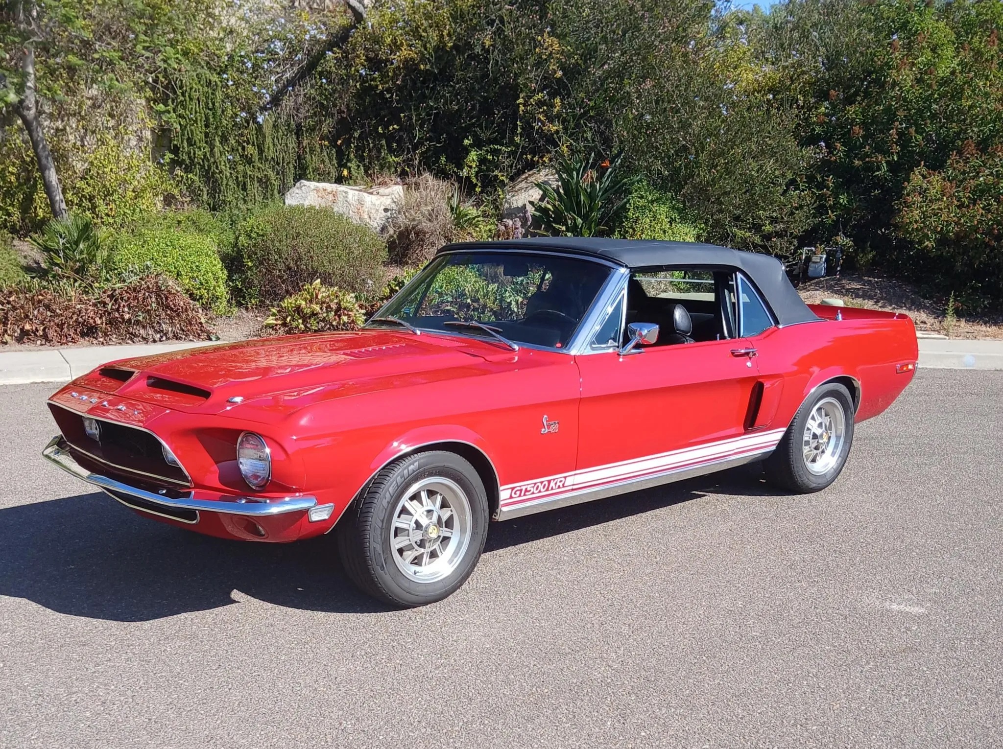 This particular 1968 Shelby GT500KR Convertible is finished in Candyapple Red with white stripes and has a black vinyl interior with a reupholstered black Decor interior and a power-operated black convertible top.