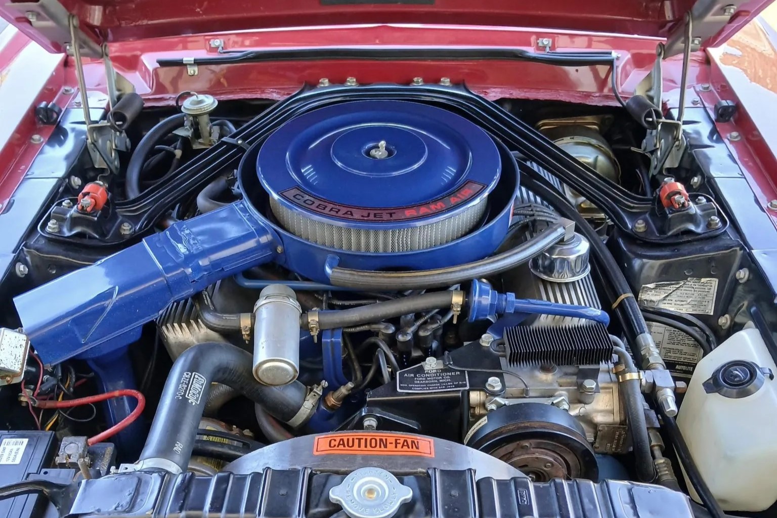 It’s equipped with a 428ci Cobra Jet V8 engine producing 335 horsepower and 440 lb-ft of torque, paired with a four-speed Toploader manual transmission. Additional features include 15″ aluminum wheels, an AM radio, power steering, and power-assisted front disc brakes.