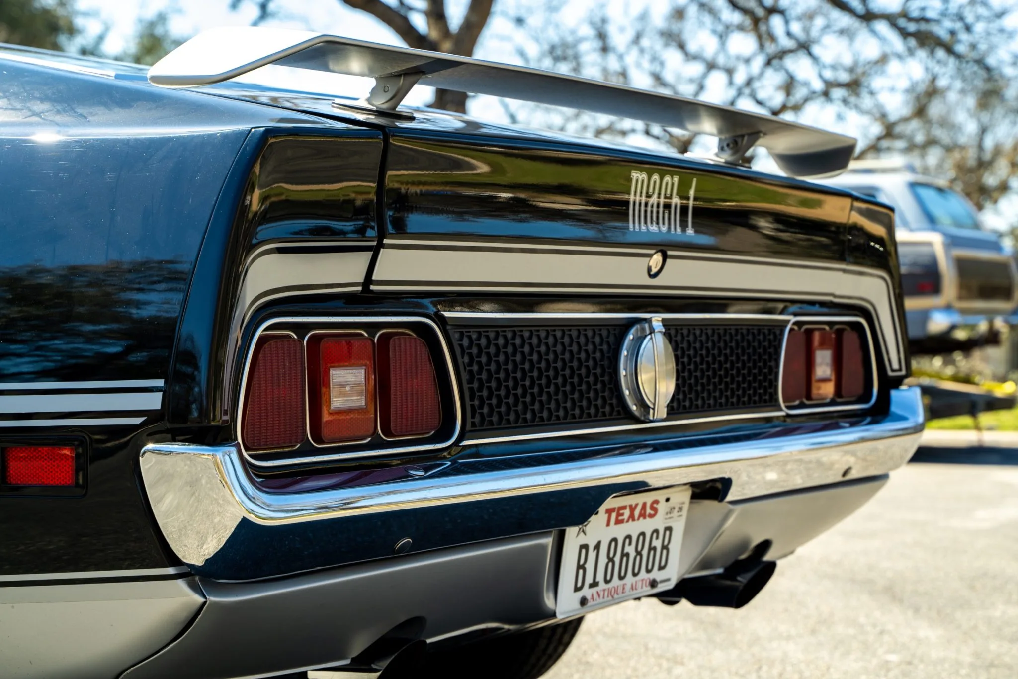 The 1971 Mustang Mach 1 came only on the “SportsRoof” fastback body style. All first generation Mach 1’s are distinguished by the body style code 63C on the door data plate. The Mach 1 also got other visual and performance enhancing items such as matte black hood treatment with hood pins, hood scoop (including optional Shaker scoop), competition suspension, chrome pop-open gas cap, revised wheels with Goodyear Polyglas tires, chrome exhaust tips (except 351W 2V), deluxe interior, livery and dealer optional chin spoiler, rear deck spoiler, and rear window louvers (SportSlats).
