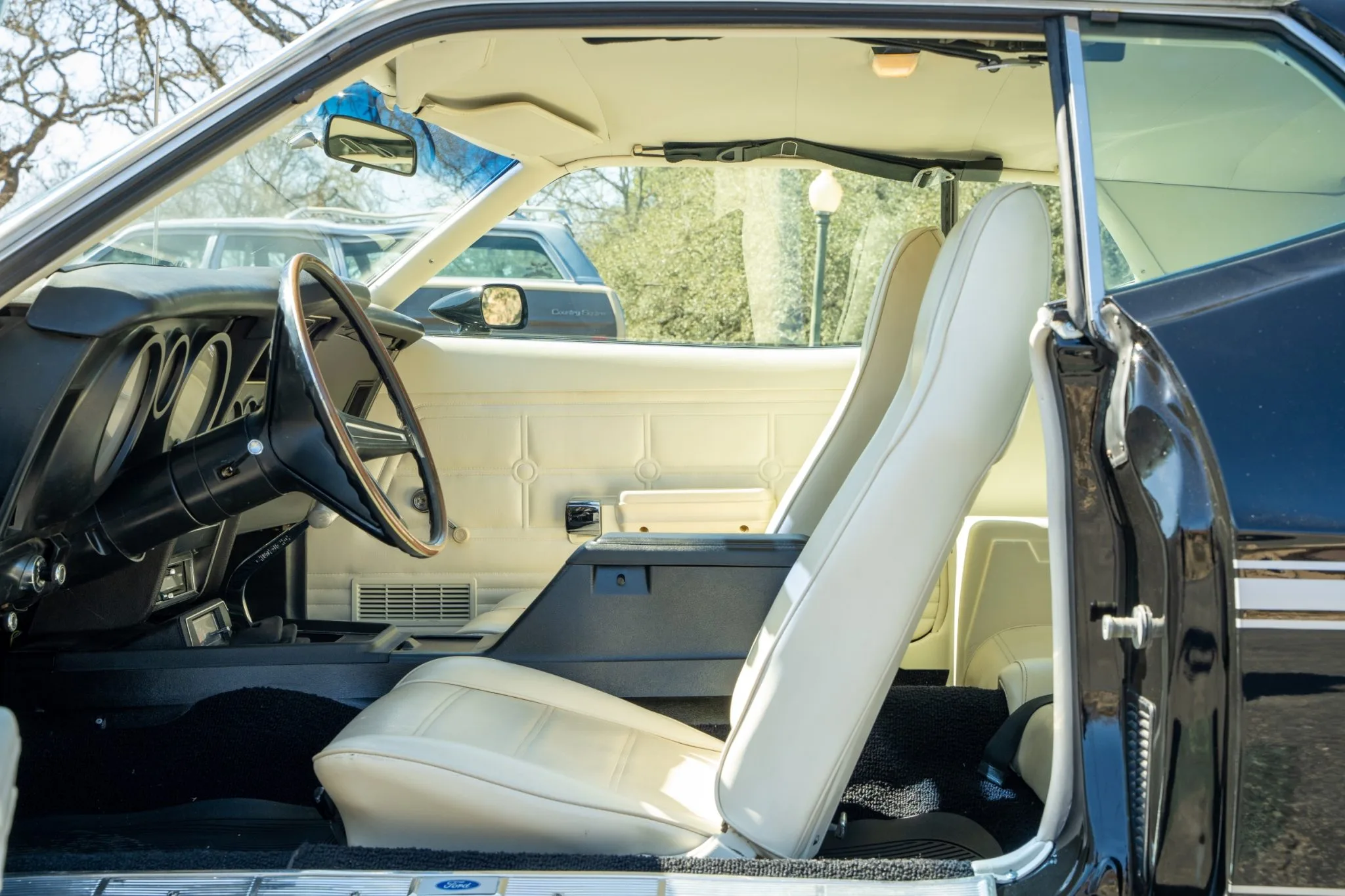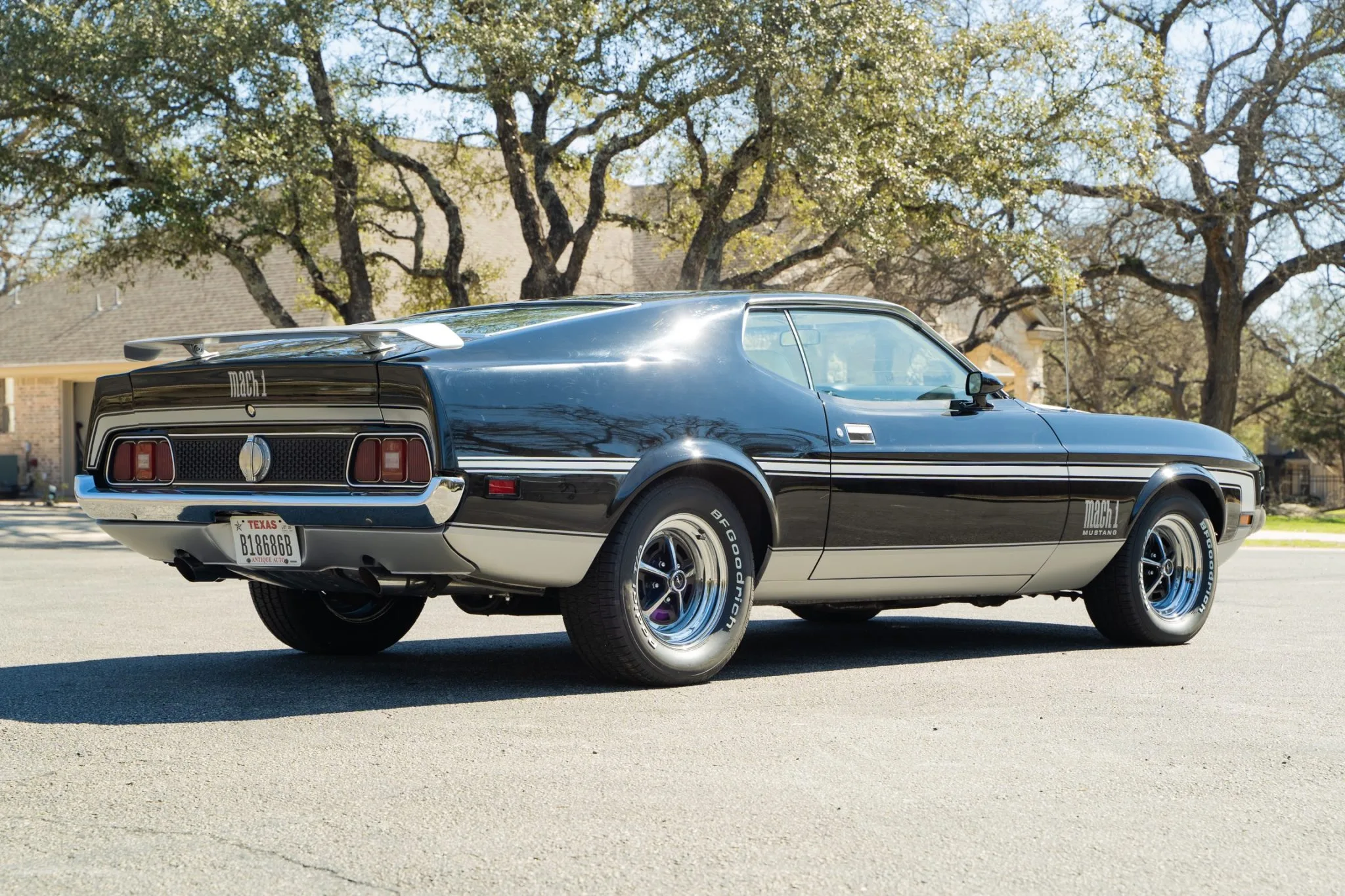 According to reports, this 1971 Mach 1 was originally painted in black when it left the factory, but it was repainted by the previous owner. The car comes equipped with silver Mach 1 graphics and side stripes, dual hood scoops, body-colored rearview mirrors, and dual exhaust outlets that exit below the rear fascia.
