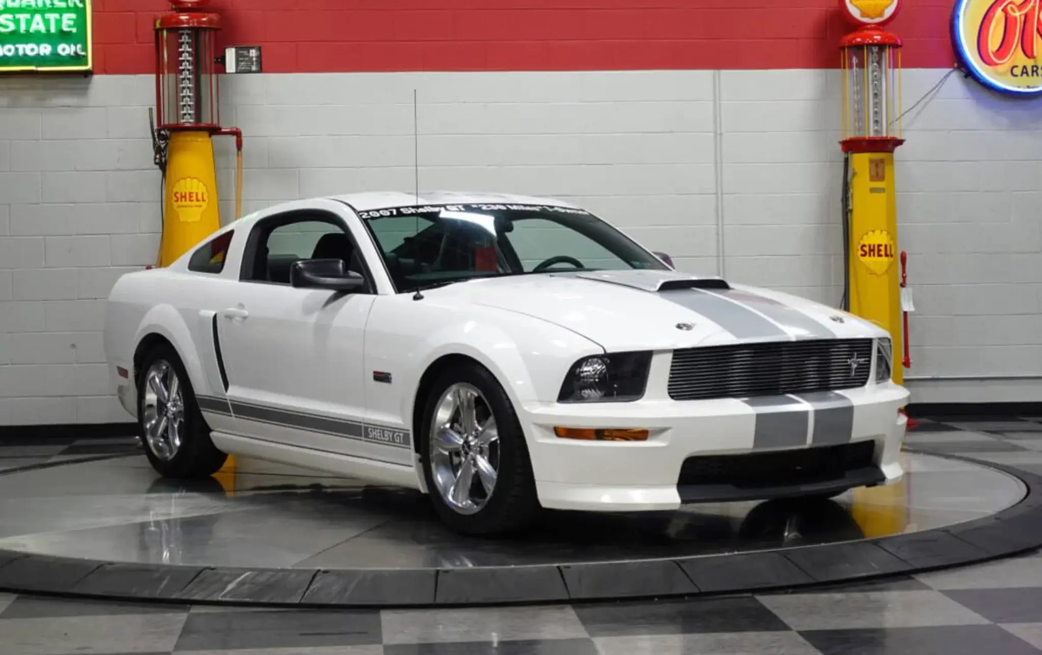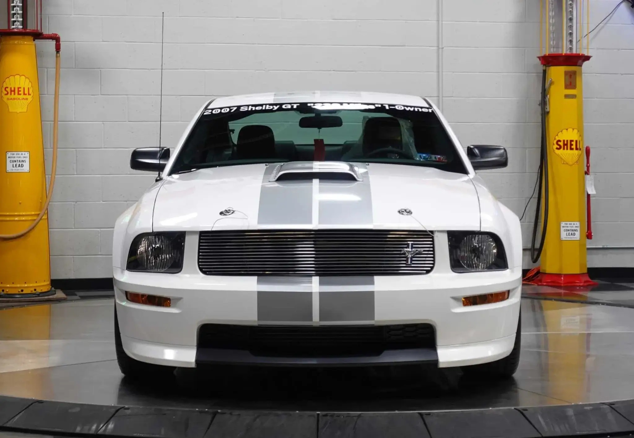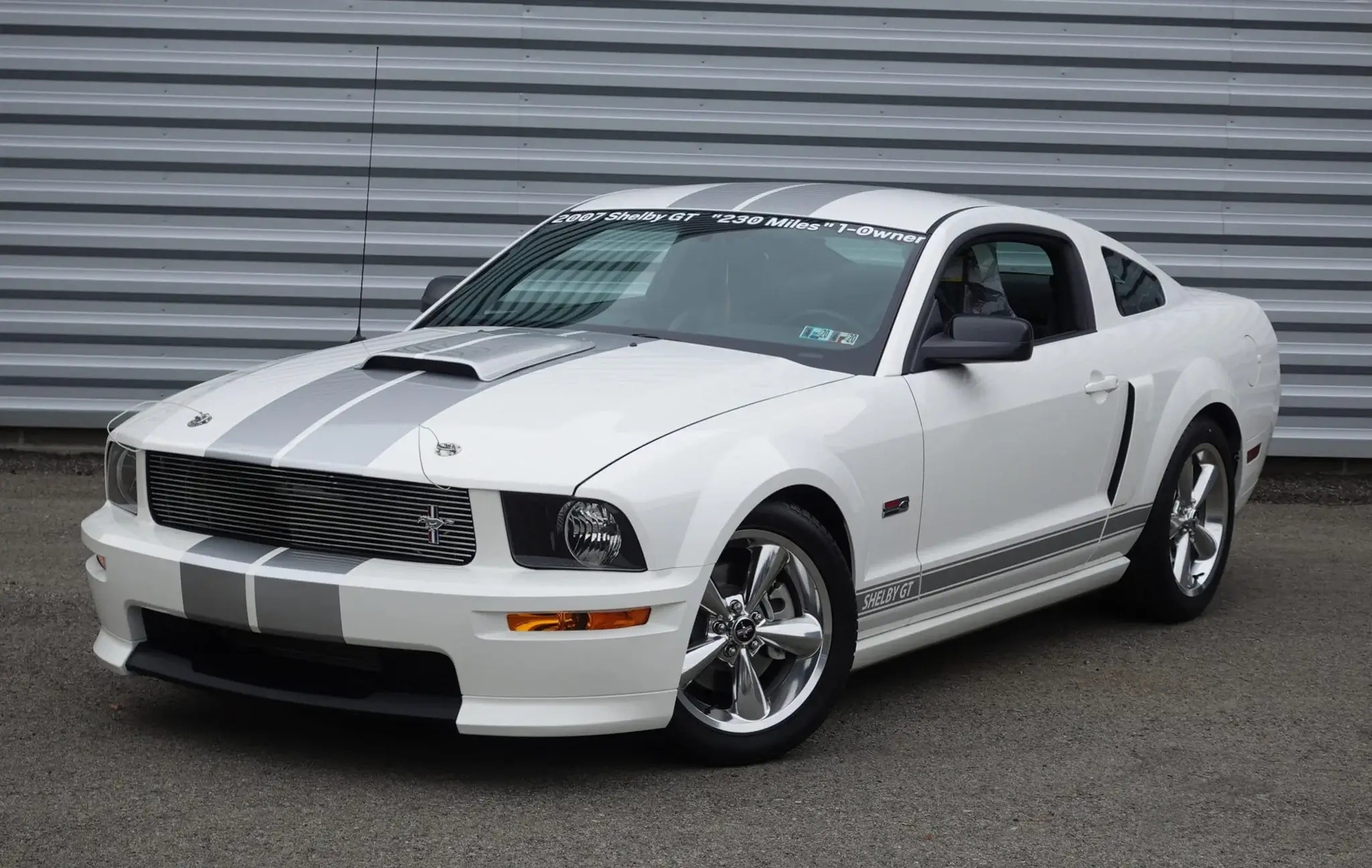 Now available on PCARMARKET, this 2007 Ford Shelby GT is a pristine example, showing just 233 miles on the odometer. It is finished in Performance White with silver racing stripes and rides on 18-inch polished aluminum wheels with original BF Goodrich g-Force T/A tires. Notable design elements distinguishing the Shelby GT from a standard Mustang GT include a unique front and rear fascia, hood scoop, hood pins, side scoops, a billet front grille insert, and Shelby badging.