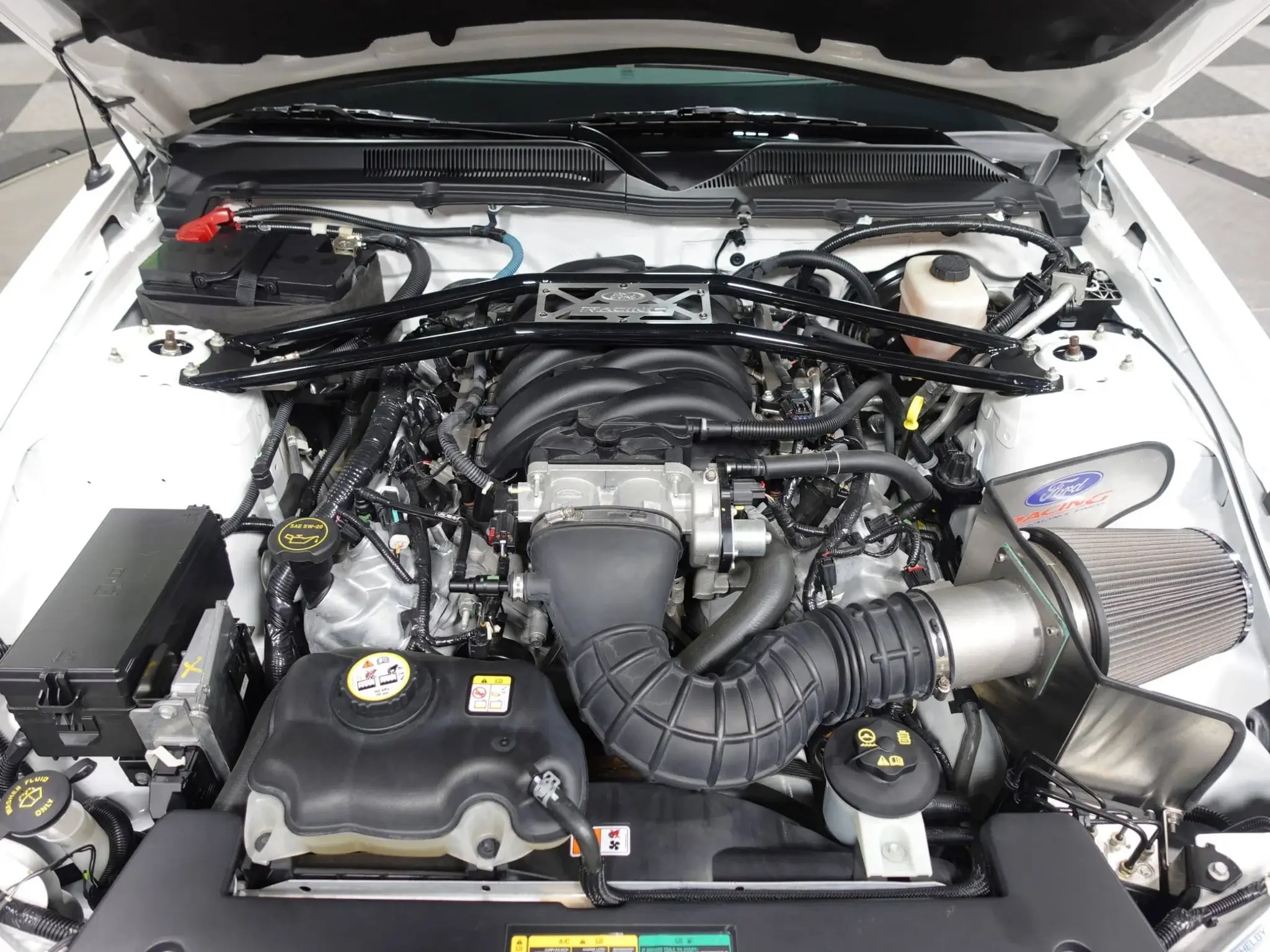 The 4.6L V8 has a 90mm cold air intake, Pro-Cal Performance Calibration, and a high-flow X-pipe exhaust with performance mufflers. It delivers 319 HP and 330 lb.-ft of torque to the rear wheels through a Tremec TR3650 5-speed manual transmission and a limited-slip differential with a 3.55:1 gear ratio.