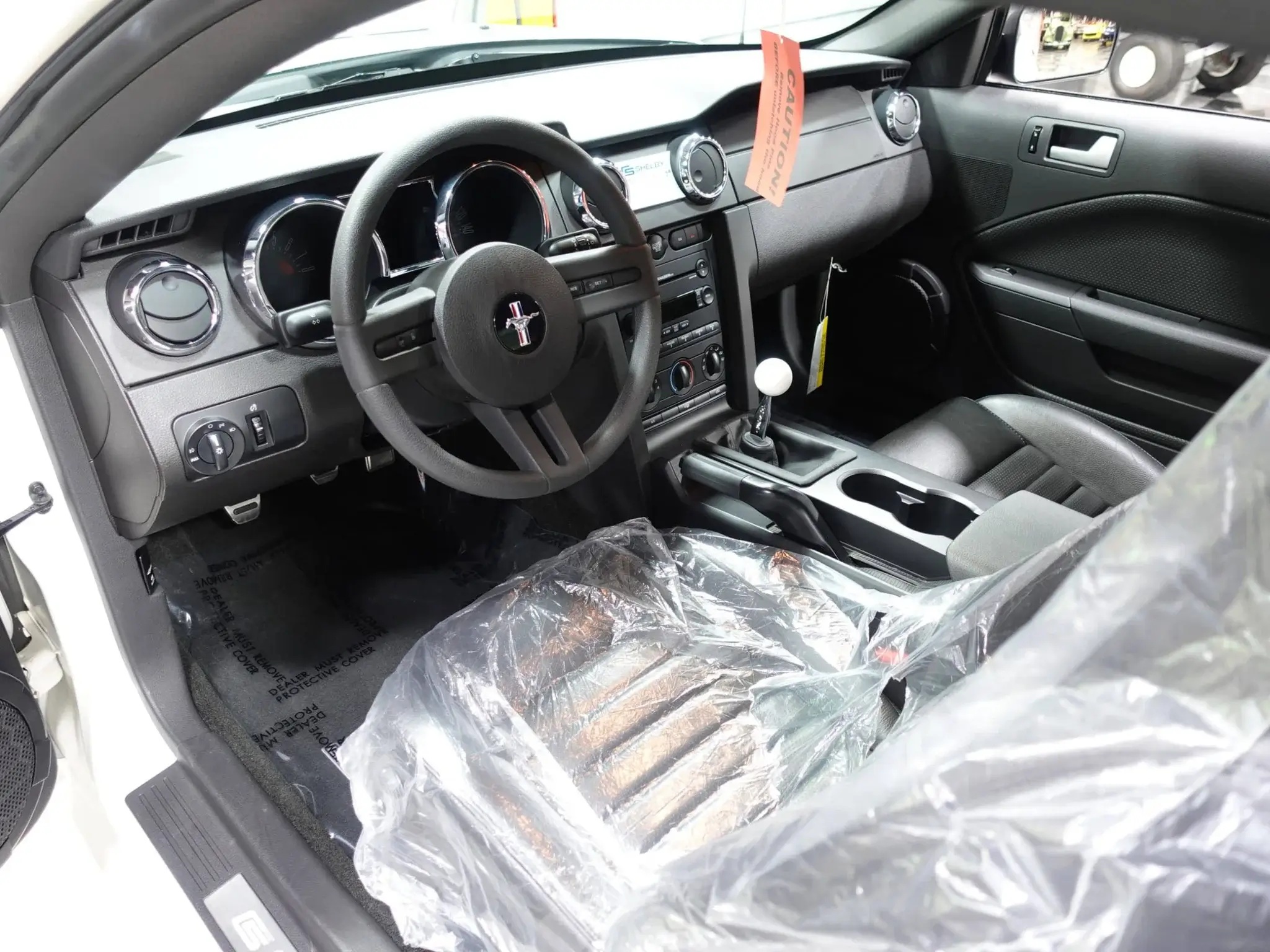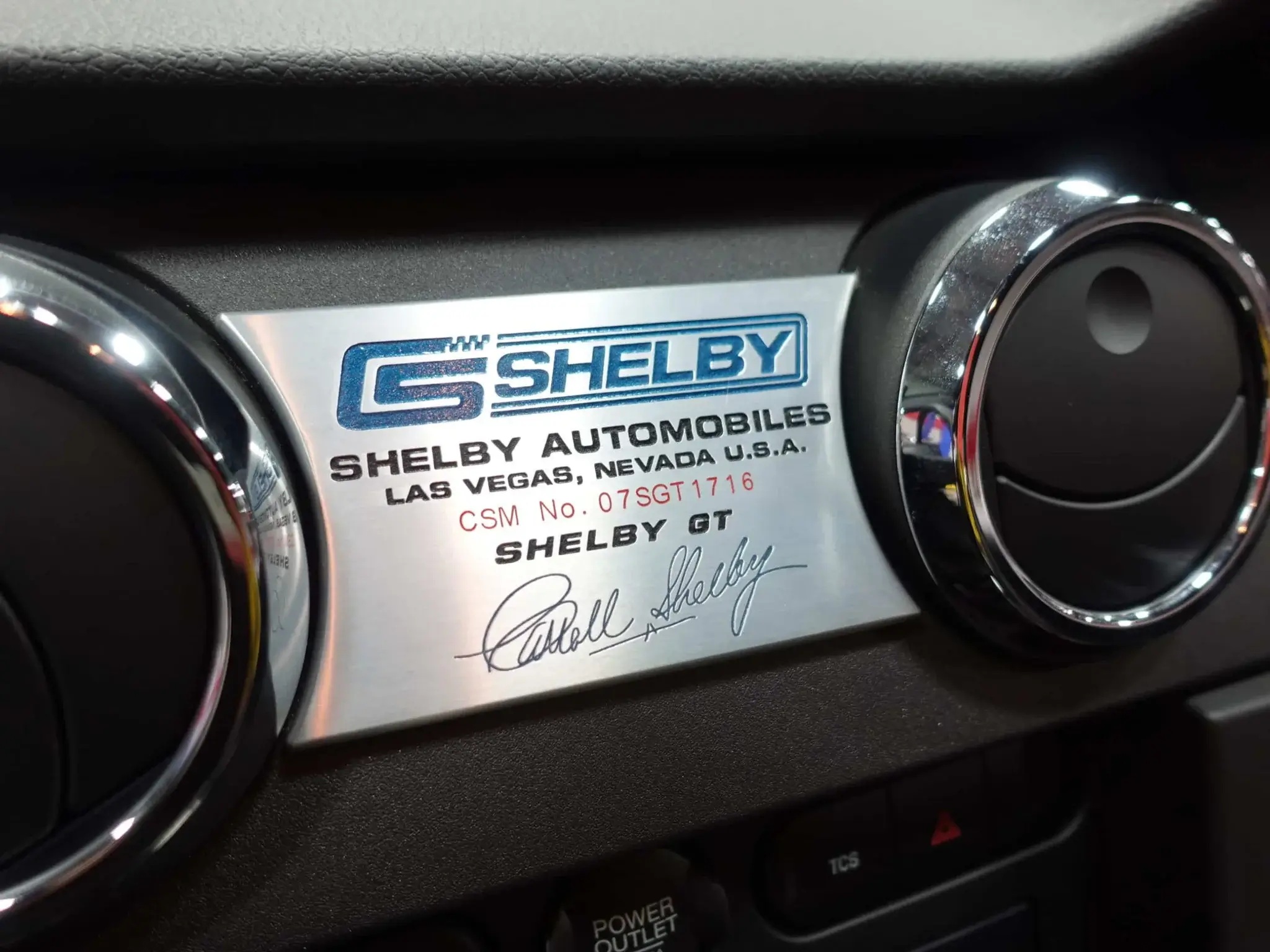 The Dark Charcoal leather cabin features a power driver’s seat, GT-branded door sills, a Hurst short-throw shifter, a three-spoke leather steering wheel, and an aluminum plaque marking it as #1,716 of the production run. Other features include air conditioning, cruise control, keyless entry, Shelby-embroidered floor mats, and a Shaker 1000 audio system.