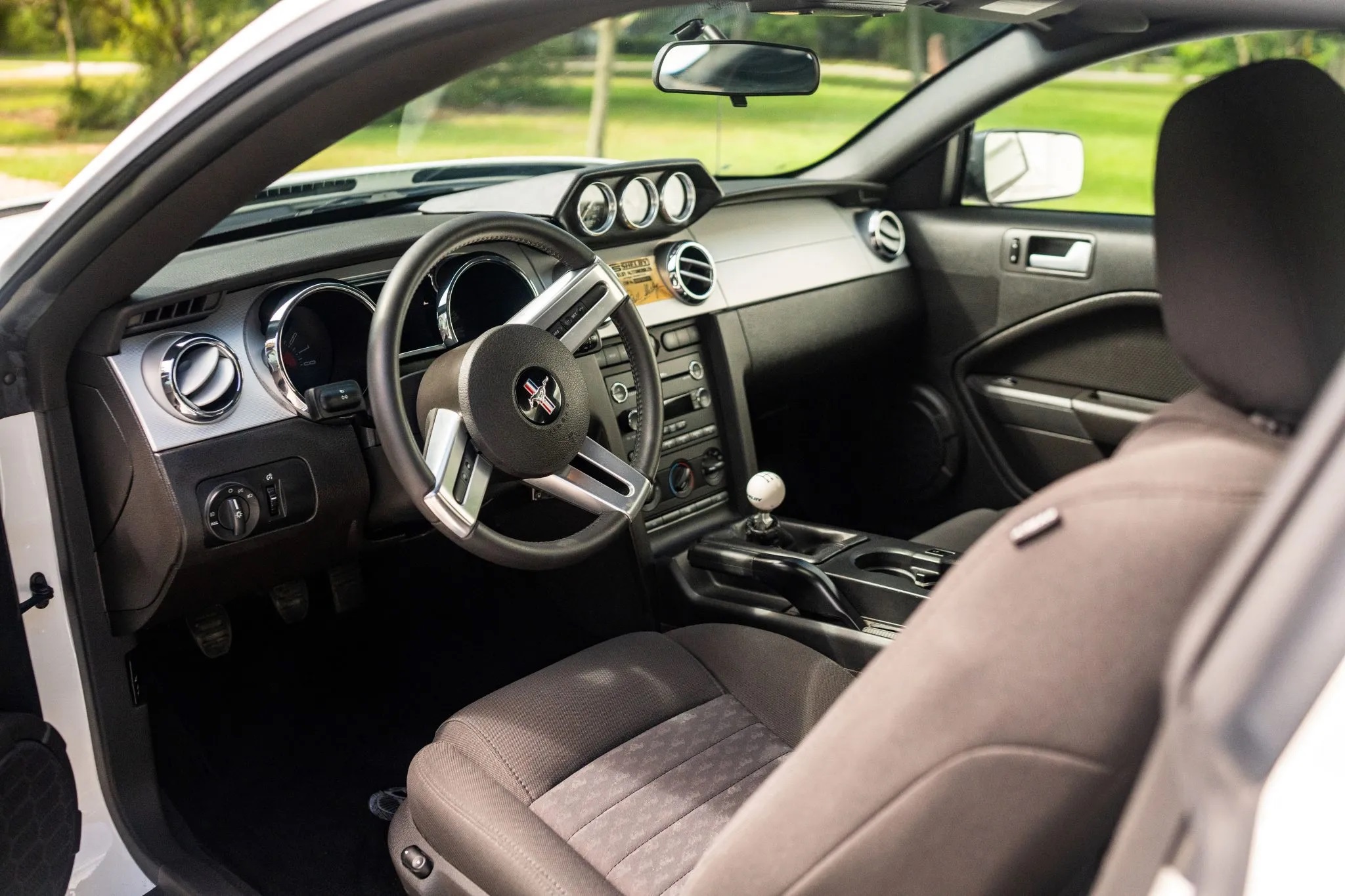 This Performance White car boasts the Shelby Turbo Package, which adds a GT-H front bumper cover, “Deep Draw” hood with hood pins, a bar grille, and Shelby Turbo graphics on the hood and quarter panels. Exterior extras comprise a rear spoiler, power-adjustable side mirrors, faux quarter panel vents, and dual exhaust outlets. Rolling on chrome 18″ wheels with 255/45 front and 285/40 rear Goodyear Eagle F1 Supercar tires from 2007. It benefits from upgraded suspension with a revised rear sway bar and performance springs. Braking power comes from four-wheel disc brakes featuring Shelby-branded Baer six-piston front calipers, single-piston rear units, and cross-drilled and slotted rotors at each corner.