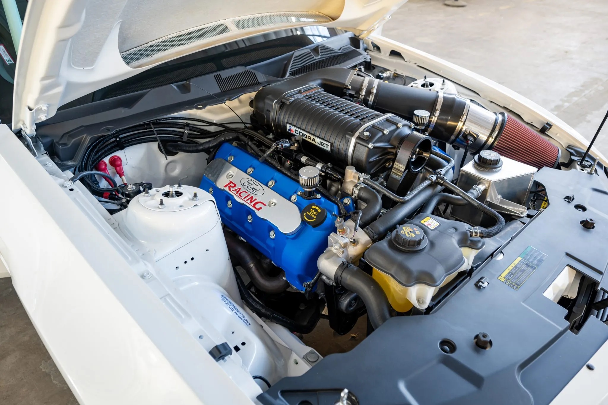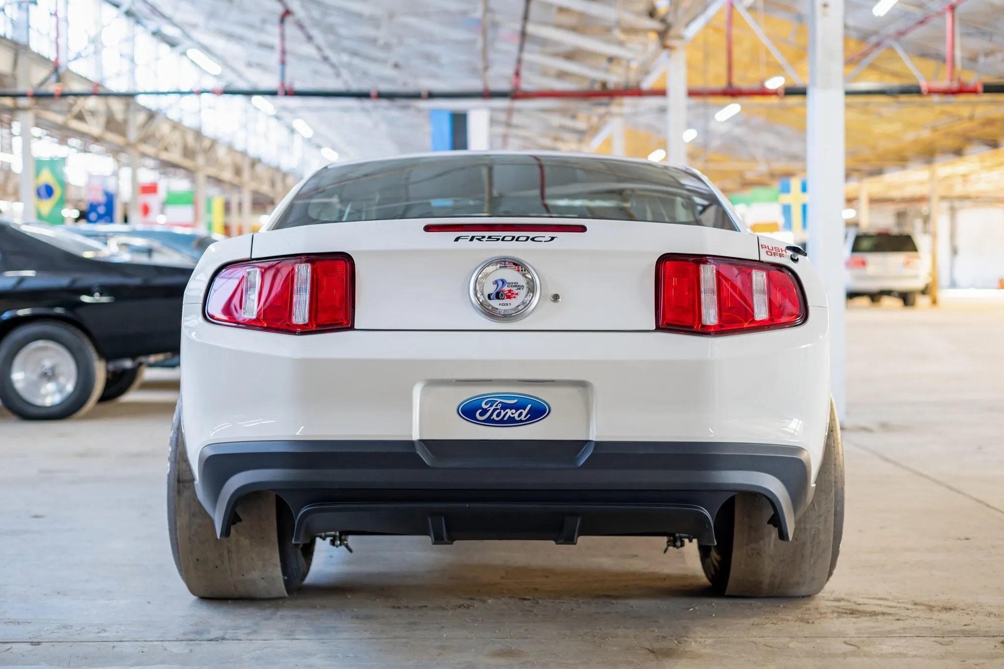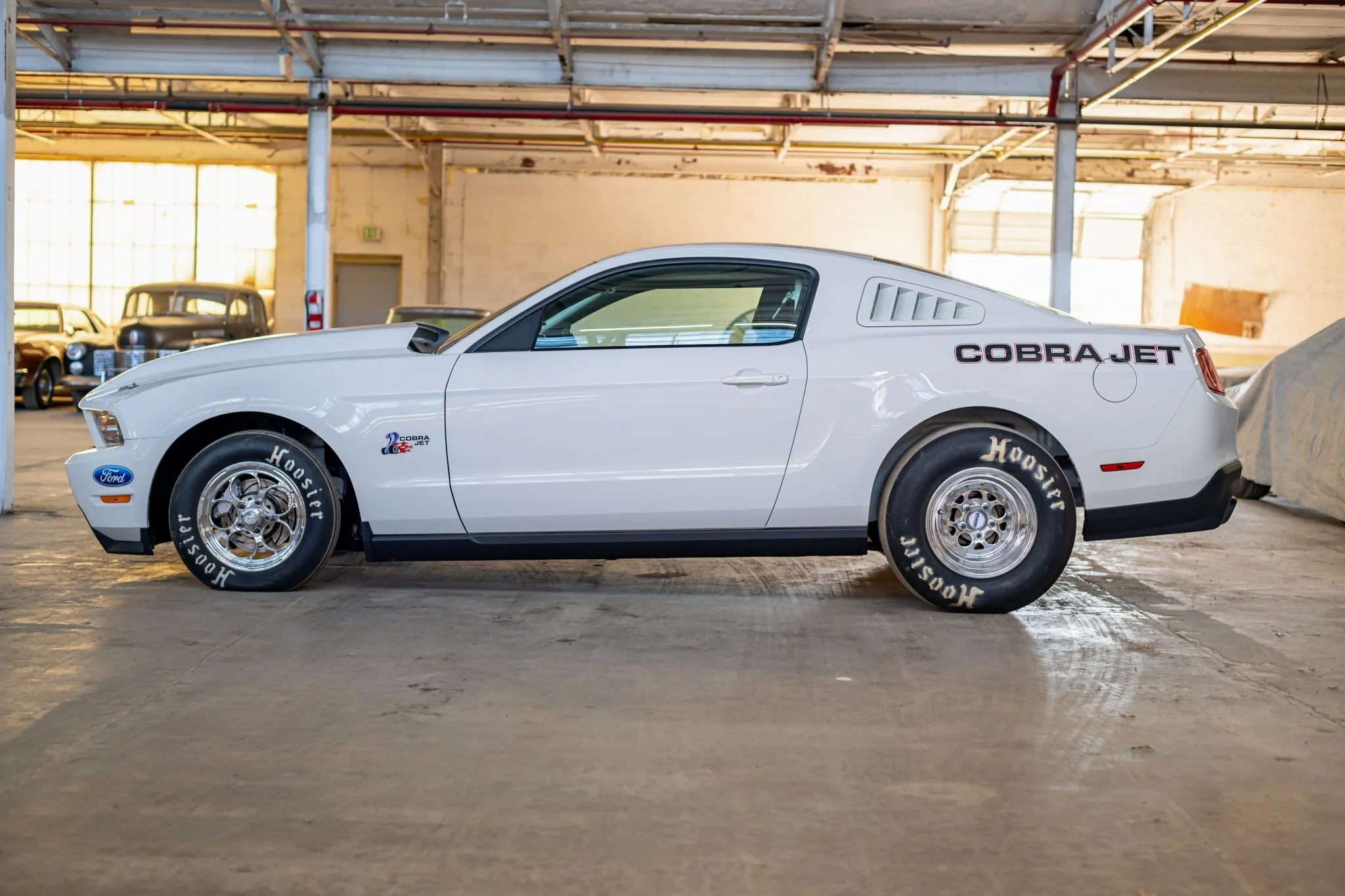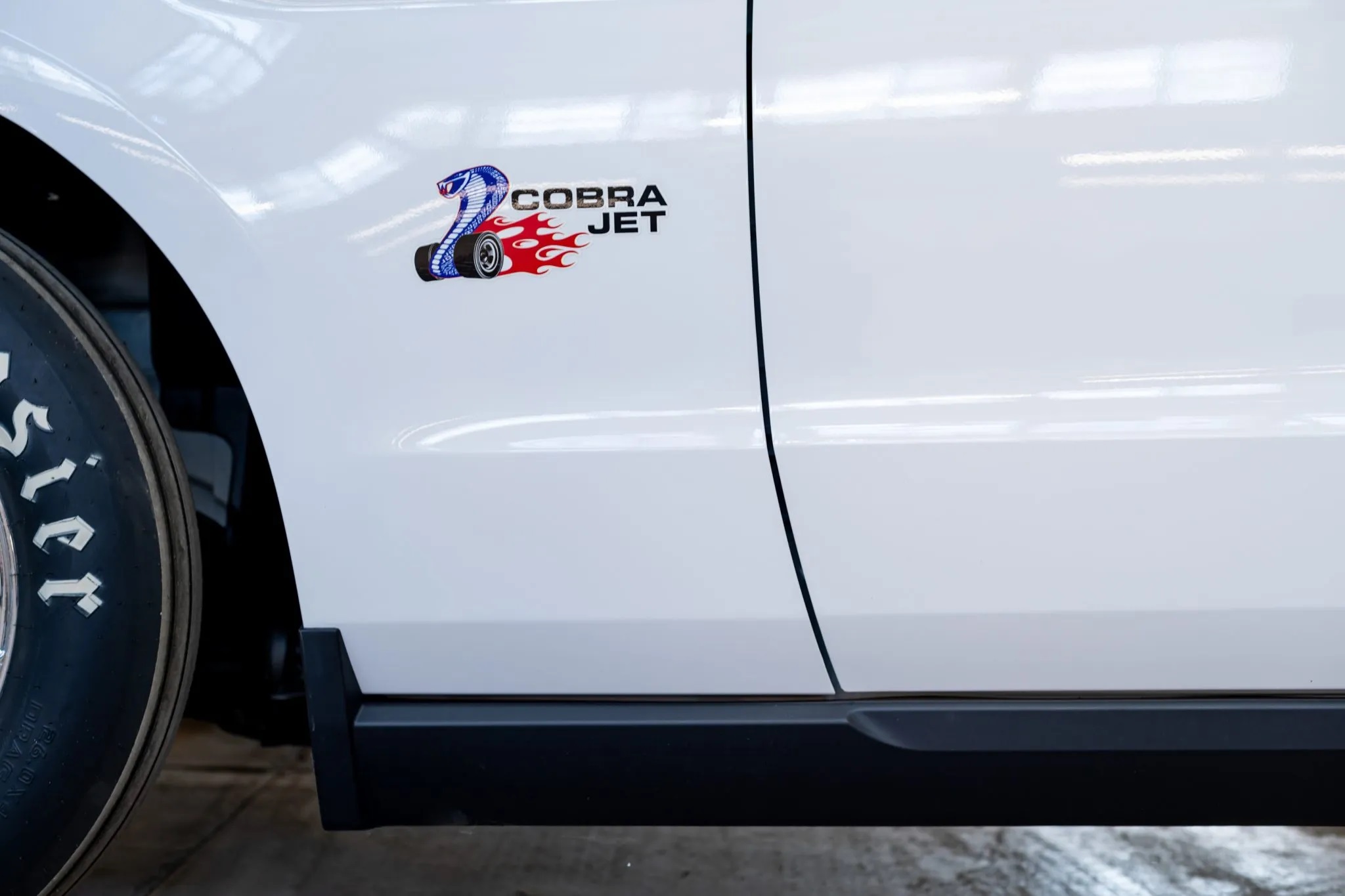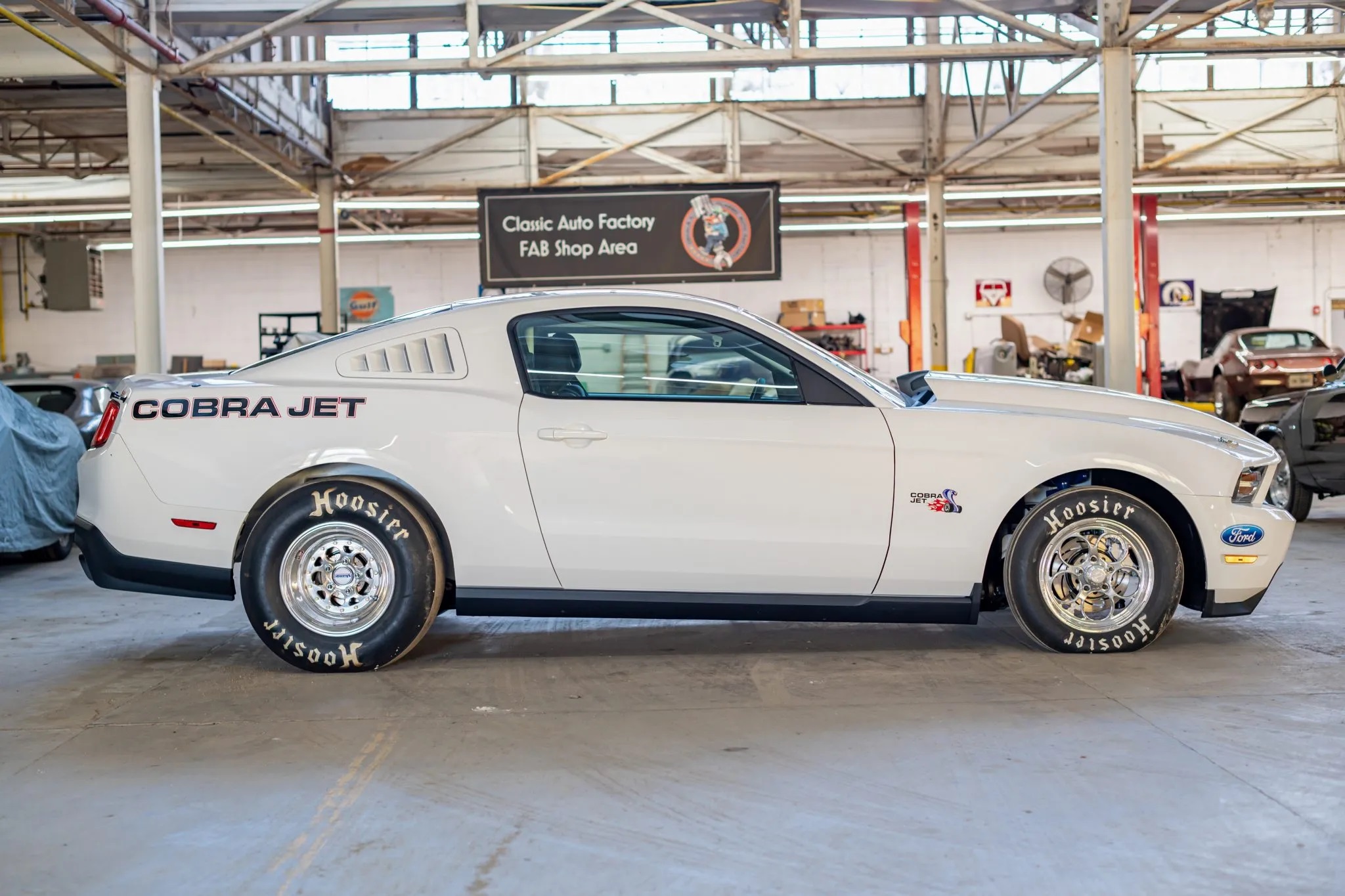 Finished in Performance White with black cloth upholstery, it features a cowl hood, Cobra Jet graphics, louvered quarter window covers, a rear diffuser, 15″ forged Weld Racing wheels, Strange Engineering four-piston brake calipers, Ford Racing adjustable dampers, bucket seats, RJS Racing harnesses, and a roll cage.