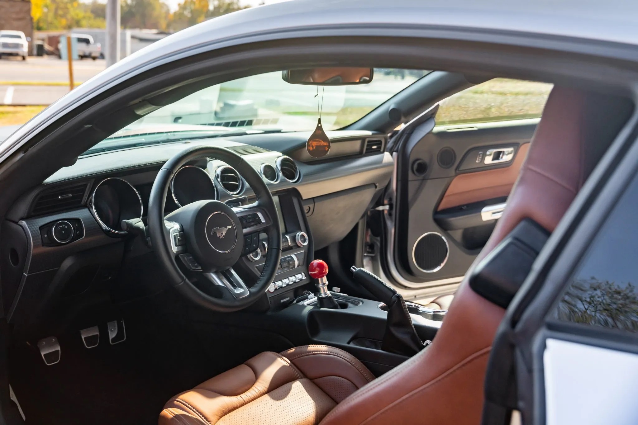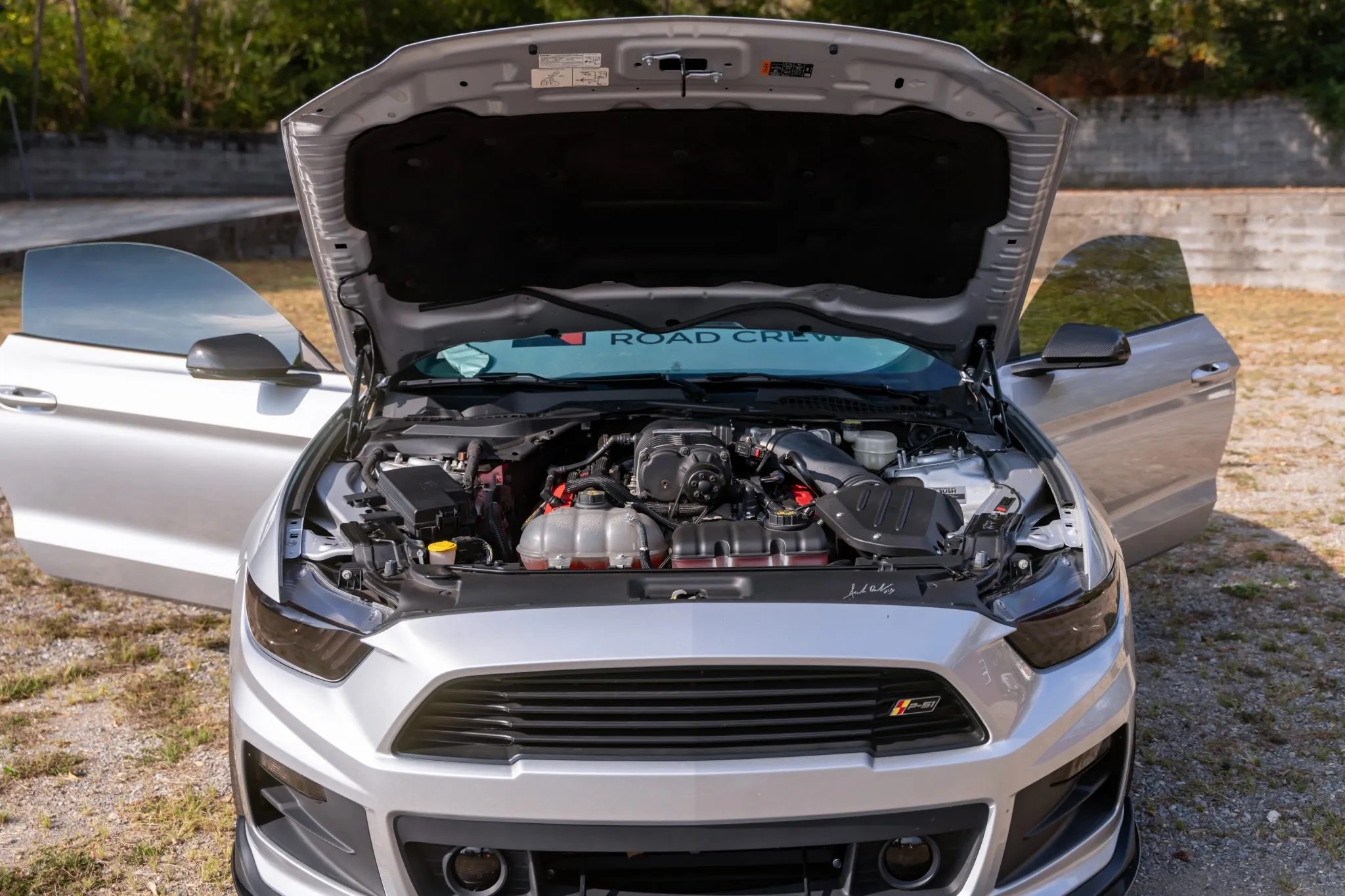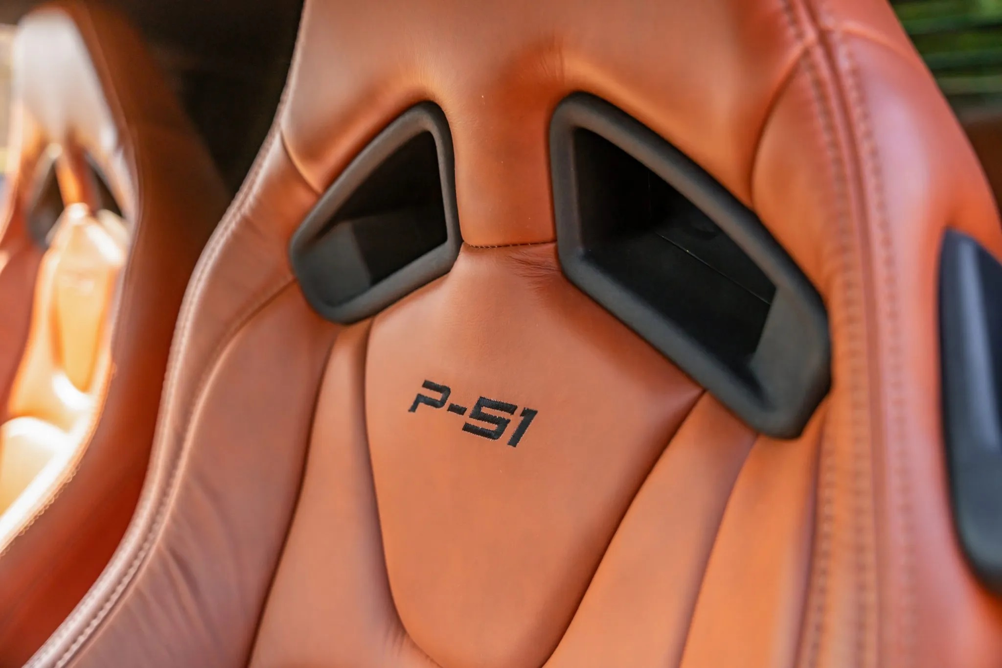 Performance is at the heart of the P-51, thanks to its Roush Stage 2 supercharger producing 727 horsepower and 610 lb-ft of torque, paired with a six-speed manual transmission and a limited-slip differential. Handling is enhanced by a sporty suspension, Brembo brakes, and lightweight 19-inch Weld wheels wrapped in sticky Continental tires, ensuring the car grips the road with precision.