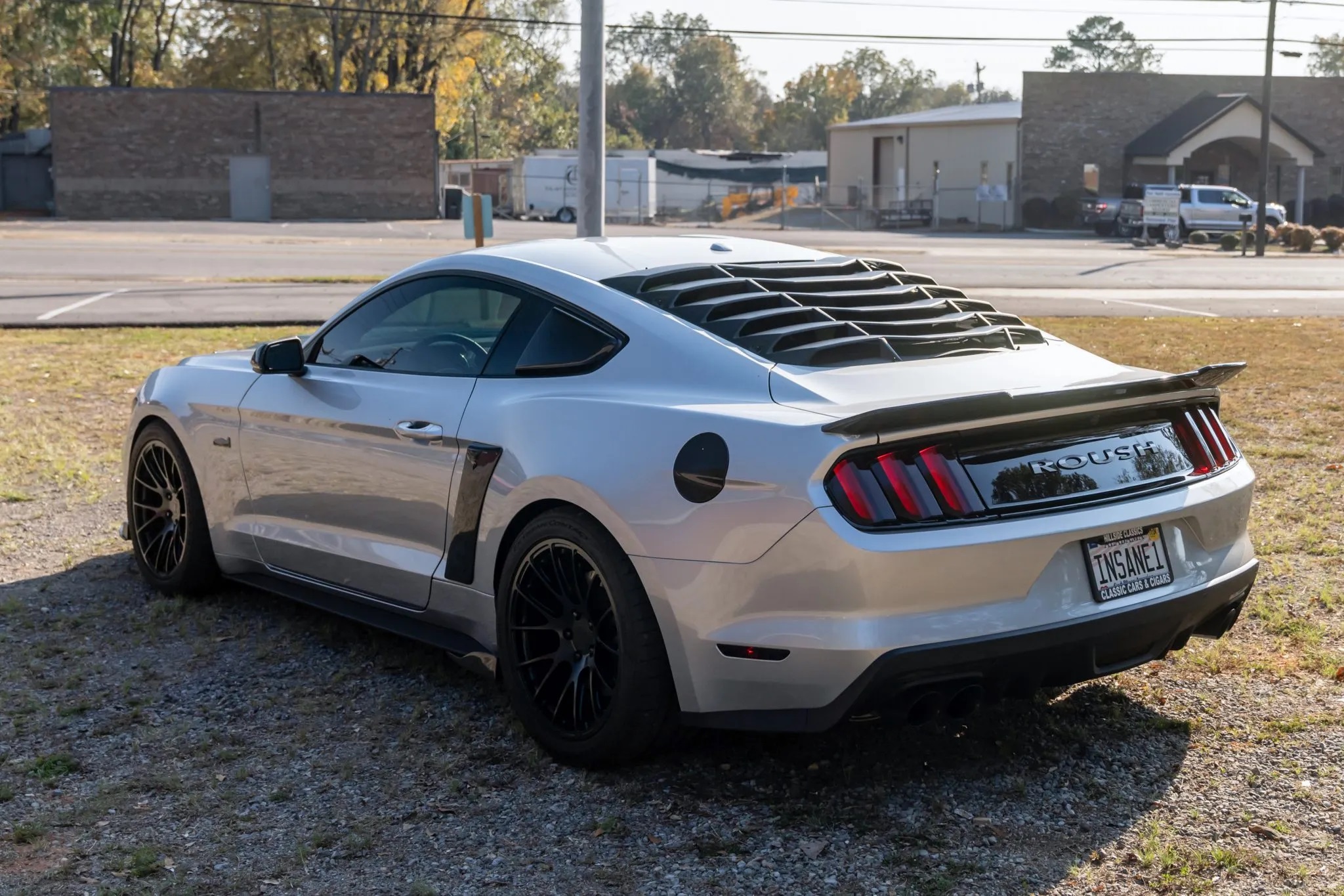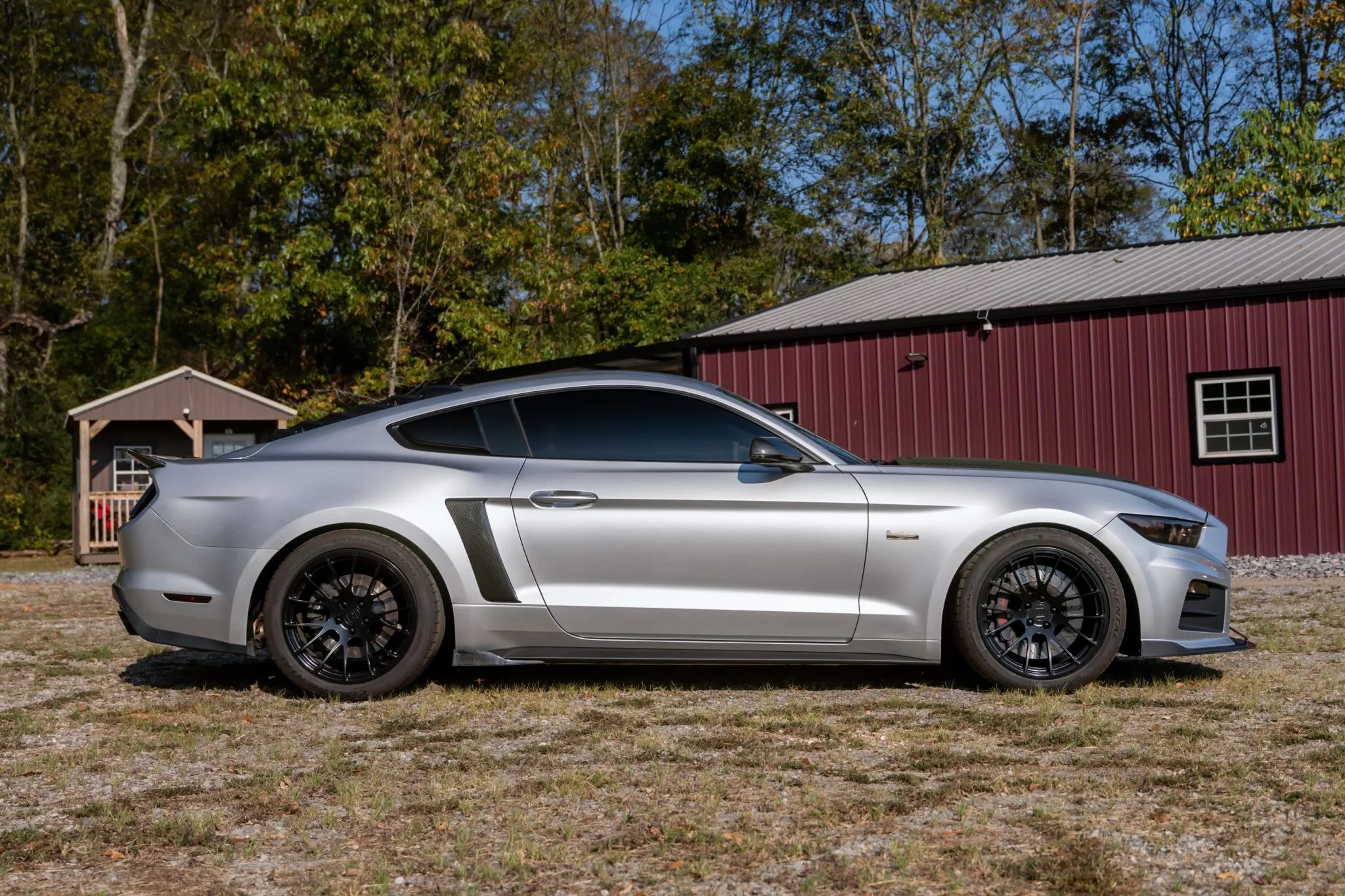 The P-51’s unique Ingot Silver Metallic finish is complemented by a host of carbon fiber elements and a distinctive stripe-and-decal package. These details, including an Army-green P-51 hood stripe, hood and rear-quarter scoops, and various Roush and P-51 badges, evoke the fighter plane’s legacy. The Aerobody Kit sets it apart from other Roush Mustangs, with an aggressive front fascia, carbon-fiber splitter, blacked-out tail panel, and carbon-fiber spoiler, among other enhancements.