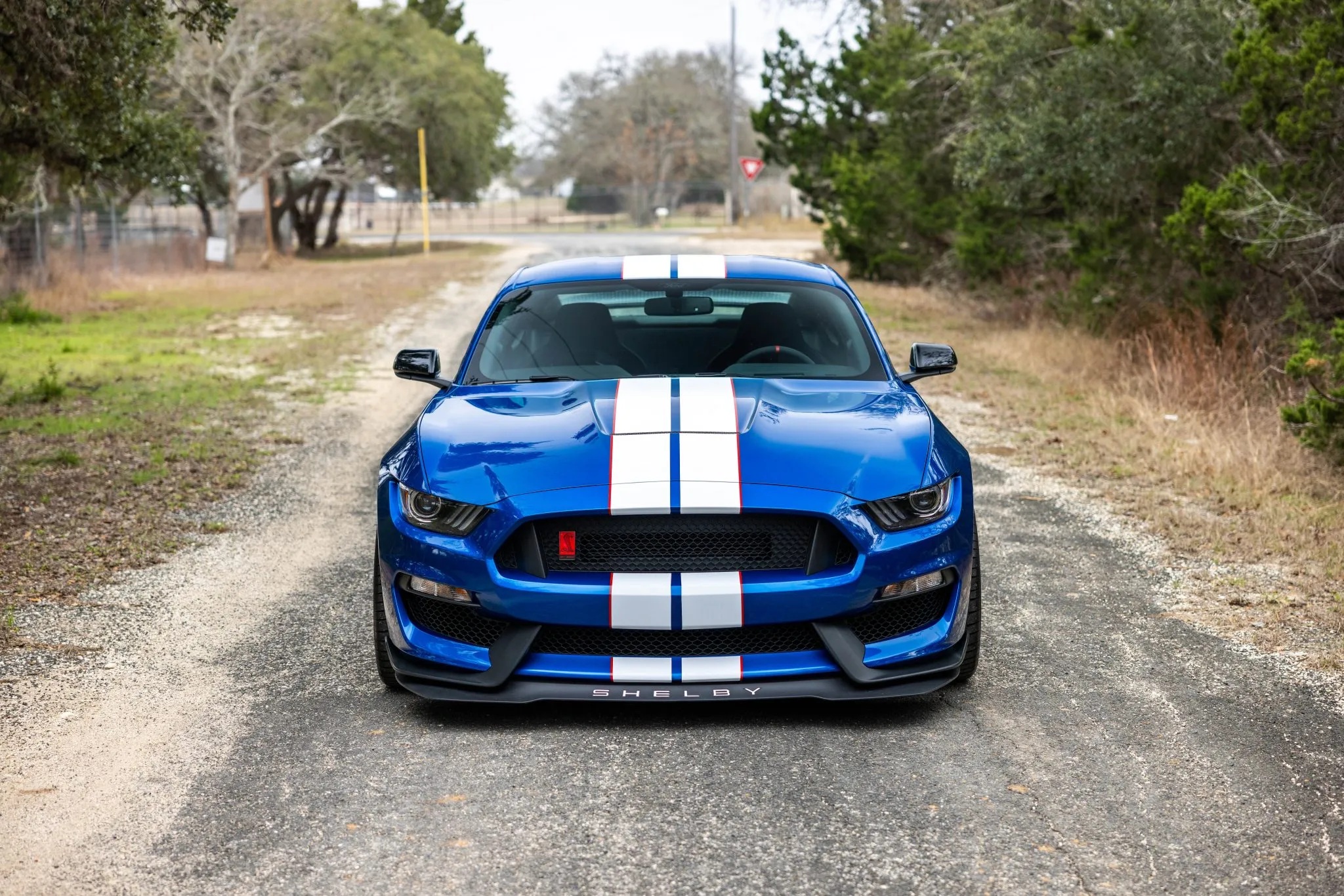 This 2017 Shelby GT350R, finished in Lightning Blue Metallic with white and red racing stripes, has just 587 miles on the odometer. Factory-equipped with carbon-fiber wheels, a carbon-fiber wing, MagneRide dampers, and Brembo brakes, it also includes the R-Electronics Package with a touchscreen infotainment system and navigation. Inside, Recaro sport bucket seats are trimmed in Ebony cloth and Miko suede, with a rear-seat delete exclusive to the R model.