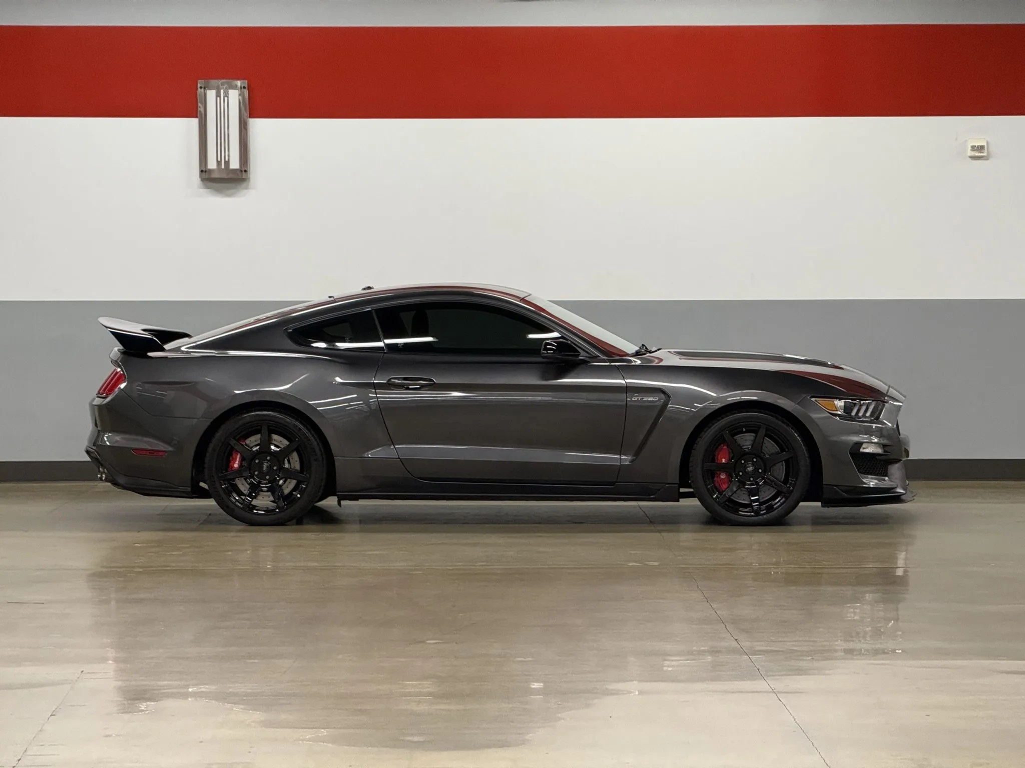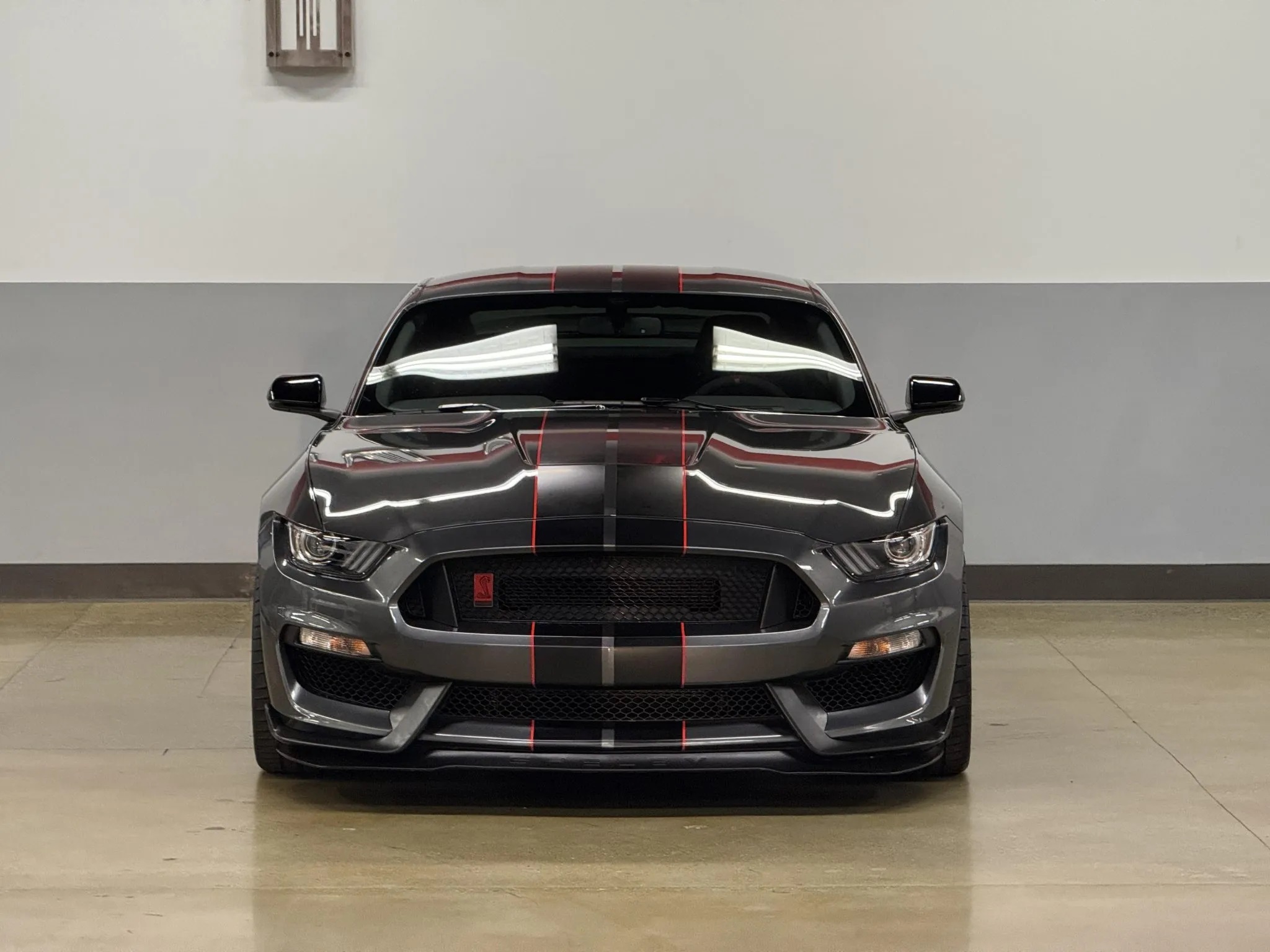 This well-equipped GT350R boasts features like Track Apps, Launch Control with Line Lock, keyless entry, HID projector headlights, an auto-dimming rearview mirror, quad-tip exhaust, and more. Optional upgrades include striking red and black racing stripes, the R-Electronics Package, 19″ replica seven-spoke wheels, Brembo brake calipers, a carbon-fiber rear wing, a touchscreen infotainment system with voice-activated navigation, a rearview camera, and supportive Recaro seats.