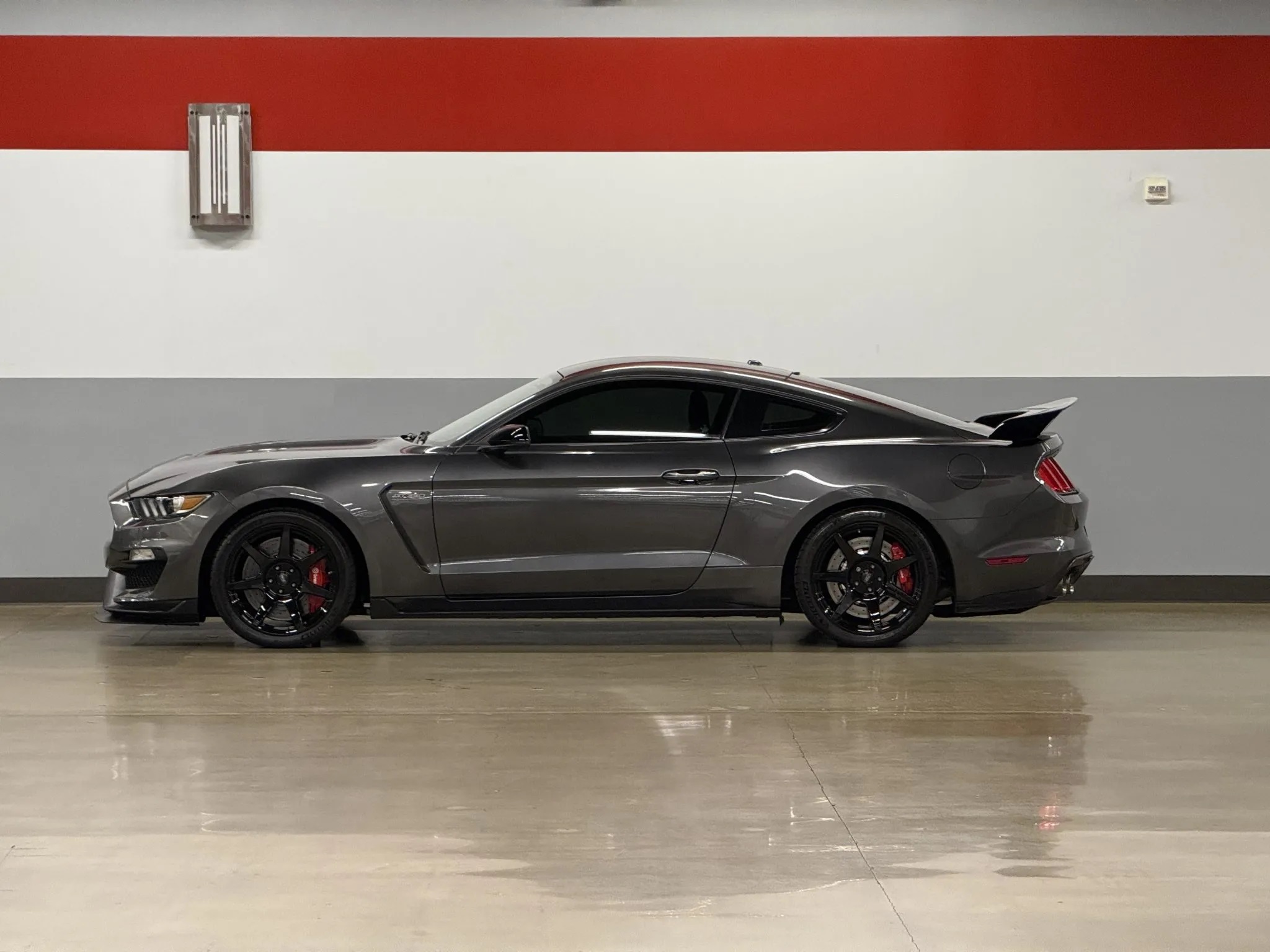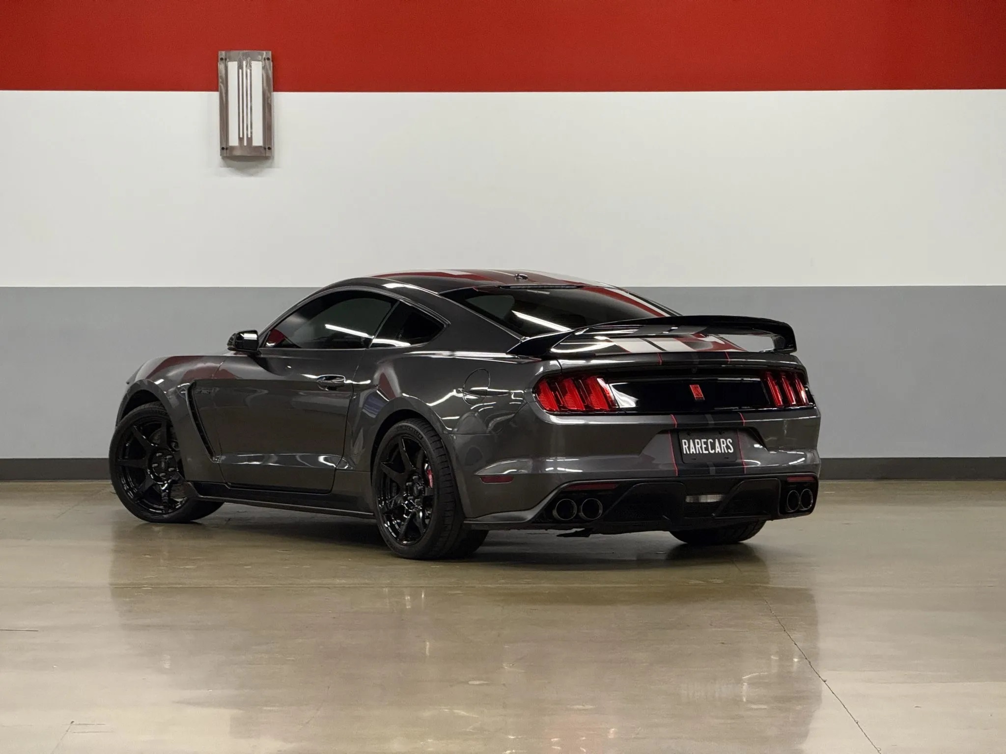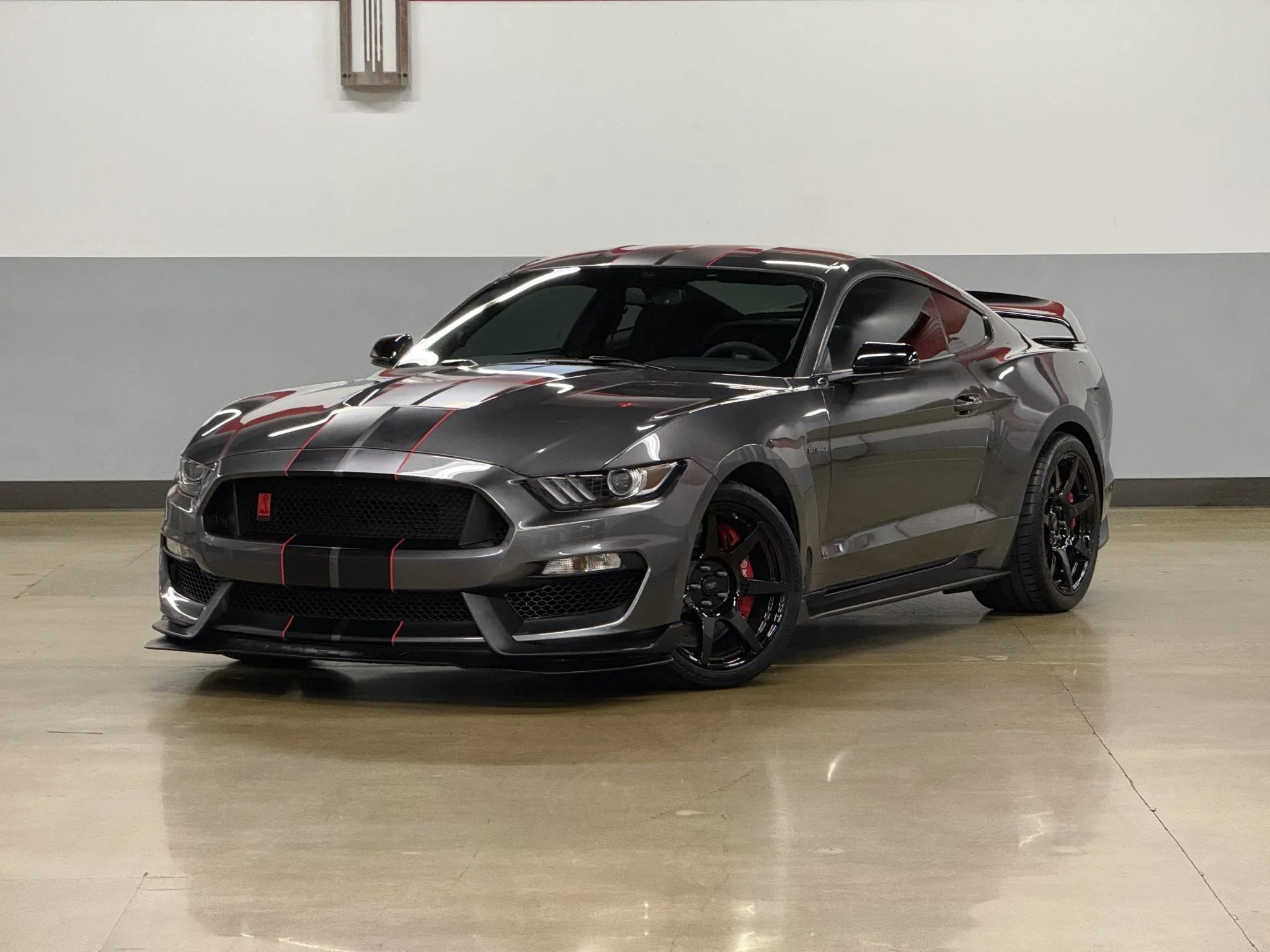The engine pairs with a dual-mass flywheel, a twin-disc clutch, and a revised Tremec TR3160 6-speed manual transmission, sending power to a Torsen 3.73:1 limited-slip differential. The GT350R also features Magneride adaptive damping, Brembo disc brakes, quad-tip dual exhaust, air conditioning, an AM/FM stereo, and HID headlights.