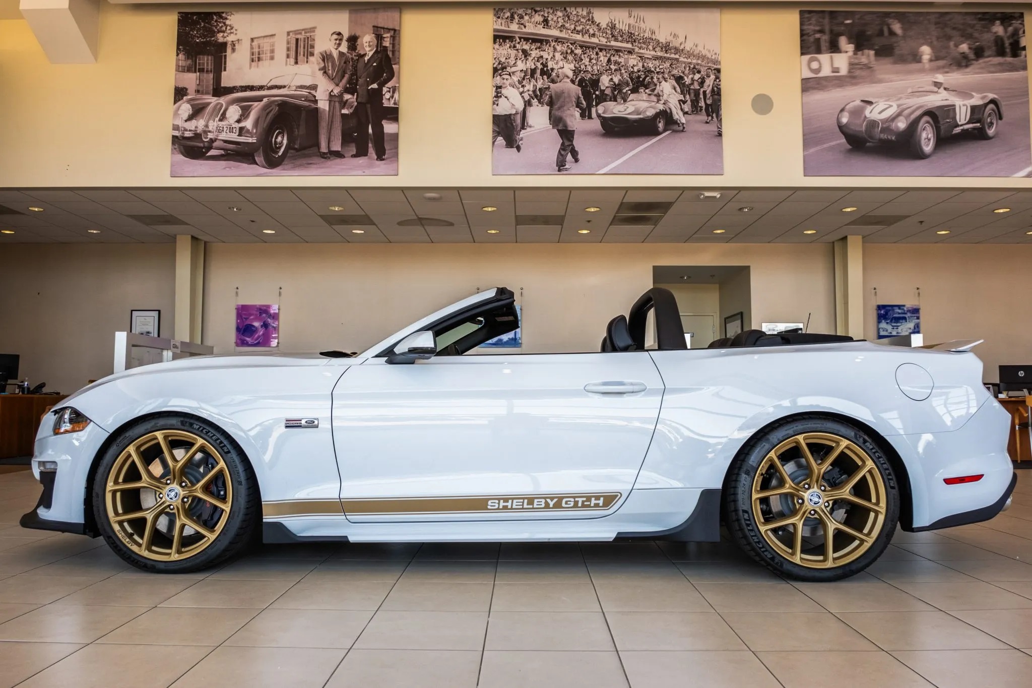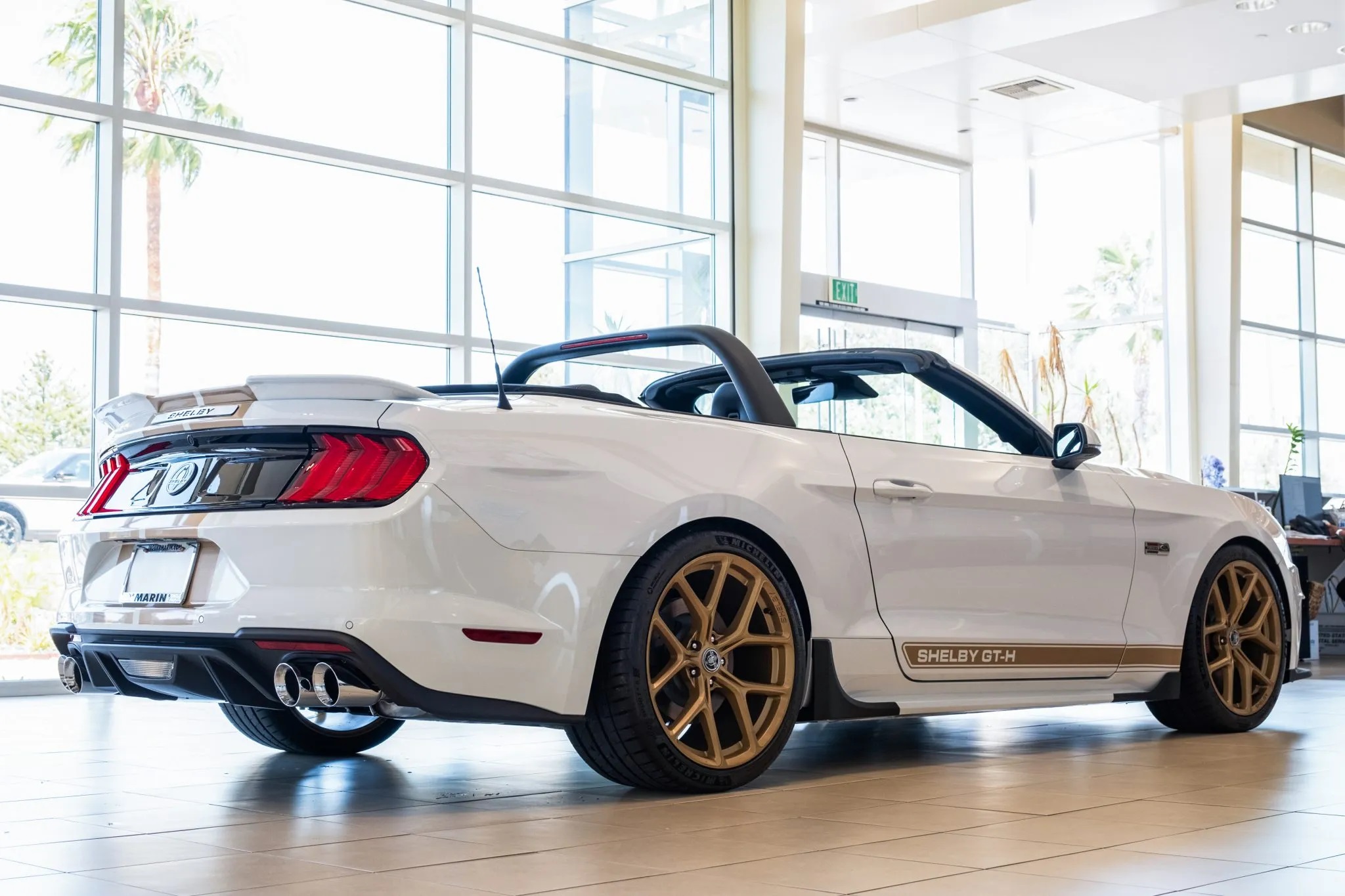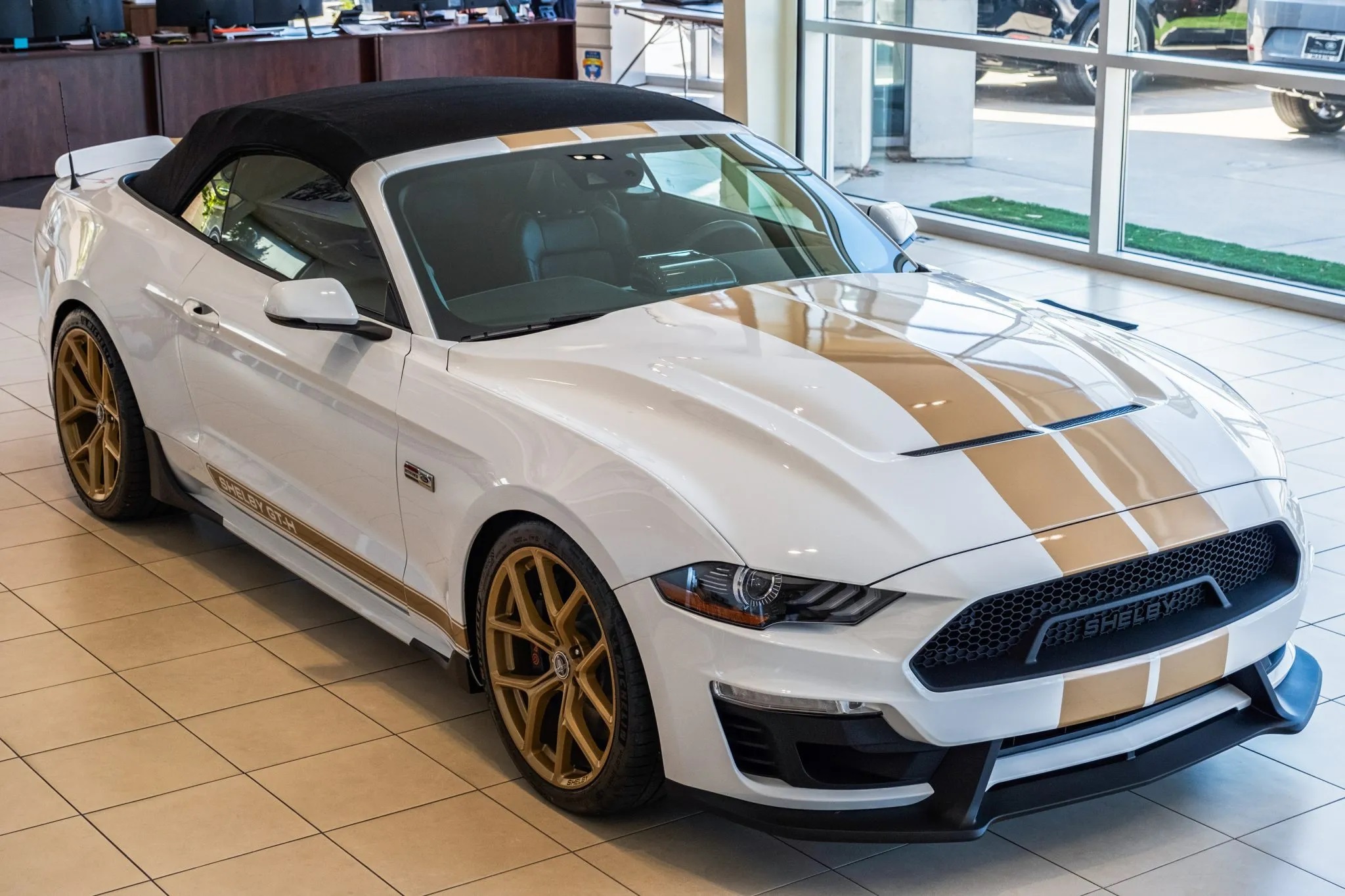 This striking 2019 Ford Mustang Shelby GT-H convertible, a Heritage Edition modified by Shelby American, is finished in Oxford White with gold vinyl accents over an Ebony leather interior. It is now offered for sale on Bring A Trailer with just 199 miles on the odometer.