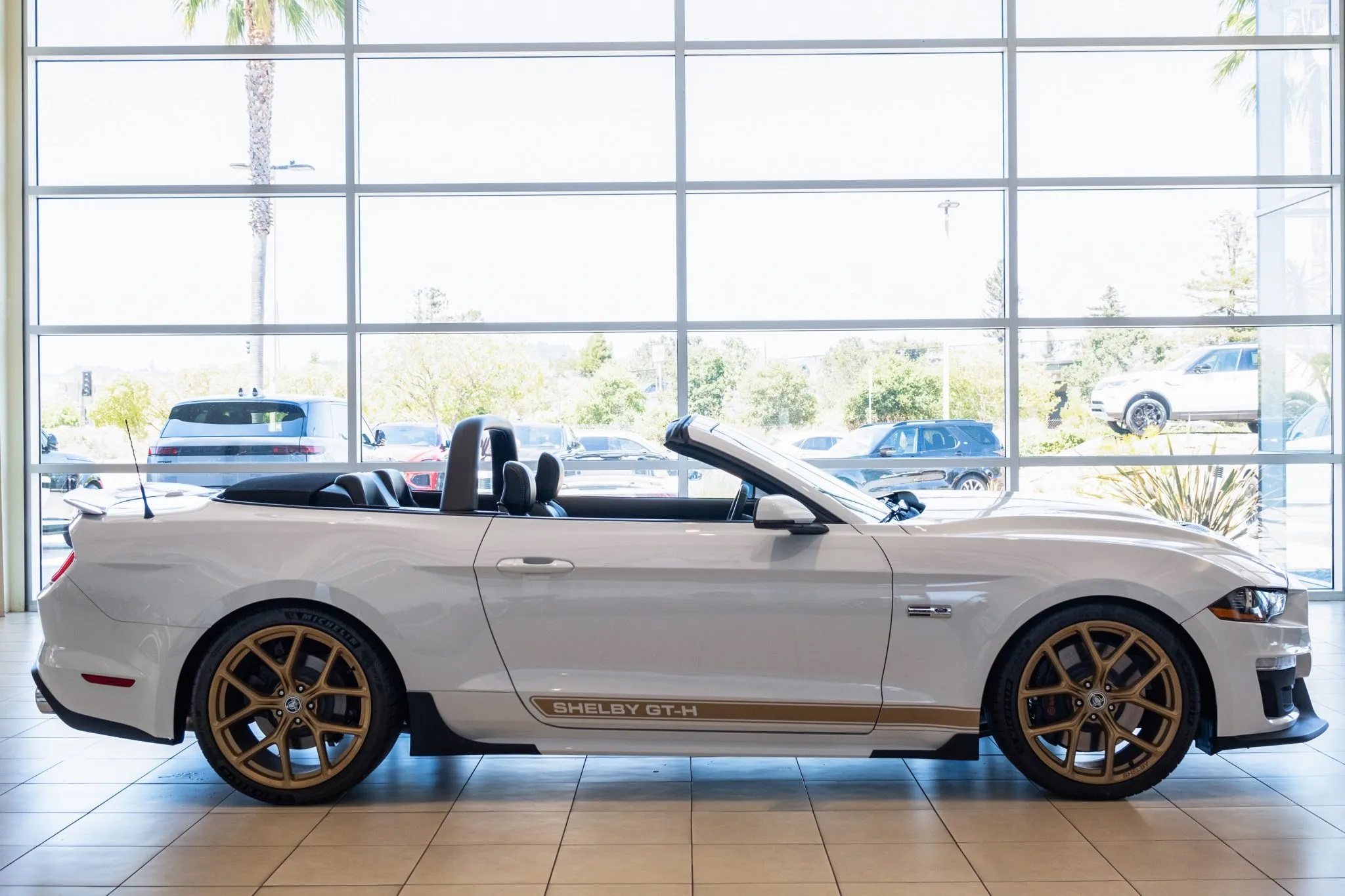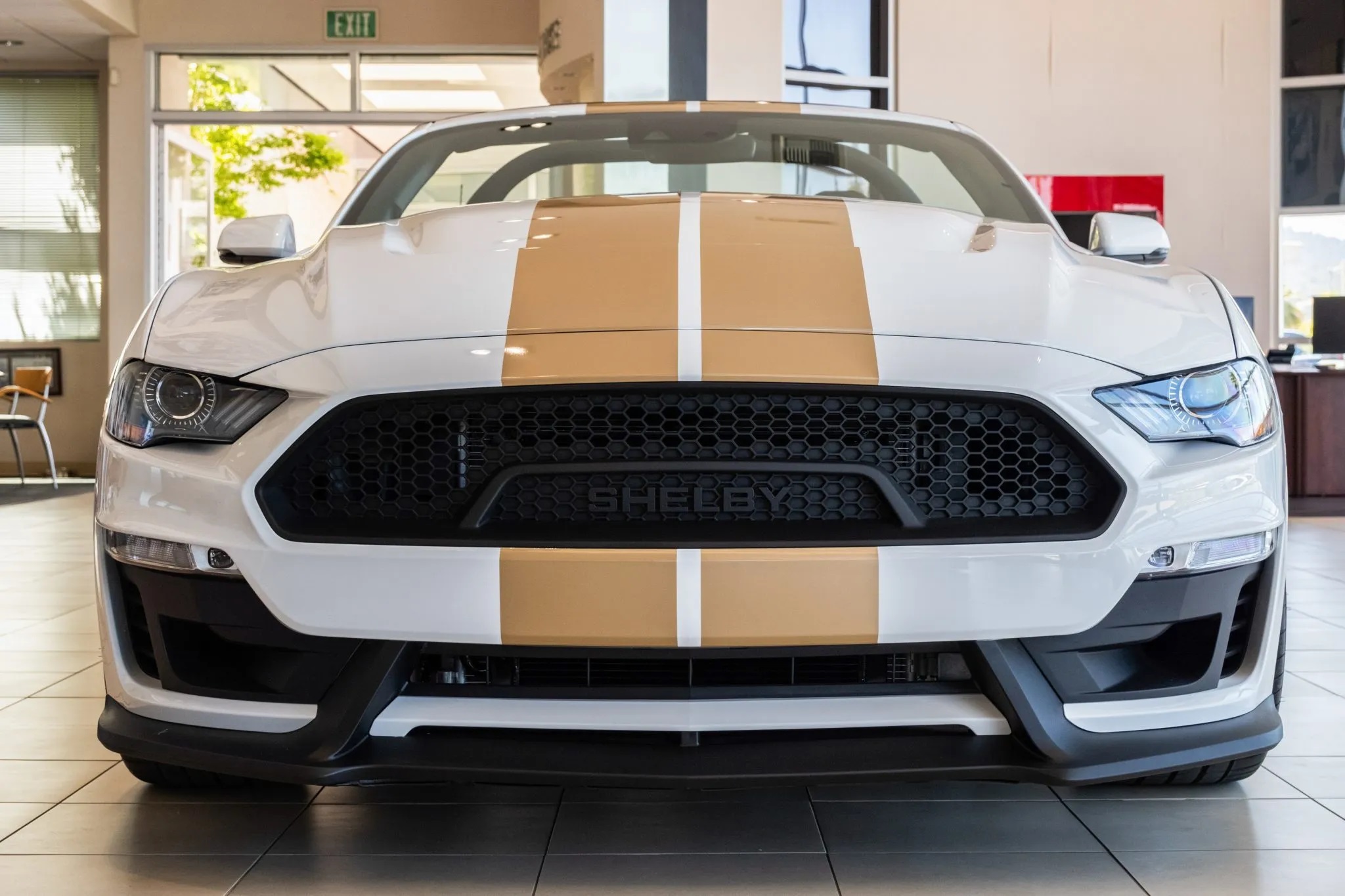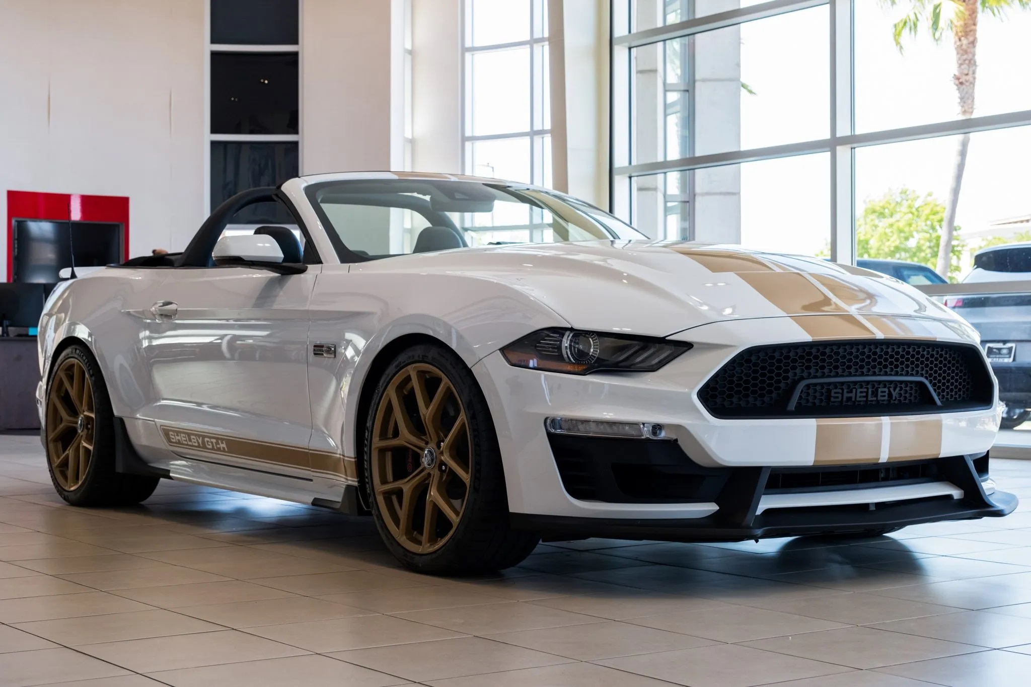 This striking 2019 Ford Mustang Shelby GT-H convertible, a Heritage Edition modified by Shelby American, is finished in Oxford White with gold vinyl accents over an Ebony leather interior. It is now offered for sale on Bring A Trailer with just 199 miles on the odometer.