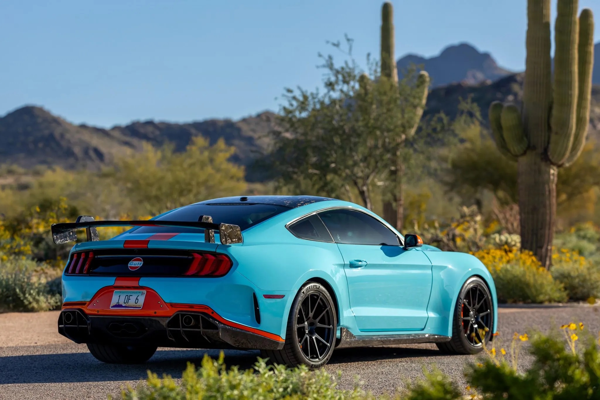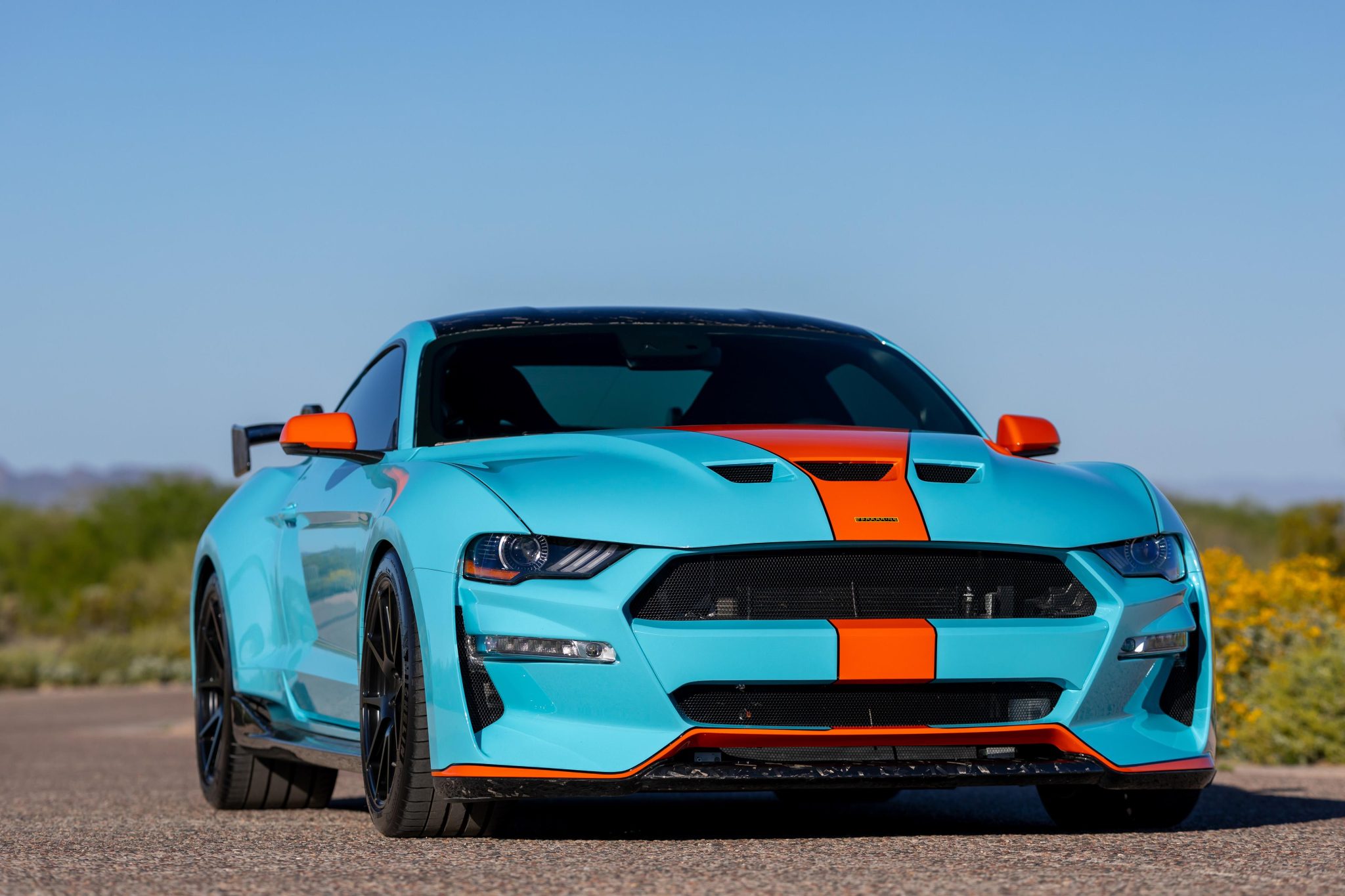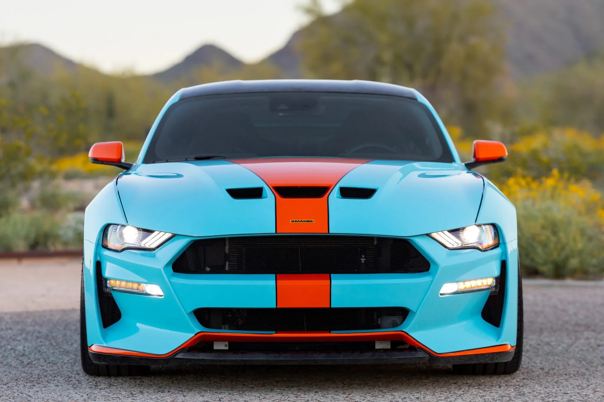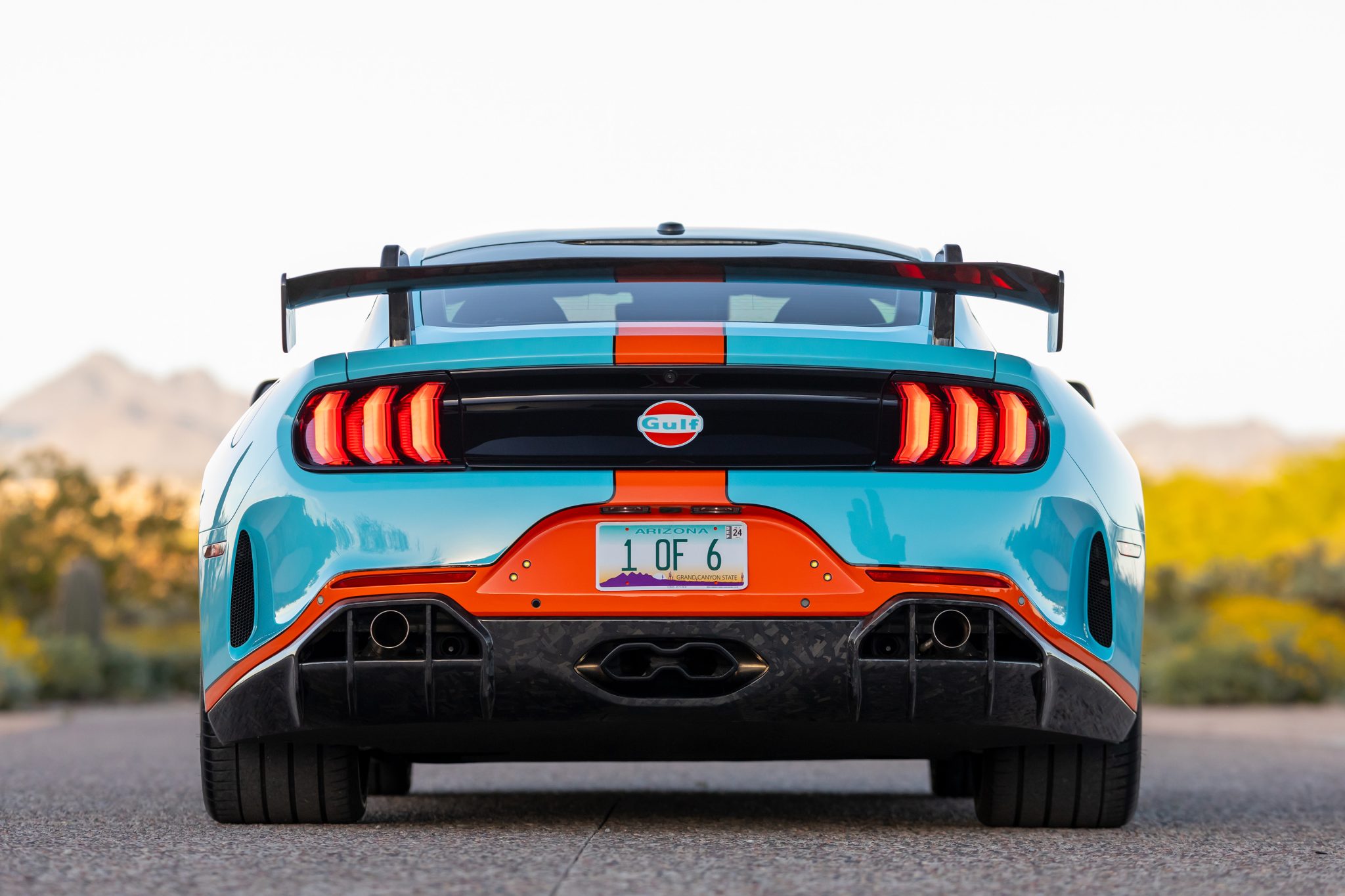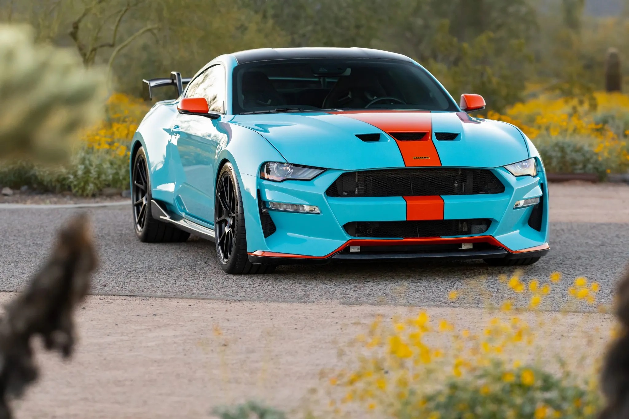The car boasts a Gulf Racing-inspired blue and orange livery. It sits on Peregrine Automotive’s carbon-fiber wide-body panels, including a vented hood, a swan-neck rear wing, a rear diffuser, revised front and rear fascias, unique side skirts, triple exhaust outlets, and revised fenders and quarter panels that are 3 and 6 inches wider than the stock Mustang, respectively.
