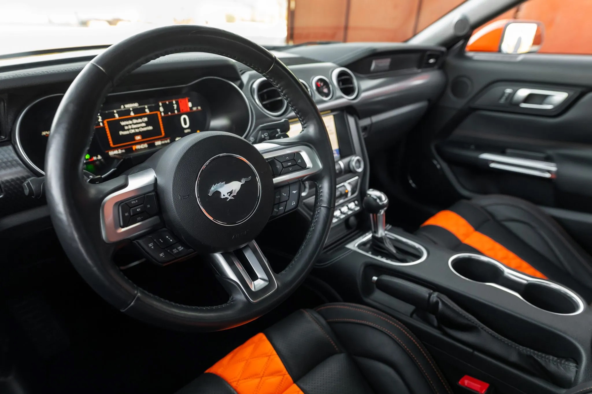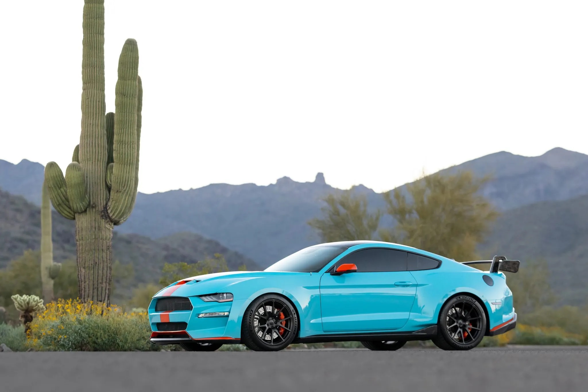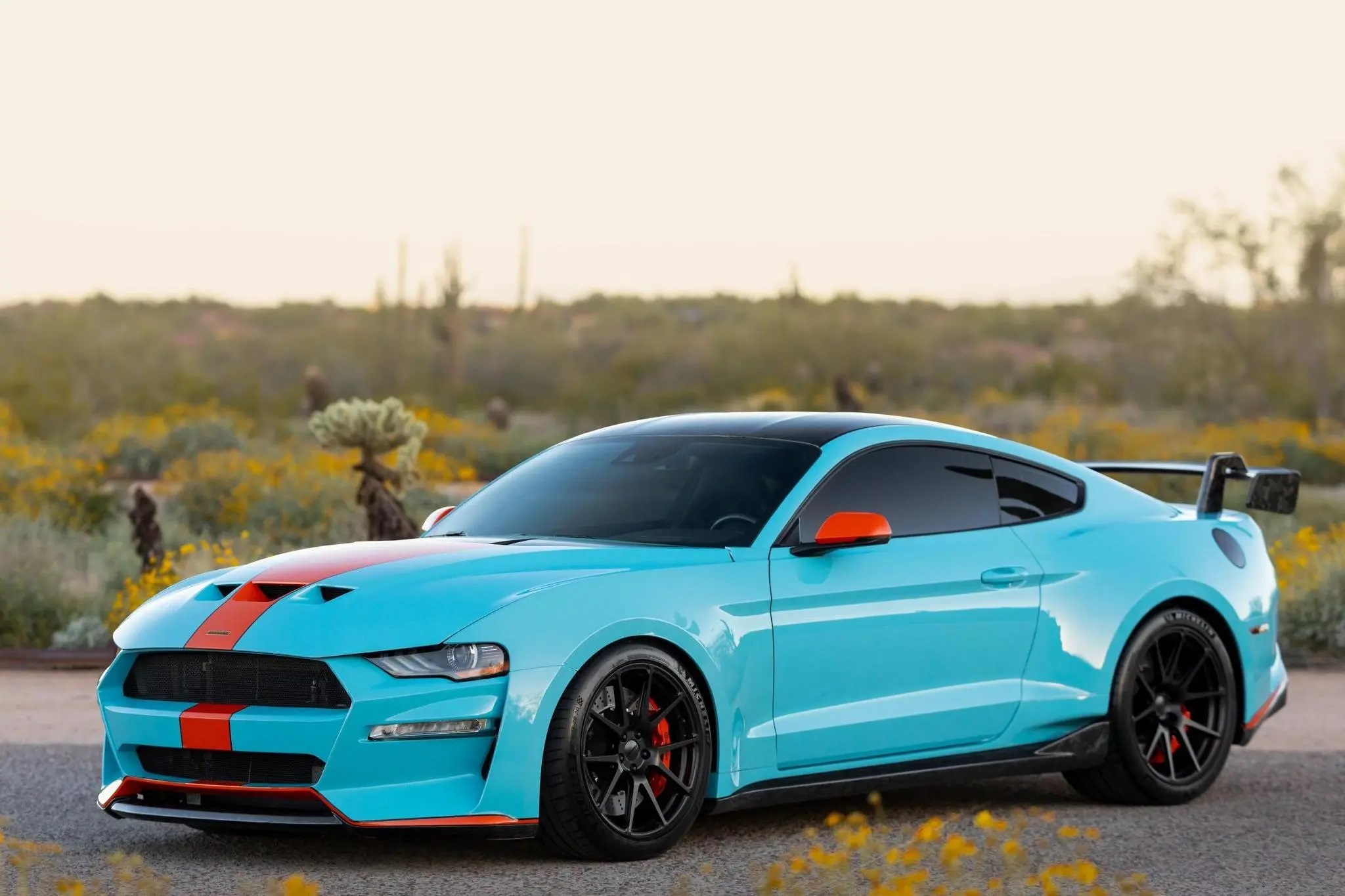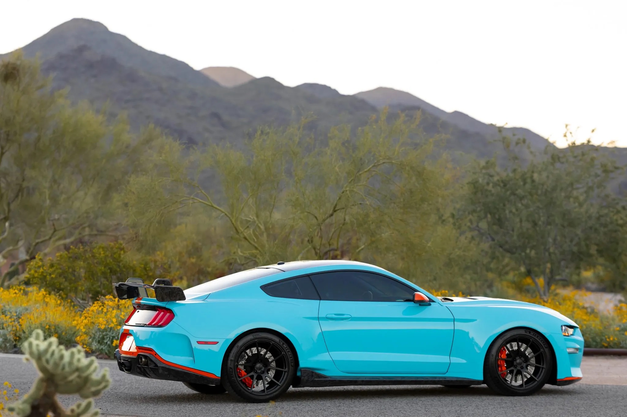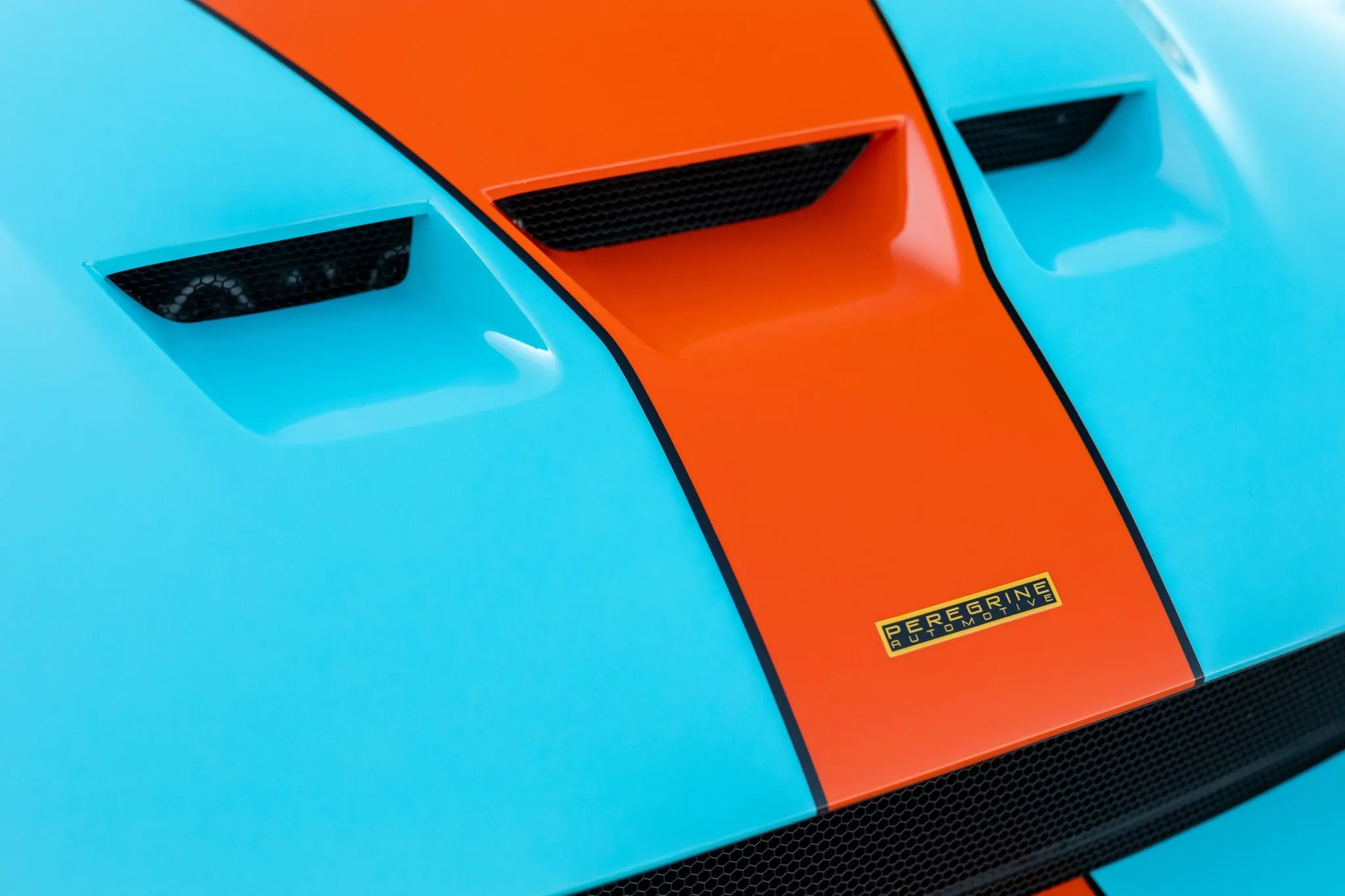 The car boasts a Gulf Racing-inspired blue and orange livery. It sits on Peregrine Automotive’s carbon-fiber wide-body panels, including a vented hood, a swan-neck rear wing, a rear diffuser, revised front and rear fascias, unique side skirts, triple exhaust outlets, and revised fenders and quarter panels that are 3 and 6 inches wider than the stock Mustang, respectively.