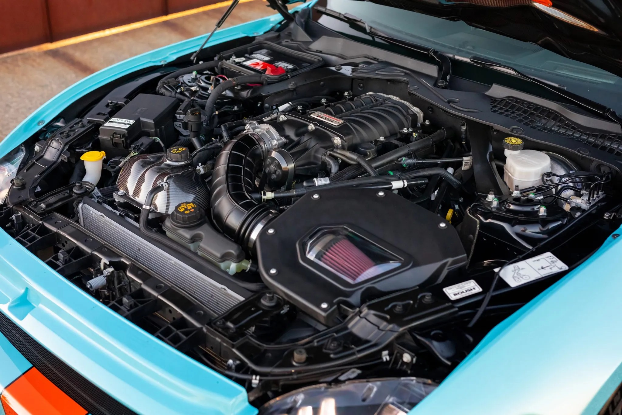 Peregrine Automotive modified the Mustang’s 5.0-liter Coyote V8 with a Roush “Stage 2” supercharger, a billet throttle body, and an oversized air intake with a high-flow filter. They also added high-performance fuel injectors, a revised engine control unit (ECU) tune, and a revised cooling system with an aluminum heat exchanger.
